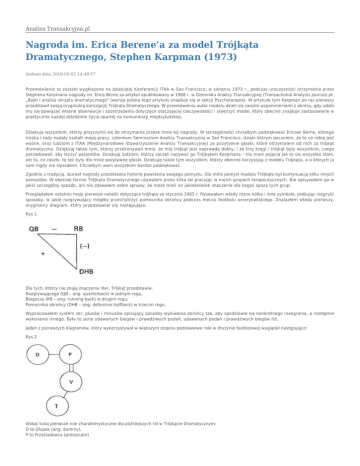 Analiza Transakcyjna.pl Nagroda im. Erica Berene’a za model Trójkąta Dramatycznego, Stephen Karpman (1973) dodano dnia 2010-05-02 14:49:57 Przemówienie to zostało wygłoszone na dziesiątej Konferencji ITAA w San Francisco, w sierpniu 1973 r., podczas uroczystości otrzymania przez Stephena Karpmana nagrody im. Erica Berne za artykuł opublikowany w 1968 r. w Dzienniku Analizy Transakcyjnej (Transactional Analysis Journal) pt. „Bajki i analiza skryptu dramatycznego" (wersja polska tego artykułu znajduje się w sekcji Psychoterapia). W artykule tym Karpman po raz pierwszy przedstawił swoją oryginalną koncepcję Trójkąta Dramatycznego. W przemówieniu autor modelu dzieli się swoimi wspomnieniami z okresu, gdy udało mu się powiązać własne obserwacje i spostrzeżenia dotyczące otaczającej rzeczywistości i stworzyć model, który obecnie znajduje zastosowanie w praktycznie każdej dziedzinie życia opartej na komunikacji międzyludzkiej. Dziękuję wszystkim, którzy przyczynili się do otrzymania przeze mnie tej nagrody. W szczególności chciałbym podziękować Ericowi Berne, którego troska i rady nadały kształt mojej pracy, członkom Seminarium Analizy Transakcyjnej w San Francisco, dzięki którym poczułem, że to co robię jest ważne, oraz ludziom z ITAA (Międzynarodowe Stowarzyszenie Analizy Transakcyjnej) za pozytywne głaski, które otrzymałem od nich za trójkąt dramatyczny. Dziękuję także tym, którzy przekonywali mnie, że mój trójkąt jest naprawdę dobry, i że trzy kręgi i trójkąt były wszystkim, czego potrzebowali, aby leczyć pacjentów. Dziękuję ludziom, którzy zaczęli nazywać go Trójkątem Karpmana – nie mam pojęcia jak to się wszystko stało, ale to, co zaszło, to też były dla mnie pozytywne głaski. Dziekuję także tym wszystkim, którzy obecnie korzystają z modelu Trójkąta, a o których ja sam nigdy nie słyszałem. Chciałbym wam wszystkim bardzo podziękować. Zgodnie z tradycją, laureat nagrody przedstawia historię powstania swojego pomysłu. Dla mnie pomysł modelu Trójkąta był kontynuacją kilku innych pomysłów. W obecnej formie Trójkąta Dramatycznego używałem przez kilka lat pracując w moich grupach terapeutycznych. Nie opisywałem go w jakiś szczególny sposób, ani nie zdawałem sobie sprawy, że może mieć on jakiekolwiek znaczenie dla kogoś spoza tych grup. Przeglądałem ostatnio moje pierwsze notatki dotyczące trójkąta ze stycznia 1965 r. Rysowałem wtedy różne kółka i inne symbole, próbując rozgryźć sposoby, w jakie rozgrywający mógłby przechytrzyć pomocnika obrońcy podczas meczu footbolu amerykańskiego. Znalazłem wtedy pierwszy, oryginalny diagram, który przedstawiał się następująco: Rys 1 Dla tych, którzy nie znają znaczenia liter, Trójkąt przedstawia: Rozgrywającego (QB – ang. quarterback) w jednym rogu, Biegacza (RB – ang. running back) w drugim rogu, Pomocnika obrońcy (DHB – ang. defensive halfback) w trzecim rogu. Wypracowałem system zer, plusów i minusów opisujący sposoby wykiwania obrońcy tak, aby spodziewał się konkretnego rozegrania, a następnie wykonanie innego. Była to seria udawanych biegów i prawdziwych podań, udawanych podań i prawdziwych biegów itd. Jeden z pierwszych diagramów, który wykorzystywał w większym stopniu podstawowe role w drużynie footbolowej wyglądał następująco: Rys 2 Widać tutaj pierwsze role charakterystyczne dla późniejszych ról w Trójkącie Dramatycznym: D to Głupek (ang. dummy), P to Prześladowca (presecutor) + podwójne linie oznaczały oszustwo, V oznaczało Ofiarę (victim), T oznaczało oszusta (trickster). Po narysowaniu tego mogelu siedziałem nad nim jeszcze trochę i wpasowałem w niego podstawowe role ze skryptużyciowego. Próbowałem rozpracować proces pisania scenariuszy telewizyjnych po prostu przez przypisywanie symboli ról poszczególnym osobom, a następnie przenosząc akcję i role do miejsc wziętych z życia. Miałem już wtedy jasność, że to będzie trójkąt. Pewnego razu wpadłem na pomysł, aby kupić sobie dwanaście drewnianych trójkątów do kul bilardowych, napisać P (presecutor – oprawca), R (rescuer – wybawca) i V (victim – ofiara) w każdym rogu, i obracać je przypadkowo na rzędach drewnianych kołków, np. cztery rzędy kołków dla czterech aktów opowieści. Wynik początkowy wyznaczałby to, co dana postać odgrywałaby w następnej scenie. Miałem też inny pomysł, aby rzucać kostki do gry na planszę, na której zaznaczone byłyby różne sytuacje i miejsca, takie jak „odchodzenie od" i „podchodzenie do" danej postaci. Na ściankach kostki wypisane byłyby nazwy postaci, takie jak: oprawca, głupek, oszust, wybawca itd. Dramat pociąga za sobą zmiany zarówno ról jak i miejsc, w których wydarzenia mają miejsce. Diagram Miejsc (lokalizacji) został przedstawiony w artykule „Bajki i analiza skryptu dramatycznego", w którym pojawił się Trójkąt Dramatyczny. Później pracowałem nad następnym pomysłem, gdzie rysowałem na papierze rzędy kwadratów, tak jak na papierze milimetrowym, a następnie wypełniałem je bardziej skomplikowanymi symbolami, które poprzednio wypracowałem. Alfa wyznaczało właściwy początek, haczyk oznaczał kontynuację, „X" reprezentował zamianę, omega była symbolem zakończenia akcji, itd. Brzmi to skomplikowanie, ale byłem w stanie usiąść i narysować coś, z czego można było potem stworzyć pewną historię. To był pierwszy raz, kiedy „X” pojawił się jako symbol oznaczający zmianę i jest on obecnie używany we Wzorze na Grę Psychologiczną. Artykuł „Bajki i analiza skryptu dramatycznego”, który opublikowany został w kwietniu 1968 r. był rozszerzeniem mojej pracy nad koncepcją skryptu dramatycznego. W tym czasie na seminariach w San Francisco pracowaliśmy nad teorią skryptu pod kierownictwem Claude’a Steinera. Wtedy właśnie zauważyłem, że w jego matrycy na