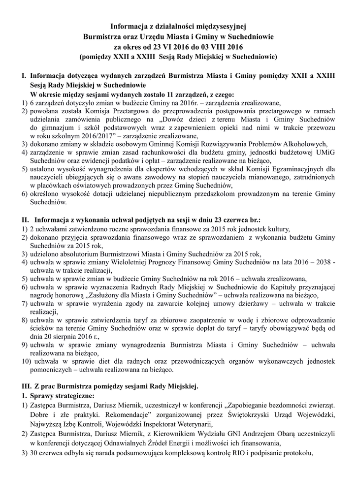 Informacja z działalności międzysesyjnej Burmistrza oraz Urzędu Miasta i Gminy w Suchedniowie za okres od 23 VI 2016 do 03 VIII 2016 (pomiędzy XXII a XXIII Sesją Rady Miejskiej w Suchedniowie) I. Informacja dotycząca wydanych zarządzeń Burmistrza Miasta i Gminy pomiędzy XXII a XXIII Sesją Rady Miejskiej w Suchedniowie W okresie między sesjami wydanych zostało 11 zarządzeń, z czego: 1) 6 zarządzeń dotyczyło zmian w budżecie Gminy na 2016r. – zarządzenia zrealizowane, 2) powołana została Komisja Przetargowa do przeprowadzenia postępowania przetargowego w ramach udzielania zamówienia publicznego na „Dowóz dzieci z terenu Miasta i Gminy Suchedniów do gimnazjum i szkół podstawowych wraz z zapewnieniem opieki nad nimi w trakcie przewozu w roku szkolnym 2016/2017” – zarządzenie zrealizowane, 3) dokonano zmiany w składzie osobowym Gminnej Komisji Rozwiązywania Problemów Alkoholowych, 4) zarządzenie w sprawie zmian zasad rachunkowości dla budżetu gminy, jednostki budżetowej UMiG Suchedniów oraz ewidencji podatków i opłat – zarządzenie realizowane na bieżąco, 5) ustalono wysokość wynagrodzenia dla ekspertów wchodzących w skład Komisji Egzaminacyjnych dla nauczycieli ubiegających się o awans zawodowy na stopień nauczyciela mianowanego, zatrudnionych w placówkach oświatowych prowadzonych przez Gminę Suchedniów, 6) określono wysokość dotacji udzielanej niepublicznym przedszkolom prowadzonym na terenie Gminy Suchedniów. II. Informacja z wykonania uchwał podjętych na sesji w dniu 23 czerwca br.: 1) 2 uchwałami zatwierdzono roczne sprawozdania finansowe za 2015 rok jednostek kultury, 2) dokonano przyjęcia sprawozdania finansowego wraz ze sprawozdaniem z wykonania budżetu Gminy Suchedniów za 2015 rok, 3) udzielono absolutorium Burmistrzowi Miasta i Gminy Suchedniów za 2015 rok, 4) uchwała w sprawie zmiany Wieloletniej Prognozy Finansowej Gminy Suchedniów na lata 2016 – 2038 uchwała w trakcie realizacji, 5) uchwała w sprawie zmian w budżecie Gminy Suchedniów na rok 2016 – uchwała zrealizowana, 6) uchwała w sprawie wyznaczenia Radnych Rady Miejskiej w Suchedniowie do Kapituły przyznającej nagrodę honorową „Zasłużony dla Miasta i Gminy Suchedniów” – uchwała realizowana na bieżąco, 7) uchwała w sprawie wyrażenia zgody na zawarcie kolejnej umowy dzierżawy – uchwała w trakcie realizacji, 8) uchwała w sprawie zatwierdzenia taryf za zbiorowe zaopatrzenie w wodę i zbiorowe odprowadzanie ścieków na terenie Gminy Suchedniów oraz w sprawie dopłat do taryf – taryfy obowiązywać będą od dnia 20 sierpnia 2016 r., 9) uchwała w sprawie zmiany wynagrodzenia Burmistrza Miasta i Gminy Suchedniów – uchwała realizowana na bieżąco, 10) uchwała w sprawie diet dla radnych oraz przewodniczących organów wykonawczych jednostek pomocniczych – uchwała realizowana na bieżąco. III. Z prac Burmistrza pomiędzy sesjami Rady Miejskiej. 1. Sprawy strategiczne: 1) Zastępca Burmistrza, Dariusz Miernik, uczestniczył w konferencji „Zapobieganie bezdomności zwierząt. Dobre i złe praktyki. Rekomendacje” zorganizowanej przez Świętokrzyski Urząd Wojewódzki, Najwyższą Izbę Kontroli, Wojewódzki Inspektorat Weterynarii, 2) Zastępca Burmistrza, Dariusz Miernik, z Kierownikiem Wydziału GNI Andrzejem Obarą uczestniczyli w konferencji dotyczącej Odnawialnych Źródeł Energii i możliwości ich finansowania, 3) 30 czerwca odbyła się narada podsumowująca kompleksową kontrolę RIO i podpisanie protokołu, 4) 30 czerwca 2016 roku w Suchedniowskim Ośrodku Kultury „Kuźnica” odbyło się spotkanie informacyjne Stowarzyszenia Lokalna Grupa Działania Wokół Łysej Góry, dotyczące zasad ubiegania się o dotacje oraz terminów planowanych naborów wniosków, 5) 1 lipca br. Burmistrz Cezary Błach uczestniczył w spotkaniu z mieszkańcami ul. Żeromskiego dotyczącym budowy kanalizacji sanitarnej, 6) Burmistrz Cezary Błach uczestniczył w zgromadzeniu Związku Gmin Gór Świętokrzyskich, 7) 8 lipca 2016 r. Burmistrz Miasta i Gminy Suchedniów zawarł z Wojewodą Świętokrzyskim umowę, na podstawie której Gmina Suchedniów otrzyma dotację w wysokości 109 313,00 zł (50% kosztów kwalifikowanych) na zadanie pn.„Przebudowa ulicy Gajzlera, przebudowa i remont ulicy Kościelnej wraz z budową i przebudową infrastruktury komunalnej w miejscowości Suchedniów”, 8) 8 lipca 2016 r. w siedzibie Wojewódzkiego Funduszu Ochrony Środowiska i Gospodarki Wodnej w Kielcach została podpisana umowa dotacji pomiędzy Gminą Suchedniów, a WFOŚiGW w Kielcach. Umowa dotyczy zadania Usuwania odpadów zawierających azbest pochodzący z budynków mieszkalnych i gospodarskich z terenu Gminy Suchedniów w 2016 roku. Całkowity koszt zadania to 23.328,00 zł, 9) 14 lipca Burmistrz spotkał się ze starostą skarżyskim, Jerzym Żmijewskim, oraz Markiem Czyżem, dyrektorem Zarządu Dróg Powiatu, w sprawie inwestycji drogowej i kanalizacyjnej na ul. Żeromskiego, 10) 15 lipca odbyło się spotkanie w sprawie budowy drogi łączącej ulice Langiewicza i Leśną z udziałem Poseł na Sejm RP Marii Zuby, przedstawicieli PKP PLK i władz miasta, 11) 27 lipca Zastępca Burmistrza uczestniczył w spotkaniu mającym na celu omówienie zakresu współpracy Szpitala Powiatowego w Skarżysku-Kamiennej, 12) 3 sierpnia Burmistrz wziął udział w spotkaniu Wicepremierem, Ministrem Rozwoju Mateuszem Morawieckim. Tematem spotkania była prezentacja założeń „Planu na rzecz Odpowiedzialnego Rozwoju” oraz wizji rozwoju regionu świętokrzyskiego, 13) 3 sierpnia Burmistrz spotkał się z Dyrektorem Świętokrzyskiego Zarządu Dróg Wojewódzkich Damianem Urbanowskim w sprawie projektowanej przebudowy drogi wojewódzkiej nr 751. 2. Udział Burmistrza w uroczystościach/wydarzeniach sportowych/kulturalnych/akcjach społecznych: 1) 26 czerwca Z-ca Burmistrza wraz z Radnym Krzysztofem Adamcem wzięli udział w uroczystości