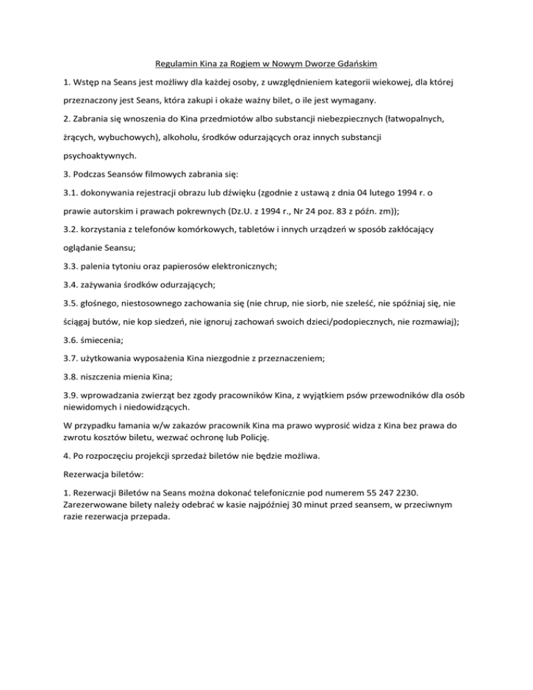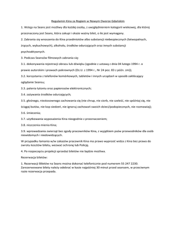 Regulamin Kina za Rogiem w Nowym Dworze Gdańskim 1. Wstęp na Seans jest możliwy dla każdej osoby, z uwzględnieniem kategorii wiekowej, dla której przeznaczony jest Seans, która zakupi i okaże ważny bilet, o ile jest wymagany. 2. Zabrania się wnoszenia do Kina przedmiotów albo substancji niebezpiecznych (łatwopalnych, żrących, wybuchowych), alkoholu, środków odurzających oraz innych substancji psychoaktywnych. 3. Podczas Seansów filmowych zabrania się: 3.1. dokonywania rejestracji obrazu lub dźwięku (zgodnie z ustawą z dnia 04 lutego 1994 r. o prawie autorskim i prawach pokrewnych (Dz.U. z 1994 r., Nr 24 poz. 83 z późn. zm)); 3.2. korzystania z telefonów komórkowych, tabletów i innych urządzeń w sposób zakłócający oglądanie Seansu; 3.3. palenia tytoniu oraz papierosów elektronicznych; 3.4. zażywania środków odurzających; 3.5. głośnego, niestosownego zachowania się (nie chrup, nie siorb, nie szeleść, nie spóźniaj się, nie ściągaj butów, nie kop siedzeń, nie ignoruj zachowań swoich dzieci/podopiecznych, nie rozmawiaj); 3.6. śmiecenia; 3.7. użytkowania wyposażenia Kina niezgodnie z przeznaczeniem; 3.8. niszczenia mienia Kina; 3.9. wprowadzania zwierząt bez zgody pracowników Kina, z wyjątkiem psów przewodników dla osób niewidomych i niedowidzących. W przypadku łamania w/w zakazów pracownik Kina ma prawo wyprosić widza z Kina bez prawa do zwrotu kosztów biletu, wezwać ochronę lub Policję. 4. Po rozpoczęciu projekcji sprzedaż biletów nie będzie możliwa. Rezerwacja biletów: 1. Rezerwacji Biletów na Seans można dokonać telefonicznie pod numerem 55 247 2230. Zarezerwowane bilety należy odebrać w kasie najpóźniej 30 minut przed seansem, w przeciwnym razie rezerwacja przepada.