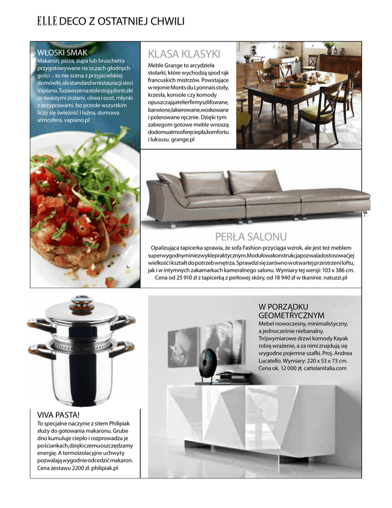 DECO Z ostatniej chwili WŁOSKI SMAK Makaron, pizza, zupa lub bruschetta przygotowywane na oczach głodnych gości – to nie scena z przyjacielskiej domówki, ale standard w restauracji sieci Vapiano.Tuzawszena stolestojądoniczki ze świeżymi ziołami, oliwa i ocet, młynki z przyprawami, bo przede wszystkim liczy się świeżość i luźna, domowa atmosfera. vapiano.pl klasa klasyki Meble Grange to arcydzieła stolarki, które wychodzą spod rąk francuskich mistrzów. Powstające w rejonie Monts du Lyonnais stoły, krzesła, konsole czy komody opuszczająatelierfirmyszlifowane, barwione,lakierowane,woskowane i polerowane ręcznie. Dzięki tym zabiegom gotowe meble wnoszą dodomuatmosferęciepła,komfortu i luksusu. grange.pl PERŁA SALONU Opalizująca tapicerka sprawia, że sofa Fashion przyciąga wzrok, ale jest też meblem superwygodnyminiezwyklepraktycznym.Modułowakonstrukcjapozwaladostosowaćjej wielkość i kształt do potrzeb wnętrza. Sprawdzi się zarówno w otwartej przestrzeni loftu, jak i w intymnych zakamarkach kameralnego salonu. Wymiary tej wersji: 103 x 386 cm. Cena od 25 910 zł z tapicerką z perłowej skóry, od 18 940 zł w tkaninie. natuzzi.pl w porządku geometrycznym Mebel nowoczesny, minimalistyczny, a jednocześnie niebanalny. Trójwymiarowe drzwi komody Kayak robią wrażenie, a za nimi znajdują się wygodne pojemne szafki. Proj. Andrea Lucatello. Wymiary: 220 x 53 x 73 cm. Cena ok. 12 000 zł. cattelanitalia.com viva pasta! To specjalne naczynie z sitem Philipiak służy do gotowania makaronu. Grube dno kumuluje ciepło i rozprowadza je po ściankach,dziękiczemuoszczędzamy energię. A termoizolacyjne uchwyty pozwalają wygodnie odcedzić makaron. Cena zestawu 2200 zł. philipiak.pl DECO z ostatniej chwili zyski z ekologii design do usług Na nowym warszawskim osiedlu Feliz Residence zamontowano m.in. kolektory słoneczne i panele fotowoltaiczne, które zamieniają energię słoneczną na elektryczną, a także zbiornik na wodę deszczową, której potem używa się do celów gospodarczych. orcogroup.pl WielofunkcyjnymebelBennypotrafiwkilkasekund zmienić się z eleganckiego fotela w komfortową leżankę, a po kolejnej chwili w zgrabne łóżko. Szyku dodaje mu vintage’owa obrotowa podstawa. bonaldo.pl elegancka garderoba szklane motyle Stoliki Aurora i Narcisio mają niezwykle wdzięczną formę. Szklane tafle blatów przypominające czarne motyle i kwiaty będą idealne na mocną kawę i lekki deser. Zostały zaprojektowane przez Chiarę Lampugnani i wykonane we włoskiej manufakturze Fiam Italia. Wymiary: większy 80 x 50 x 45 cm, mniejszy 66,9 x 42 x 35 cm. fiamitalia.it Jeśli dbasz o swoje eleganckie ubrania, zadbaj również o odpowiednie miejsce do ich przechowywania. Najbardziej wygodnie i przewiewnie będzie im w przestronnej zabudowie ulokowanej w garderobie lub sypialni. Tę wykonała firma Komandorz aluminiowychprofili i płyt w odcieniu ciemnej limby. Ok. 3000 zł (z montażem). komandor.pl słodki złotousty Kolekcja sprzętów Miele Fire & Ice tokuchennabiżuteria.Dosłownie, bo urządzenia do zabudowy są wykończonezłotemlubchromem. Polacymogąjezamówićjakojedni z pierwszych na świecie. miele.pl Magnum Gold to pierwsze w historii lody w kolorze złota! Ten cenny waniliowy rarytas z karmelowym nadzieniem zamknięto w skorupce z czekolady pokrytej złocistą polewą. Choć łudząco przypomina szlachetny kruszec, jest całkowicie jadalna. Cena 4 zł. algida.pl r e k l a m a jubilerska robota TEKST JUDYTA SAWICKA; ZDJĘCIA MATERIAŁY PRASOWE r e k l a m a