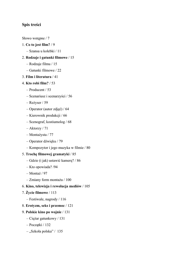 Spis treści Słowo wstępne / 7 1. Co to jest film? / 9 – Szansa u kolebki / 11 2. Rodzaje i gatunki filmowe / 15 – Rodzaje filmu / 15 – Gatunki filmowe / 22 3. Film i literatura / 41 4. Kto robi film? / 53 – Producent / 53 – Scenariusz i scenarzyści / 56 – Reżyser / 59 – Operator (autor zdjęć) / 64 – Kierownik produkcji / 66 – Scenograf, kostiumolog / 68 – Aktorzy / 71 – Montażysta / 77 – Operator dźwięku / 79 – Kompozytor i jego muzyka w filmie / 80 5. Trochę filmowej gramatyki / 85 – Gdzie (i jak) ustawić kamerę? / 86 – Kto opowiada? /94 – Montaż / 97 – Zmiany form montażu / 100 6. Kino, telewizja i rewolucja mediów / 105 7. Życie filmowe / 113 – Festiwale, nagrody / 116 8. Erotyzm, seks i przemoc / 121 9. Polskie kino po wojnie / 131 – Ciężar gatunkowy / 131 – Początki / 132 – „Szkoła polska” / 135 – Regres czasów stabilizacji / 141 – Moralne i społeczne niepokoje / 147 – Kino stanu powojennego / 151 – Dzień dzisiejszy / 152 10. Aneks / 161 – Lawa, czyli filmowe Dziady / 161 – Pisarz i reżyser / 161 – Dziady i styl Konwickiego / 162 – Całe Dziady / 162 – Zasady kompozycyjne / 163 – Dwóch Konradów / 164 – Długie życie Dziadów / 165 – Zło naszych czasów / 167 – Ogień i lawa / 168 – Wesele na ekranie / 169 – Scenariusz / 172 – Filmowy kształt dramatu / 173 – Realizm i fantastyka / 176 – Interpretacja / 179 Słownik wymienionych w tekście reżyserów filmowych / 183 Indeks / 205