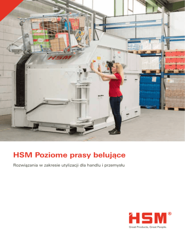 HSM Poziome prasy belujące Rozwiązania w zakresie utylizacji dla handlu i przemysłu Redukcja objętości nawet o 95% Uzyskiwanie łatwo zbywalnych bel Ograniczanie kosztów związanych z odpadami poprzez redukcję ich objętości! Prasy belujące HSM zmniejszają objętość gromadzonych wtórnych, które można z powodzeniem włączyć do obiegu w Państwa zakładzie odpadów opakowaniowych nawet recyklingowego. Ponadto bele o odpowiednio dużej wadze o 95 %! Pozwala to na ekonomiczne wykorzystanie powierz- mają wyższą wartość rynkową. Skutkiem tego może być chni, którą zajmują objętościowe opakowania. Uzyskują nie tylko wyeliminowanie kosztów związanych z utylizacją Państwo przy tym czyste materiałowo bele surowców odpadów, ale także osiąganie dodatkowych przychodów. Jakość HSM ma solidne podstawy: znak „Made in Germany“. Firma HSM od początku swojej działalności szczególną Istotny powód, dla którego produkcja HSM zlokalizowana uwagę poświęca kwestii jakości. Zasada ta odgrywa jest właśnie w Niemczech to świadomość odpowiedzialności decydującą rolę na wszystkich etapach, od projektowania przedsiębiorstwa zakorzenionego w regionie. We wszystkich nowych maszyn, poprzez ich produkcję, aż po serwis. Wszy- zakładach HSM zmotywowani i dobrze wykształceni pracow- stkie zakłady HSM uzyskały certyfikaty wg DIN EN ISO 9001, nicy stale potwierdzają zasadność takiego działania. a wytwarzając trwałe, niezawodne produkty dążą do wzmocnienia pozycji rynkowej belownic HSM teraz i w przyszłości. Różnorodne możliwości zastosowania belownic poziomych HSM: Karton Opony samochodowe Butelki PET Inne materiały na zapytanie. Materiały piankowe 022 Twarde tworzywa sztuczne Folia Zalety i cechy szczególne: Zalety: Charakterystyka techniczna: Błyskawiczna redukcja objętości wszelkich materiałów opako- Długi okres eksploatacji dzięki trwałemu napędowi elektrohy- waniowych nawet o 95 % ! Obszary zastosowania: handel hurtowy, zakłady przemysłowe, draulicznemu Wysoka wydajność dzięki dużemu otworowi załadowczemu firmy logistyczne, magazyny centralne, zakłady papiernicze, Niskie koszty eksploatacji dzięki niewymagającej częstej konser- drukarnie, centra dystrubucyjne, wielkopowierzchniowe sklepy wacji hydraulice spożywcze Bezproblemowy przebieg procesu zgniatania dzięki prowadzeMateriały: papier, karton, folie, rozprężliwe materiały piankowe, niu płyty prasującej na łożyskach tocznych styropian, obudowy z tworzyw sztucznych, wiadra blaszane, beczki, opony samochodowe i wiele innych Siła zgniotu: od 80 kN do 700 kN Waga beli: do 850 kg Mała wysokość, duży otwór załadowczy odpowiedni także dla materiałów wielkogabarytowych Komfortowa obsługa za pomocą klawiatury membranowej Optymalne zagęszczenie dzięki pazurom w komorze prasy przytrzymującym zgniatany materiał Na życzenie dostępna opcja workowania beli Napełnianie ręczne lub automatyczne Wiązanie beli ręczne taśmą poliestrową lub drutem 03 Mała, ale jaka! Mobilna prasa do dużych kartonów! HSM 8 TE HSM 12 Gigant Jeśli chodzi o wydajność, ekonomiczność i użyteczność nasza Wszędzie tam, gdzie występują kartony o dużych rozmiarach mała, mobilna prasa HSM 8 TE nie ma sobie równych. Także lub większe ilości folii wzgl. innych materiałów prasa belująca dzięki jej niezwykle prostej obsłudze: wystarczy założyć taśmę HSM 12 Gigant jest optymalnym rozwiązaniem. wiążącą, włączyć urządzenie i gotowe. Wiązanie i wyrzut beli Dzięki dużemu otworowi załadowczemu można ją łatwo i wy- również nie nastręczają nikomu żadnych problemów. Zwarte godnie napełniać. Rezultatem są zwarte, łatwe do przetrans- bele bezpośrednio z maszyny są wyrzucane na paletę i mogą portowania bele. być łatwo odtransportowane na miejsce składowania. A jeśli prasa nagle potrzebna jest w innym miejscu w firmie - to żaden problem: dzięki czterem kółkom jezdnym jest ona Automatyczny ruch powrotny płyty prasującej po procesie mobilna i gotowa do przemieszczenia w każdej chwili. zgniatania Zabepieczenie klapy otworu załadowczego podczas procesu Chromowane tłoczyska gwarantują długi okres eksploatacji Hydrauliczna przeciwpłyta umożliwia najwyższy komfort prasowania za pomocą kodowanego przełącznika magnety- cznego i bezpieczeństwo obsługi Efektywny sposób wiązania taśmą poliestrową Szybkie, wygodne 3-krotne wiązanie beli taśmą poliestrową Elektrycznie zabezpieczone drzwi odbioru beli z automa- Całkowite wypchnięcie beli przy pełnym wysunięciu płyty tycznym odciążeniem beli dla najwyższego bepieczeństwa prasującej obsługi 600 mm 505 mm 645 mm 500 mm Model 800 mm 900 mm HSM 8 TE HSM 12 Gigant Siła zgniotu w kN 80 140 Silnik w kW 4 7,5 Napięcie / częstotliwość 3 x 400 V / 50 Hz 3 x 400 V / 50 Hz Otwór załadowczy szer. x dł. w mm 645 x 730 800 x 1200 Wysokość napełniania w mm 690 780 Waga beli w kg, zależnie od materiału do 70 do 150 Max. wymiary beli szer. x wys. x dł. w mm 645 x 505 x 500 800 x 600 x 900 Wydajność godzinowa w belach 4-7 3-7 Czas cyklu przy pracy jałowej (teor.) w sek. 21 30 Wymiary maszyny dł. x szer. x wys. w mm 2520 x 780 x 850 4300 x 1030 x 1630 Waga maszyny w kg 590 1280 Wiązanie 3-krotne taśmą poliestrową 3-krotne taśmą poliestrową Wszystkie dane techniczne i wymiary są orientacyjne. Zastrzega się możliwość zmian wyglądu i parametrów technicznych. 04 Jednym słowem: „mocna“! HSM HL 1615 Ta zaprojektowana specjalnie do dużych obciążeń i wszech- Wysoka wydajność dzięki dużemu, dzielonemu otworowi stronnego zastosowania belownica stacjonarna zgniata załadowczemu oprócz odpadów papierowych, dużych kartonów, folii Chromowane tłoczyska gwarantują długi okres eksploata- i innych porównywalnych materiałów także sztywne puszki po farbach i beczki z lekkiej blachy (do 200 l). Aby nawet skrajnie asymetryczne obciążenie w k