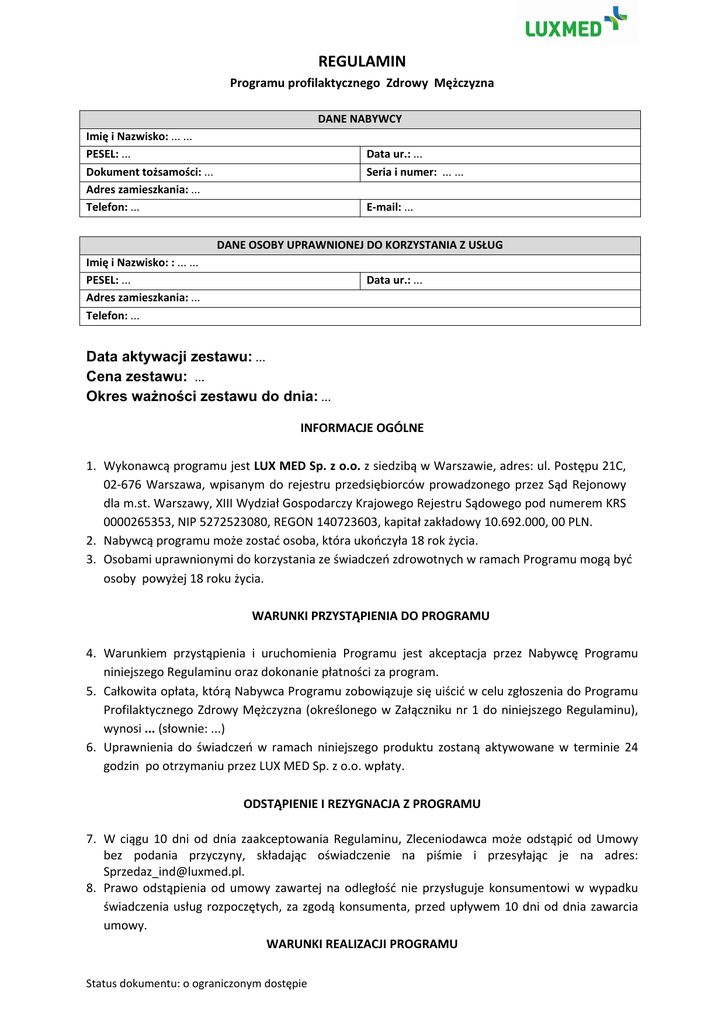 REGULAMIN Programu profilaktycznego Zdrowy Mężczyzna DANE NABYWCY Imię i Nazwisko: ... ... PESEL: ... Dokument tożsamości: ... Adres zamieszkania: ... Telefon: ... Data ur.: ... Seria i numer: ... ... E-mail: ... DANE OSOBY UPRAWNIONEJ DO KORZYSTANIA Z USŁUG Imię i Nazwisko: : ... ... PESEL: ... Adres zamieszkania: ... Telefon: ... Data ur.: ... Data aktywacji zestawu: ... Cena zestawu: ... Okres ważności zestawu do dnia: ... INFORMACJE OGÓLNE 1. Wykonawcą programu jest LUX MED Sp. z o.o. z siedzibą w Warszawie, adres: ul. Postępu 21C, 02-676 Warszawa, wpisanym do rejestru przedsiębiorców prowadzonego przez Sąd Rejonowy dla m.st. Warszawy, XIII Wydział Gospodarczy Krajowego Rejestru Sądowego pod numerem KRS 0000265353, NIP 5272523080, REGON 140723603, kapitał zakładowy 10.692.000, 00 PLN. 2. Nabywcą programu może zostać osoba, która ukończyła 18 rok życia. 3. Osobami uprawnionymi do korzystania ze świadczeń zdrowotnych w ramach Programu mogą być osoby powyżej 18 roku życia. WARUNKI PRZYSTĄPIENIA DO PROGRAMU 4. Warunkiem przystąpienia i uruchomienia Programu jest akceptacja przez Nabywcę Programu niniejszego Regulaminu oraz dokonanie płatności za program. 5. Całkowita opłata, którą Nabywca Programu zobowiązuje się uiścić w celu zgłoszenia do Programu Profilaktycznego Zdrowy Mężczyzna (określonego w Załączniku nr 1 do niniejszego Regulaminu), wynosi ... (słownie: ...) 6. Uprawnienia do świadczeń w ramach niniejszego produktu zostaną aktywowane w terminie 24 godzin po otrzymaniu przez LUX MED Sp. z o.o. wpłaty. ODSTĄPIENIE I REZYGNACJA Z PROGRAMU 7. W ciągu 10 dni od dnia zaakceptowania Regulaminu, Zleceniodawca może odstąpić od Umowy bez podania przyczyny, składając oświadczenie na piśmie i przesyłając je na adres: [email protected]. 8. Prawo odstąpienia od umowy zawartej na odległość nie przysługuje konsumentowi w wypadku świadczenia usług rozpoczętych, za zgodą konsumenta, przed upływem 10 dni od dnia zawarcia umowy. WARUNKI REALIZACJI PROGRAMU Status dokumentu: o ograniczonym dostępie REGULAMIN Programu profilaktycznego Zdrowy Mężczyzna 9. Obsługa w ramach Programu odbywa się we wszystkich placówkach własnych LUX MED i Medycyna Rodzinna. 10.Zakres usług zakupionych w zestawie można wykonać jednorazowo. 11.Program można zrealizować w ciągu 3 miesięcy od dnia aktywowania uprawnień. 12.Warunkiem udzielenia świadczenia w ramach Programu jest uprzednie uzgodnienie jego terminu. Termin udzielenia świadczenia w Centrach Medycznych uzgodnić należy z personelem recepcji odpowiedniej przychodni osobiście lub telefonicznie pod numerem ogólnopolskiej rezerwacji wizyt i badań (22) 458 70 70, (22) 332 28 66. KONTAKT I REKLAMACJE 13.Reklamacje przyjmowane są wyłącznie w formie pisemnej. 14.Reklamacje dotyczące obsługi rozpatrywane są w ciągu 5 dni roboczych, reklamacje dotyczące kwestii medycznych rozpatrywane są w ciągu 14 dni roboczych od daty wpływu wszystkich danych niezbędnych do rozpatrzenia reklamacji na adres: LUX MED Sp. z o.o. Departament Obsługi Klienta Dział Zarządzania Reklamacjami Ul. Postępu 21c 02-676 Warszawa lub na adres poczty elektronicznej: [email protected] POSTANOWIENIA KOŃCOWE 15.Nie ma możliwości cesji programu profilaktycznego na inną osobę. 16.Zakup Programu oraz korzystanie ze świadczeń zdrowotnych w ramach Programu nie łączy się z żadnymi innymi promocjami ani rabatami na jakiekolwiek usługi . 17. Integralną część Regulaminu stanowi załącznik nr 1 Status dokumentu: o ograniczonym dostępie REGULAMIN Programu profilaktycznego Zdrowy Mężczyzna Załącznik nr 1 W skład programu wchodzą następujące świadczenia: Konsultacja internistyczna – zebranie wywiadu zdrowotnego Badania Laboratoryjne i Diagnostyczne: OB. Morfologia + płytki (rozmaz automatyczny) Glukoza – badanie glukometrem Cholesterol całkowity Cholesterol HDL PSA (po 40 r.ż.) TSH HBs Ag/antygen HCV Ab/przeciwciała Badanie ogólne moczu +osad Kał na krew utajoną Inne badania: RTG klatki piersiowej PA USG gruczołu krokowego przez powłoki brzuszne USG jamy brzusznej i przestrzeni zaotrzewnowej EKG spoczynkowe Konsultacje lekarzy specjalistów: Konsultacja – stomatolog (przegląd) Konsultacja – okulista Konsultacja – urolog (po 40 r.ż) Konsultacja – kardiolog Konsultacja internistyczna – wizyta zmykająca program Status dokumentu: o ograniczonym dostępie