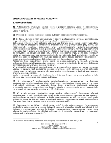 UDZIAŁ SPOŁECZNY W PRAWIE KRAJOWYM 1. UWAGI OGÓLNE 1) Podstawowym kryterium, według którego przepisy regulują udział w postępowaniu administracyjnym jest rodzaj interesu, który ma być realizowany przez podmiot biorący udział w sprawie. 2) Wyróżnia się interes faktyczny, interes publiczny (społeczny) i interes prawny. 3) Od tego, któremu z nich ustawodawca w danym postępowaniu przyznaje prymat zależy krąg podmiotów, które mogą brać czynny udział w postępowaniu. Dokonując wyboru w tym zakresie ustawodawca kieruje się z jednej strony względami tzw. ekonomiki procesowej (możliwość zrealizowania celu postępowania przy użyciu jak najprostszych środków prawnych) oraz uwarunkowaniami prawno-systemowymi (konieczność dania ochrony innym podmiotom, zagwarantowanej w innych przepisach prawa krajowego lub w prawie wspólnotowym). Jeżeli z charakteru danego postępowania wynika, że korzystnie na osiągnięcie jego celu wpłynie ograniczenia kręgu podmiotów biorących udział w postępowania, bez zasadniczej szkody dla interesów tych podmiotów,, to się go ogranicza, jeśli cel postępowania wymaga poddania danej decyzji szerokim konsultacjom – to wprowadza się mechanizmy, które stwarzają tym konsultacjom ramy prawne. Najszerszy krąg uczestników bierze udział w postępowaniach, w których wystarczy wykazanie interesu faktycznego (w praktyce – czynne przystąpienie do sprawy, dokonanie czynności procesowych, np. złożenie wniosku). W większości postępowań administracyjnych wyznacznikiem prawa do brania czynnego udziału w sprawie jest posiadanie interesu prawnego, czyli istnienie prawnej zależności między naszym własnym prawem lub obowiązkiem (wynikającym z konkretnego przepisu prawa), a postępowaniem. Udział organizacji społecznych działających w interesie innym, niż prawny zależy z kolei od tego, czy reprezentują one interes publiczny. 4) W „klasycznym” postępowaniu administracyjnym, uregulowanym w kodeksie postępowania administracyjnego biorą udział strony (posiadające interes prawny), a mogą brać udział uczestnicy na prawach strony (min. organizacje społeczne), działający w interesie społecznym (publicznym). Zasady udziału w postępowaniu stron i uczestników na prawach strony regulują przepisy art. 28 – 34 k.p.a. 5) W prawie ochrony środowiska obok modelu „klasycznego” funkcjonują również postępowania, w których udział może wziąć każdy zainteresowany (postępowania z udziałem społeczeństwa w sensie ścisłym), a także postępowania, w których mogą brać udział wyłącznie strony (w których udział organizacji społecznych reprezentujących społeczeństwo (pars pro toto) jest wyłączony mocą przepisów szczególnych). 6) Postępowania, w których udział może wziąć każdy zainteresowany (postępowania z udziałem społeczeństwa w sensie ścisłym) „stanowi integralny aspekt demokracji i jest jednym z podstawowych elementów budowy społeczeństwa obywatelskiego, czemu służy włączanie społeczeństwa do działań politycznych i procesów decyzyjnych w sprawach związanych z ochroną środowiska”1. 1 Z. Bukowski, Prawo ochrony środowiska Unii Europejskiej, Wydawnictwo C.H. Beck 2007, s. 55. 1 Stan prawny – 15 listopada 2008 r. Adam Juchnik KOWALEWSKI – MIARA – PCHAŁEK KANCELARIA DORADZTWA PRAWNEGO I GOSPODARCZEGO 7) W sensie ścisłym udział społeczny polega na stworzeniu prawnej możliwości uczestnictwa w specjalnym postępowaniu toczącym się w ramach postępowania administracyjnego (w przypadku decyzji administracyjnych) lub legislacyjnego (w przypadku planów i programów) podmiotowi, który nie musi wykazywać żadnego interesu i ma prawo składania uwag i wniosków. W sensie szerokim – udział społeczny to także udział w postępowaniu podmiotów występujących w interesie publicznym oraz udział stron postępowania (legitymujących się interesem prawnym). 2 Stan prawny – 15 listopada 2008 r. Adam Juchnik KOWALEWSKI – MIARA – PCHAŁEK KANCELARIA DORADZTWA PRAWNEGO I GOSPODARCZEGO 2. POSTĘPOWANIA, W KTÓRYCH UDZIAŁ MOŻE BRAĆ KAŻDY ZAINTERESOWANY 1) Każdy może wziąć udział w postępowaniu z udziałem społeczeństwa, o którym mowa w art. 29 – 44 ustawy o udostępnianiu informacji o środowisku i jego ochronie, udziale społeczeństwa w ochronie środowiska oraz o ocenach oddziaływania na środowisko2. Ustawa reguluje postępowanie z udziałem społeczeństwa w osobnym Dziale III zatytułowanym „Udział społeczeństwa w ochronie środowiska”, składającym się z czterech rozdziałów. Pierwszy rozdział zawiera przepisy ogólne, mające zastosowanie do wszystkich pozostałych postępowań uregulowanych w tym dziale. Dalsze rozdziały regulują kolejno: udział społeczeństwa w podejmowaniu decyzji (Rozdział 2, przepisy art. 33 – 38), udział społeczeństwa w opracowywaniu dokumentów (Rozdział 3, przepisy art. 39 - 43) oraz uprawnienia organizacji ekologicznych (Rozdział 4, art. 44). a) Postępowanie z udziałem społeczeństwa prowadzi się przed wydaniem decyzji wymagających udziału społeczeństwa, jeśli przepis szczególny, regulujący procedurę wydawania danej decyzji przewiduje taki udział. b) Przed wydaniem decyzji wymagających udziału społeczeństwa organ administracji właściwy do ich wydania bez zbędnej zwłoki podaje do publicznej wiadomości informacje o: - przystąpieniu do przeprowadzania oceny oddziaływania na środowisko, - wszczęciu postępowania, - przedmiocie decyzji, która ma być wydana w sprawie, - organie właściwym do wydania decyzji oraz organach konsultujących, - możliwościach zapoznania się z wnioskiem o wydanie decyzji wraz z załącznikami, wymaganymi przez przepisy postanowieniami organu właściwego do wydania decyzji, wymaganymi przez przepisy stanowiskami innych organów, jeżeli te stanowiska są dostępne w terminie składania uwag i wniosków, - o możliwości i spo