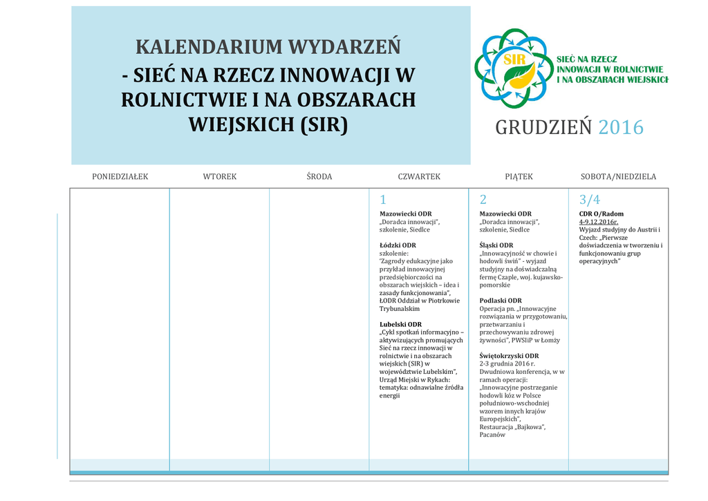 KALENDARIUM WYDARZEŃ - SIEĆ NA RZECZ INNOWACJI W ROLNICTWIE I NA OBSZARACH WIEJSKICH (SIR) PONIEDZIAŁEK WTOREK ŚRODA GRUDZIEŃ 2016 CZWARTEK PIĄTEK SOBOTA/NIEDZIELA 1 2 3/4 Mazowiecki ODR „Doradca innowacji”, szkolenie, Siedlce Mazowiecki ODR „Doradca innowacji”, szkolenie, Siedlce Łódzki ODR szkolenie: ‘Zagrody edukacyjne jako przykład innowacyjnej przedsiębiorczości na obszarach wiejskich – idea i zasady funkcjonowania”, ŁODR Oddział w Piotrkowie Trybunalskim Śląski ODR „Innowacyjność w chowie i hodowli świń” - wyjazd studyjny na doświadczalną fermę Czaple, woj. kujawskopomorskie CDR O/Radom 4-9.12.2016r. Wyjazd studyjny do Austrii i Czech: „Pierwsze doświadczenia w tworzeniu i funkcjonowaniu grup operacyjnych” Lubelski ODR „Cykl spotkań informacyjno – aktywizujących promujących Sieć na rzecz innowacji w rolnictwie i na obszarach wiejskich (SIR) w województwie Lubelskim”, Urząd Miejski w Rykach: tematyka: odnawialne źródła energii Podlaski ODR Operacja pn. „Innowacyjne rozwiązania w przygotowaniu, przetwarzaniu i przechowywaniu zdrowej żywności”, PWSIiP w Łomży Świętokrzyski ODR 2-3 grudnia 2016 r. Dwudniowa konferencja, w w ramach operacji: „Innowacyjne postrzeganie hodowli kóz w Polsce południowo-wschodniej wzorem innych krajów Europejskich”, Restauracja „Bajkowa”, Pacanów 5 6 7 8 9 Dolnośląski ODR 5-8.12.2016 Wyjazd studyjny do Holandii “Autostradą do innowacji” Dolnośląski ODR 5-8.12.2016 Wyjazd studyjny do Holandii “Autostradą do innowacji” Dolnośląski ODR 5-8.12.2016 Wyjazd studyjny do Holandii “Autostradą do innowacji” Dolnośląski ODR 5-8.12.2016 Wyjazd studyjny do Holandii “Autostradą do innowacji” Podlaski ODR Przeprowadzenie cyklu warsztatów tematycznych dotyczących promowania innowacyjnych metod zapobiegających znoszeniu środków ochrony roślin w powiatach bielski, białostocki, augustowski, grajewski, łomżyński, wysokomazowiecki. Podlaski ODR Przeprowadzenie cyklu warsztatów tematycznych dotyczących promowania innowacyjnych metod zapobiegających znoszeniu środków ochrony roślin w powiatach bielski, białostocki, augustowski, grajewski, łomżyński, wysokomazowiecki. Podlaski ODR Przeprowadzenie cyklu warsztatów tematycznych dotyczących promowania innowacyjnych metod zapobiegających znoszeniu środków ochrony roślin w powiatach bielski, białostocki, augustowski, grajewski, łomżyński, wysokomazowiecki. Podlaski ODR Przeprowadzenie cyklu warsztatów tematycznych dotyczących promowania innowacyjnych metod zapobiegających znoszeniu środków ochrony roślin w powiatach bielski, białostocki, augustowski, grajewski, łomżyński, wysokomazowiecki. Śląski ODR „Innowacyjność w chowie i hodowli królików – wyjazd studyjny do Zakładu Doświadczalnego w Chorzelowie Państwowego Instytutu Badawczego Instytutu Zootechniki w Balicach Warmińsko-Mazurski ODR Spotkanie informacyjno – szkoleniowe, w ramach operacji: „Wykorzystanie technik brokerskich w pracy doradczej przy budowaniu sieci kontaktów w celu wyłonienia partnerów do współpracy w ramach Działania „Współpraca” z terenu województwa warmińsko-mazurskiego” Szczytnie Śląski ODR „Innowacyjne aspekty rynku produktów pszczelich" Aula Ojca A. Kordeckiego na Jasnej Górze w Częstochowie Warmińsko-Mazurski ODR Spotkanie informacyjno – szkoleniowe, w ramach operacji: „Wykorzystanie technik brokerskich w pracy doradczej przy budowaniu sieci kontaktów w celu wyłonienia partnerów do współpracy w ramach Działania „Współpraca” z terenu województwa warmińsko-mazurskiego” w Ełku i Kętrzynie Warmińsko-Mazurski ODR Spotkanie informacyjno – szkoleniowe, w ramach operacji: „Wykorzystanie technik brokerskich w pracy doradczej przy budowaniu sieci kontaktów w celu wyłonienia partnerów do współpracy w ramach Działania „Współpraca” z terenu województwa warmińsko-mazurskiego” w Giżycku Mazowiecki ODR Szkolenie „Perspektywy kreowania korytarzy ekologicznych w skali lokalnej z korzyścią dla przyrody i rolnika”, Płońsk Mazowiecki ODR Szkolenie „Perspektywy kreowania korytarzy ekologicznych w skali lokalnej z korzyścią dla przyrody i rolnika”, Radom Kujawsko-Pomorski ODR Warsztaty w ramach operacji „Upowszechnianie wiedzy na temat legalnej sprzedaży produktów lokalnych i tradycyjnych z branży rolnospożywczej oraz tworzenie kanałów sprzedaży”, Minikowo. Kujawsko-Pomorski ODR Warsztaty w ramach operacji „Upowszechnianie wiedzy na temat legalnej sprzedaży produktów lokalnych i tradycyjnych z branży rolnospożywczej oraz tworzenie kanałów sprzedaży”, Minikowo. Pomorski ODR III Pomorskie Forum Grup Producenckich – Stare Pole – wykład o działaniu „Współpraca” w ramach PROW 2014-2020 Lubuski ODR wyjazd szkoleniowy: „Brokering w innowacjach nową forma wsparcia dla rolnictwa”. Bonin, Sarbinowo Świętokrzyski ODR 7-8.12.2016 Trzydniowy wyjazd studyjny na fermę kóz mlecznych w Holandii, w ramach operacji: „Innowacyjne postrzeganie hodowli kóz w Polsce południowo-wschodniej wzorem innych krajów Europejskich”, Mazowiecki ODR Szkolenie „Możliwości utylizacji odpadów organicznych, poprawy plonowania i właściwości gleb przez zastosowanie biowęgla”, Siedlce Kujawsko-Pomorski ODR Warsztaty w ramach operacji „Upowszechnianie wiedzy na temat legalnej sprzedaży produktów lokalnych i tradycyjnych z branży rolnospożywczej oraz tworzenie kanałów sprzedaży”, Minikowo. Lubuski ODR wyjazd szkoleniowy: „Brokering w innowacjach nową forma wsparcia dla rolnictwa”. Bonin, Sarbinowo Warmińsko-Mazurski ODR Spotkanie informacyjno – szkoleniowe, w ramach operacji: „Wykorzystanie technik brokerskich w pracy doradczej przy budowaniu sieci kontaktów w celu wyłonienia partnerów do współpracy w ramach Działania „Współpraca” z terenu województwa warmińsko-mazurskiego” w Nowym Mie
