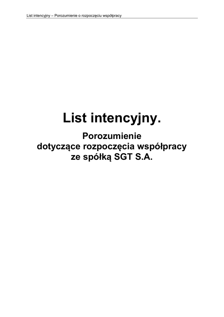 List intencyjny – Porozumienie o rozpoczęciu współpracy List intencyjny. Porozumienie dotyczące rozpoczęcia współpracy ze spółką SGT S.A. List Intencyjny – Porozumienie o rozpoczęciu współpracy List intencyjny – Porozumienie dotyczące rozpoczęcia współpracy, podpisane pomiędzy: SGT S.A. z siedzibą w Katowicach, kod 40-568, ul. Ligocka 103 bud.8, zarejestrowaną przez Sąd Rejonowy Katowice-Wschód w Katowicach, Wydział VIII Gospodarczy. Kapitał zakładowy: 2 092 398,00 zł NIP: 6312533927, KRS: 0000293307 reprezentowaną przez Prezesa Bartłomieja Czardybona, zwaną w dalszej części Porozumienia „SGT” oraz ........................................................................................................................................... reprezentowanym przez .................................................................................................. , zwanym dalej Operatorem. Mając na uwadze, że: 1. SGT jest operatorem cyfrowej telewizji kablowej wykorzystującej technologie IPTV, w związku z czym dysponuje odpowiednią infrastrukturą techniczną, kompetencjami oraz uprawnieniami niezbędnymi do świadczenia usługi multimedialnych abonentom sieci Operatora; 2. Operator dysponuje nowoczesną siecią telekomunikacyjną, której możliwości techniczne pozwalają na świadczenie usług multimedialnych, w szczególności telewizyjnych; dysponuje też kompetencjami wystarczającymi do wdrożenia teletransmisji usług telewizyjnych; 3. Operator świadczy usługi multimedialne w swojej sieci, w szczególności usługę szerokopasmowego dostępu do sieci Internet; 4. Operator chce wzbogacić swoją ofertę o usługi telewizyjne świadczone abonentom swojej sieci. Strony postanawiają podjąć współpracę opisaną w punktach poniżej: §1 Przedmiot współpracy 1. Na podstawie porozumienia strony mogą podjąć działania mające na celu nawiązanie współpracy w dziedzinie oferowania usług multimedialnych (w szczególności telewizyjnych) abonentom sieci Operatora. 2. Działania te będą polegały na: a) wzajemnym zobowiązaniu się do zachowania tajemnicy; b) przeprowadzeniu wstępnych testów usługi telewizyjnej SGT w sieci Operatora; c) znalezieniu właściwego rozwiązania dla wpięcia urządzeń sieciowych Operatora w uzgodniony z SGT punkt styku; d) Wynegocjowaniu „Umowy o Współpracy” precyzującej szczegółowe zasady oraz warunki przyszłej współpracy. §2 Wstępne testy usługi telewizyjnej Strony przeprowadzą wstępne testy usług świadczonych przez SGT w sieci Operatora, z wykorzystaniem istniejących łączy teletransmisyjnych. Testy wstępne nie będą testami środowiska produkcyjnego – maja one na celu przede wszystkim zapoznanie się Operatora z funkcjonalnością rozwiązania oraz oferty SGT. 2. W celu przeprowadzenia wstępnych testów: a) Operator będzie mógł wypożyczyć lub zakupić od SGT urządzenia STB (Set Top Box), zalecane jako urządzenia terminujące dla abonenta. b) O ile Strony nie widzą innego rozwiązania technicznego (np. skorzystania z łączy operatorów, w których sieciach jest dostępny sygnał telewizyjny SGT) Operator, w porozumieniu z SGT, zestawi w sieci Internet tunel transmitujący VLAN sieci Ethernet w rozumieniu normy IEEE-802.1ad 1. Strona 2 z 3 List Intencyjny – Porozumienie o rozpoczęciu współpracy 3. 4. (pełne Q.In.Q), przenoszący sygnał telewizyjny w technologii IPTV (mutlicast IP zawierający strumienie IEC-13818); c) SGT udostępni na okres 30 dni, dla urządzeń STB zakupionych lub wypożyczonych przez Operatora pakiet DEMO usługi JAMBOX. Operator ma świadomość, że usługa wykorzystująca tunelowanie transmisji w sieci Internet nie zachowuje standardów jakości przewidzianych dla tego typu usług. Testy trwać będą 30 dni. Po tym okresie Strony wspólnie podejmą decyzję o potrzebie ich kontynuacji lub zakończenia. §3 1. Po przeprowadzonych testach strony zakończą współpracę lub będą dążyć do jej kontynuowania w oparciu o „Umowę o Współpracy”. §4 1. 2. 3. 4. 2. 3. Zachowanie poufności Strony zobowiązują się zachować w ścisłej tajemnicy Informacje Poufne zdefiniowane poniżej, uzyskane przez Stronę niniejszego Porozumienia od drugiej Strony. Strony niniejszym zobowiązują się traktować, jako Informacje Poufne wszelkie informacje przekazane przez Strony w czasie realizacji niniejszego Porozumienia, w szczególności plany, biznesplany, istnienie oraz zawartość umów i zobowiązań w stosunku do osób trzecich, cenniki, dane techniczne, badania, analizy, a także inne dokumenty opracowane przez jedną ze Stron, w tym informacje przygotowane na podstawie materiałów dostarczonych przez drugą Stronę. Na potrzeby niniejszego Porozumienia za Informację Poufną rozumie się jakąkolwiek wiadomość wyrażoną pisemnie, słownie, za pomocą obrazu, rysunku, znaku, dźwięku albo zawartą w urządzeniu, przyrządzie lub innym przedmiocie, a także wyrażoną w jakikolwiek inny sposób. Za Informacje Poufne nie uważa się informacji, które: a) są lub staną się dostępne publicznie jeszcze przed podpisaniem niniejszego Porozumienia, b) informacje, co do których Strona wyraziła uprzednią pisemną zgodę na ich ujawnienie. Każda ze Stron zobowiązana jest nie wykorzystywać Informacji Poufnych w sposób, który może spowodować powstanie jakiekolwiek szkody dla drugiej Strony, bądź jej wizerunku. §5 1. Podpisanie umowy Postanowienia końcowe Zmiany niniejszego Porozumienia mogą być dokonane jedynie w formie pisemnej pod rygorem nieważności. Porozumienie zostało sporządzone w dwóch jednobrzmiących egzemplarzach, po jednym egzemplarzu dla każdej ze Stron. Niniejsze Porozumienie wchodzi w życie z chwilą jej podpisania przez obie Strony. Podpisy: W imieniu SGT W imieniu Operatora ___________________ ___________________ Strona 3 z 3