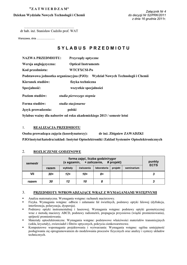"Z A T W I E R D Z A M" Załącznik Nr 4 do decyzji Nr 52/PRK/2011 z dnia 16 grudnia 2011r. Dziekan Wydziału Nowych Technologii i Chemii .......................................................... dr hab. inż. Stanisław Cudziło prof. WAT Warszawa, dnia .......................... SYLABUS PRZEDMIOTU NAZWA PRZEDMIOTU: Przyrządy optyczne Wersja anglojęzyczna: Optical Instruments Kod przedmiotu: WTCFXCSI-Po Podstawowa jednostka organizacyjna (PJO): Wydział Nowych Technologii i Chemii Kierunek studiów: fizyka techniczna Specjalność: wszystkie specjalności Poziom studiów: studia pierwszego stopnia Forma studiów: studia stacjonarne Język prowadzenia: polski Sylabus ważny dla naborów od roku akademickiego 2013 / semestr letni 1. REALIZACJA PRZEDMIOTU Osoba prowadząca zajęcia (koordynatorzy): dr inż. Zbigniew ZAWADZKI PJO/instytut/katedra/zakład: Instytut Optoelektroniki /Zakład Systemów Optoelektronicznych 2. ROZLICZENIE GODZINOWE forma zajęć, liczba godzin/rygor (x egzamin, + zaliczenie, # projekt) semestr 3. punkty ECTS razem wykłady ćwiczenia laboratoria VII 30+ 12+ 10+ 8+ 3 razem 30 12 10 8 3 projekt seminarium PRZEDMIOTY WPROWADZAJĄCE WRAZ Z WYMAGANIAMI WSTĘPNYMI Analiza matematyczna. Wymagania wstępne: rachunek macierzowy. Fizyka. Wymagania wstępne: odbicie i załamanie fal świetlnych, podstawy optyki falowej (dyfrakcja, interferencja, polaryzacja, dyspersja). Podstawy optyki instrumentalnej i laserowej. Wymagania wstępne: podstawy optyki geometrycznej wraz z metodą macierzy ABCD, podstawy radiometrii, propagacja przyosiowa (wiązki promieniowania), spójność promieniowania. Materiały optoelektroniczne. Wymagania wstępne: podstawowe właściwości materiałów transmisyjnych (szkła, kryształy), zwierciadeł i filtrów optycznych, pokrycia cienkowarstwowe. Komputerowe wspomaganie projektowania i wytwarzania: Wymagania wstępne: ogólna umiejętność posługiwania się oprogramowaniem do modelowania procesów fizycznych oraz analizy i syntezy układów technicznych. 4. ZAKŁADANE EFEKTY KSZTAŁCENIA odniesienie do efektów kształcenia dla kierunku Symbol Efekty kształcenia W1 Posiada wiedzę ogólną podbudowaną podstawami fizycznymi oraz opisem matematycznym w zakresie kluczowych zagadnień z optyki instrumentalnej i laserowej. K_W12 W2 Zna podstawowe metody i techniki matematyczne stosowane przy rozwiązywaniu prostych zadań inżynierskich z zakresu optyki instrumentalnej K_W23 W3 Zna podstawowe metody eksperymentalne, techniki, narzędzia i materiały stosowane przy rozwiązywaniu prostych zadań inżynierskich z zakresu optyki instrumentalnej K_W24 U1 Potrafi pozyskiwać informacje z literatury, baz danych oraz innych właściwie dobranych źródeł, także w języku angielskim. K_U01 U2 Potrafi planować i przeprowadzać eksperymenty, w tym pomiary i symulacje komputerowe, opracować i interpretować uzyskane wyniki oraz wyciągać logiczne wnioski K_U09 U3 Potrafi dokonać identyfikacji i sformułować specyfikację prostych zadań inżynierskich, o charakterze praktycznym, charakterystycznych dla laboratoryjnej działalności badawczej. K_U16 U4 Potrafi ocenić przydatność rutynowych metod i narzędzi rozwiązania prostego zadania inżynierskiego o charakterze praktycznym, charakterystycznego dla laboratoryjnej działalności badawczej, oraz wybrać i zastosować właściwą metodę i narzędzia K_U17 U5 K1 K2 Potrafi zgodnie z zadaną specyfikacją zaprojektować oraz zrealizować proste urządzenie, obiekt, system lub proces, typowe dla laboratoryjnej działalności badawczej, używając właściwych metod, technik i narzędzi Rozumie potrzebę uczenia się przez całe życie Prawidłowo rozpoznaje i rozstrzyga problemy związane z wykonywaniem zawodu K_U18 K_K01 K_K07 5. METODY DYDAKTYCZNE Zarówno wykład, jak i ćwiczenia rachunkowe oraz laboratoryjne, są prowadzone metodami aktywizującymi studenta poprzez twórcze rozwiązywanie problemów oraz rozwijanie umiejętności dyskusji Wykłady prowadzone będą głównie w formie audiowizualnej Ćwiczenia rachunkowe związane z zagadnieniami omawianymi na wykładzie obejmują przypomnienie, utrwalenie i usystematyzowanie wcześniej nabytej wiedzy poprzez rozwiązywanie wybranych zadań i problemów Ćwiczenia laboratoryjne ukierunkowano na poznanie właściwości układów i przyrządów optycznych oraz wykonanie prostych pomiarów, co pogłębi zrozumienie ich działania 6. TREŚCI PROGRAMOWE lp temat/tematyka zajęć 1. liczba godzin wykł. ćwicz. Wstępny sprawdzian. Macierz ABCD i podstawowe pojęcia optyki technicznej (ogniskowe, powiększenia, drogi dyfrakcji, przysłony aperturowa i polowa, pole widzenia, apertura numeryczna, głębia ostrości, uzgadnianie źrenic i winietowanie). 2 2 2. Geometryczna i falowa teoria powstawania obrazu oraz kryteria jakości odwzorowania optycznego (rozmycie dyfrakcyjne, aberracje, spot-diagram, liczba Strehla, PSF, OTF). 2 3. Elementy przyrządów optycznych: zwierciadła płaskie i sferyczne, płytka płasko-równoległa, soczewki, pryzmaty załamujące i odbijające. 2 2 4. Oko i podzespoły optyczne: optyka fizjologiczna, lupa, okulary przyrządowe, obiektywy obrazujące, projektory, kolimatory. 2 2 5. Mikroskopy z uwzględnieniem stereoskopowych, interferencyjnych i polaryzacyjnych. 2 2 6. Lunety i przyrządy lunetowe: celowniki, dalmierze, teodolity, autokolimatory, optimetry, teleskopy astronomiczne. Sprawdzian zaliczeniowy. 2 2 12 10 Razem 7. lab. proj. semin. ..... ...... 4 4 8 LITERATURA podstawowa: F.Ratajczak, Instrumenty optyczne, Ofic. Wydawn. PWr, Wrocław, 2005. uzupełniająca: J.K.Jabczyński, Podstawy optyki stosowanej, Wyd. WAT, Warszawa, 2006 R.Jóźwicki, Podstawy inżynierii fotonicznej, Ofic. Wydawn. PW, Warszawa, 2006 A.Sojecki, Optyka, WSiP, Warszawa, 1997 R.Jóźwicki, Teoria odwzorowania optycznego, PWN, Warszawa, 1988 8. SPOSOBY WERYFIKACJI ZAKŁADANYCH EFEKTÓW KSZTAŁCENIA Przedmiot zaliczany jest na ocenę, natomiast
