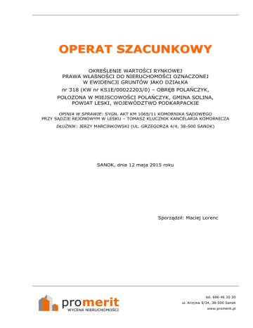 OPERAT SZACUNKOWY OKREŚLENIE WARTOŚCI RYNKOWEJ PRAWA WŁASNOŚCI DO NIERUCHOMOŚCI OZNACZONEJ W EWIDENCJI GRUNTÓW JAKO DZIAŁKA nr 318 (KW nr KS1E/00022203/0) – OBRĘB POLAŃCZYK, POŁOŻONA W MIEJSCOWOŚCI POLAŃCZYK, GMINA SOLINA, POWIAT LESKI, WOJEWÓDZTWO PODKARPACKIE OPINIA W SPRAWIE: SYGN. AKT KM 1065/11 KOMORNIKA SĄDOWEGO PRZY SĄDZIE REJONOWYM W LESKU – TOMASZ KLUCZNIK KANCELARIA KOMORNICZA DŁUŻNIK: JERZY MARCINKOWSKI (UL. GRZEGORZA 4/4, 38-500 SANOK) SANOK, dnia 12 maja 2015 roku Sporządził: Maciej Lorenc tel. 696 46 20 30 ul. Krzywa 5/34, 38-500 Sanok www.promerit.pl Nieruchomość gruntowa, działka nr 318 (KW nr KS1E/00022203/0), obręb Polańczyk, jednostka ewidencyjna Solina, powiat leski, województwo podkarpackie – opinia w sprawie sygn. akt KM 1065/11 WYCIĄG Z OPERATU SZACUNKOWEGO Podstawy sporządzenia operatu szacunkowego Ustawa z dnia 21 sierpnia 1997 roku o gospodarce nieruchomościami (Dz. U. 2014 poz. 518 z późniejszymi zmianami) Rozporządzenie Rady Ministrów z dnia 21 września 2004 roku w sprawie wyceny nieruchomości i sporządzania operatu szacunkowego (Dz. U. 2004 nr 207 poz. 2109 z późniejszymi zmianami) Przedmiot wyceny nieruchomość gruntowa Cel wyceny określenie wartości rynkowej prawa własności do nieruchomości gruntowej jako podstawy do przeprowadzenia czynności komorniczych – opinia w sprawie Komornika Sądowego przy Sądzie Rejonowym w Lesku, Kancelaria Komornicza Tomasz Klucznik, sygn. akt KM 1065/11 Rodzaj praw prawo własności w udziale 1/1: JERZY MARCINKOWSKI S. JÓZEFA I FRANCISZKI Oznaczenie w ewidencji gruntów Nr księgi wieczystej Jedn. ewidencyjna KS1E/00022203/0 Solina Obręb Arkusz Polańczyk 6 Numer działki Pow. (m2) 318 5229 Użytki gruntowe, klasa Oznaczenie Pow. (m2) Lzr-PsVI 1627 N 2328 PsIV 1274 Nr działki Przeznaczenie nieruchomości 318 MPZP: symbol „ZI” – tereny zieleni izolacyjnej; symbol „1. Lz” – tereny zieleni; symbol „1. KDg” – tereny komunikacji – drogi publiczne klasy głównej; symbol „3. KDd” – tereny komunikacji – drogi publiczne klasy dojazdowej Działka ewidencyjna nr 318 – obręb Polańczyk Opis nieruchomości Nieruchomość gruntowa stanowiąca działkę nr 318 położona jest w miejscowości Polańczyk, gmina Solina, powiat leski. Działka o powierzchni 5229m2 umiejscowiona jest wśród typowej dla tej części miejscowości zabudowy mieszkaniowej jednorodzinnej oraz rekreacji indywidualnej i usług hotelarskich. Otoczenie tworzą również grunty niezabudowane. W odległości około 1km rozpoczyna się ulica Zdrojowa biegnąca przez uzdrowiskową część miejscowości. Nieruchomość posiada kształt nieforemny, zbliżony do trójkąta. Teren o zróżnicowanym ukształtowaniu – spadek przechodzący w miejscowe wypłaszczenie, obniżony w stosunku do poziomu drogi wojewódzkiej nr 894 wyznaczającej zachodnią granicę działki. Od strony północnej i dalej wschodniej granicę odcina wąska, asfaltowa ulica Świętego Jana. W odległości około 0,3km znajduje się przeprawa promowa na Wyspę Dużą (powierzchnia około 34ha) leżącą w lewej części Zalewu Solińskiego. W pobliżu południowej granicy wyznaczanej przez ciek wodny (obszar nieznacznie podmokły), przebiega sieć elektroenergetyczna, widoczne słupy techniczne. Działka zakrzewiona i zadrzewiona głównie w północnej części, południowy obszar sporadycznie koszony. Odległość od Zalewu Solińskiego wynosi około 0,25km w linii prostej, brak bezpośredniego widoku. Lokalizacja bardzo dobra – obszar atrakcyjny i modny pod względem turystycznym. Wartość rynkowa prawa własności, działka ewidencyjna nr 318 Data określenia wartości 150000 zł STO PIĘĆDZIESIĄT TYSIĘCY zł 05 maja 2015 roku Podpis i pieczęć autora operatu Data sporządzenia operatu 12 maja 2015 roku Opracował: Maciej Lorenc – rzeczoznawca majątkowy Strona 2 z 23 Sanok, dnia 12 maja 2015 roku Nieruchomość gruntowa, działka nr 318 (KW nr KS1E/00022203/0), obręb Polańczyk, jednostka ewidencyjna Solina, powiat leski, województwo podkarpackie – opinia w sprawie sygn. akt KM 1065/11 SPIS TREŚCI 1. CZĘŚĆ OGÓLNA ............................................................................................................................................... 4 1.1. PRZEDMIOT I ZAKRES WYCENY ........................................................................................................... 4 1.1.1. Przedmiot wyceny ............................................................................................................................ 4 1.1.2. Zakres opracowania ........................................................................................................................ 4 1.2. CEL WYCENY ............................................................................................................................................... 4 1.3. PODSTAWY OPRACOWANIA OPERATU SZACUNKOWEGO .......................................................... 4 1.3.1. Podstawy formalne .......................................................................................................................... 4 1.3.2. Podstawy materialno – prawne .................................................................................................. 4 1.3.3. Podstawy metodologiczne ............................................................................................................ 5 1.3.4. Źródła danych merytorycznych .................................................................................................. 5 1.4. DATY ISTOTNE DLA OPERATU SZACUNKOWEGO .......................................................................... 5 2. CZĘŚĆ SZCZEGÓŁOWA ................................................................................................................................ 6 2.1. OPIS NIERUCHOMOŚCI ........................................................................................