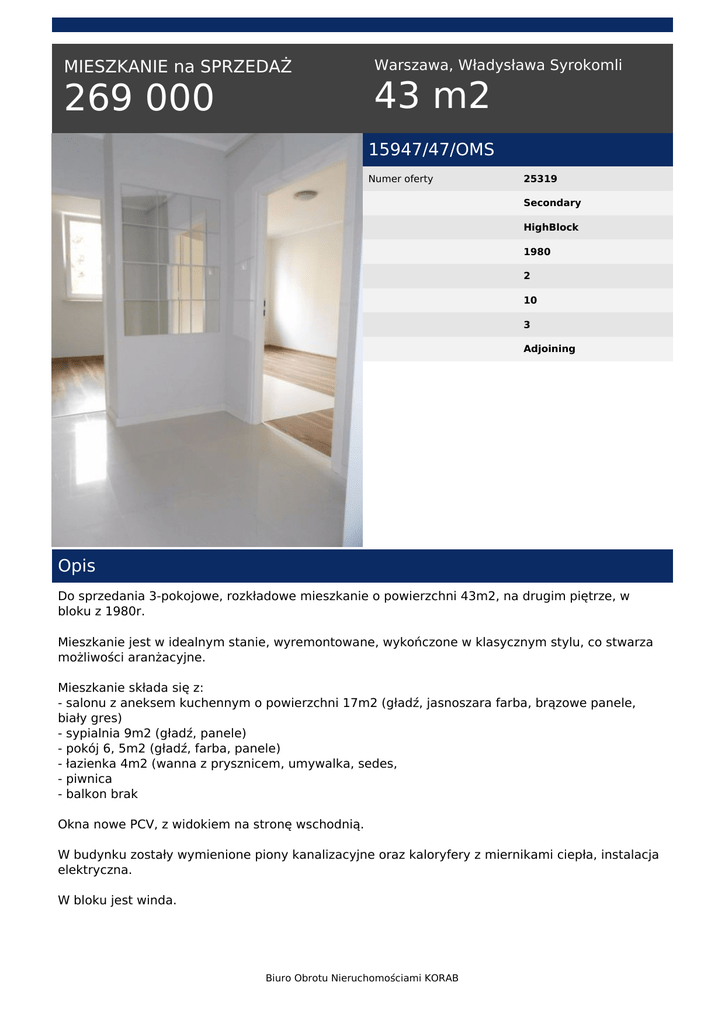 269 000 43 m2 - Korab Nieruchomości