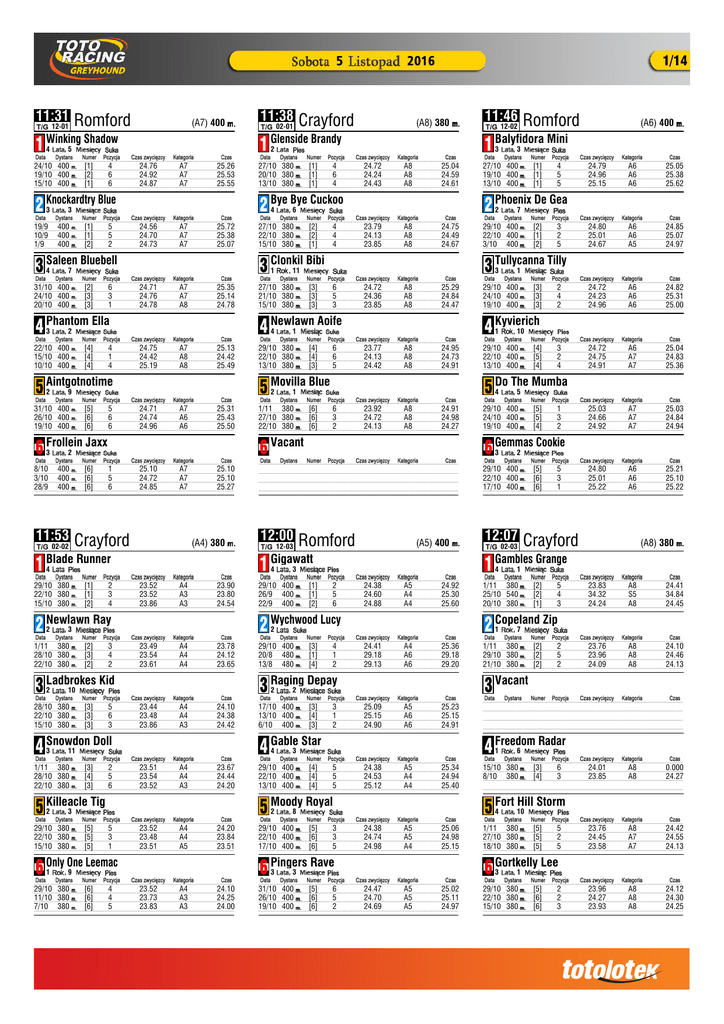5 11:31 Romford 12-01 (A7) 400 Winking Shadow 4 11:38 Crayford 02-01 (A8) 380 Glenside Brandy ,5 1/14 2016 11:46 Romford 12-02 (A6) 400 Balyfidora Mini 2 3 ,3 ........................................................................................................................................................................................................ ........................................................................................................................................................................................................ ........................................................................................................................................................................................................ 24/10 400 [1] 4 24.76 A7 25.26 ........................................................................................................................................................................................................ 19/10 400 [2] 6 24.92 A7 25.53 ........................................................................................................................................................................................................ 15/10 400 [1] 6 24.87 A7 25.55 ........................................................................................................................................................................................................ 27/10 380 [1] 4 24.72 A8 25.04 ........................................................................................................................................................................................................ 20/10 380 [1] 6 24.24 A8 24.59 ........................................................................................................................................................................................................ 13/10 380 [1] 4 24.43 A8 24.61 ........................................................................................................................................................................................................ 27/10 400 [1] 4 24.79 A6 25.05 ........................................................................................................................................................................................................ 19/10 400 [1] 5 24.96 A6 25.38 ........................................................................................................................................................................................................ 13/10 400 [1] 5 25.15 A6 25.62 ........................................................................................................................................................................................................ Knockardtry Blue Bye Bye Cuckoo 3 4 ,3 ........................................................................................................................................................................................................ 19/9 400 [1] 5 24.56 A7 25.72 ........................................................................................................................................................................................................ 10/9 400 [1] 5 24.70 A7 25.38 1/9 400 [2] 2 24.73 A7 25.07 ........................................................................................................................................................................................................ ........................................................................................................................................................................................................ 2 ........................................................................................................................................................................................................ 27/10 380 [2] 4 23.79 A8 24.75 22/10 380 [2] 4 24.13 A8 24.49 ........................................................................................................................................................................................................ 15/10 380 [1] 4 23.85 A8 24.67 ........................................................................................................................................................................................................ ........................................................................................................................................................................................................ Saleen Bluebell Clonkil Bibi 4 1 ,7 Phoenix De Gea ,6 ,7 ........................................................................................................................................................................................................ 29/10 400 [2] 3 24.80 A6 24.85 22/10 400 [1] 2 25.01 A6 25.07 ........................................................................................................................................................................................................ 3/10 400 [2] 5 24.67 A5 24.97 ........................................................................................................................................................................................................ ........................................................................................................................................................................................................ Tullycanna Tilly , 11 3 ,1 ........................................................................................................................................................................................................ ..........................................................................................................................................
