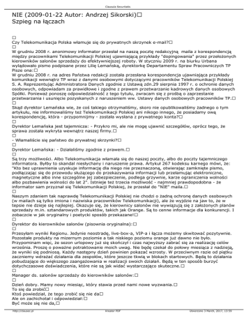 Clausula Securitatis NIE (2009-01-22 Autor: Andrzej Sikorski) Szpieg na łączach Czy Telekomunikacja Polska włamuje się do prywatnych skrzynek e-mail? W grudniu 2008 r. anonimowy informator przesłał na naszą pocztę redakcyjną maila z korespondencją między pracownikami Telekomunikacji Polskiej ujawniającą przykłady "dopingowania" przez przełożonych kierowników salonów sprzedaży do efektywniejszej roboty. W styczniu 2009 r. na biurku Urbana wylądowało pismo podpisane przez Lilię Lemańską, dyrektorkę Departamentu Spraw Pracowniczych TP Pisze ona: W grudniu 2008 r. na adres Państwa redakcji została przesłana korespondencja ujawniająca przykłady komunikacji wewnątrz TP wraz z danymi osobowymi dotyczącymi pracowników Telekomunikacji Polskiej S. A. Reprezentując Administratora Danych zgodnie z Ustawą zdn.29 sierpnia 1997 r. o ochronie danych osobowych, odpowiadam za prawidłowe i zgodne z prawem przetwarzanie kadrowych danych osobowych Spółki. Ponieważ ponoszę odpowiedzialność z tego tytułu, zwracam się z prośbą o zaprzestanie przetwarzania i usunięcie pozyskanych z naruszeniem ww. Ustawy danych osobowych pracowników TP. Skąd dyrektor Lemańska wie, że coś takiego otrzymaliśmy, skoro nie opublikowaliśmy żadnego o tym artykułu, nie informowaliśmy też Telekomunikacji Polskiej ani nikogo innego, że posiadamy ową korespondencję, która - przypomnijmy - została wysłana z prywatnego konta? Dyrektor Lemańska jest tajemnicza: - Przykro mi, ale nie mogę ujawnić szczegółów, oprócz tego, że sprawa została wykryta wewnątrz naszej firmy. - Włamaliście się państwo do prywatnej skrzynki? Dyrektor Lemańska: - Działaliśmy zgodnie z prawem. Są trzy możliwości. Albo Telekomunikacja włamała się do naszej poczty, albo do poczty tajemniczego informatora. Byłby to skandal niesłychany i naruszenie prawa. Artykuł 267 kodeksu karnego mówi, że: "Kto bez uprawnienia uzyskuje informację dla niego nie przeznaczoną, otwierając zamknięte pismo, podłączając się do przewodu służącego do przekazywania informacji lub przełamując elektroniczne, magnetyczne albo inne szczególne jej zabezpieczenie, podlega grzywnie, karze ograniczenia wolności albo pozbawienia wolności do lat 2". Istnieje też trzecia możliwość - najmniej prawdopodobna - że informator sam przyznał się Telekomunikacji Polskiej, że przesłał do "NIE" maila. Naszym zdaniem tak naprawdę Telekomunikacji Polskiej nie chodzi o żadną ochronę danych osobowych (w mailach są tylko imiona i nazwiska pracowników Telekomunikacji), ale że wyjdzie na jaw to, że w tepsie nie dzieje się najlepiej. Okazuje się, że kierownicy salonów nie wywiązują się z założonych planów sprzedaży m.in. sztandarowych produktów, takich jak Orange. Są to cenne informacje dla konkurencji. I zobaczcie w jak oryginalny i poetycki sposób przekazane! Dyrektor do kierowników salonów (pisownia oryginalna): Przesyłam wyniki Regionu. Jedynie neostradę, live-box-a, VIP-a i łącza możemy skwitować pozytywnie. Pozostałe produkty na mizernym poziomie a tak niskiego poziomu orange już dawno nie było. Przypominam więc, że sezon urlopowy już się skończył i czas najwyższy zabrać się za realizację celów września. Proszę o poważne potraktowanie moich uwag. Nie będę czekał do połowy miesiąca z nadzieją, że wyniki się podniosą. Każdy następny dzień powinien pokazać wzrosty. W przeciwnym razie od piątku zaczniemy wdrażać działania dla zespołów, które jeszcze tkwią w blokach startowych. Będą to działania pobudzające do większego zaangażowania w realizacji swoich działań. Będą w ten sposób burzyć dotychczasowe doświadczenia, które nie są jak widać wystarczająco skuteczne. Manager ds. salonów sprzedaży do kierowników salonów: Dzień dobry. Mamy nowy miesiąc, który stawia przed nami nowe wyzwania. To się da zrobić Ktoś powiedział, że tego zrobić się nie da Ale on zachichotał i odpowiedział: Być może się nie da, http://clausec.pl Kreator PDF Utworzono 3 March, 2017, 13:59 Clausula Securitatis Ale ja się pod tym nie podpisuję Dopóki sam nie spróbuję. Więc ostro wziął się do roboty Ukrywając jakby lekki uśmiech na twarzy; I zaczął sobie podśpiewywać, ten który się odważył Brać się za rzecz, której zrobić się nie da, I co? I zrobił to. Doradców zawsze znajdziesz tysiąc życzliwych: Tego zrobić się nie da - skonstatują, Wszystkie zagrożenia dokładnie wypunktują, Klęskę pewną oznajmią złowieszczo, A Ty nie daj się złapać w te kleszcze. Po prostu chwyć się z problemem za bary Ukrywając lekki uśmiech na twarzy; Zrzuć krepujący twe ciało pancerz; I zacznij sobie podśpiewywać, gdy się odważysz Zacząć robić to, czego zrobić się nie da, I co? I nic. Zrobisz to. Swe dane osobowe ów poeta rzeczywiście powinien ukrywać. Dyrektor do kierowników salonów: DUSZEK I BOGACZYK JAŚ NAWET NIE WYSTARTOWALI RESZTA PONIŻEJ OCZEKIWAŃ JAK ZWYKLE KOMBINUJE NA 70%. MNIE MOŻNA ŚCIEMNIAĆ ALE TEN KTÓRY PRZYJDZIE PO MNIE NIE BĘDZIE MIAŁ SENTYMENTÓW. SAM GO POPROSZĘ ŻEBY NIE MIAŁ. GENIU I ZBYSZEK STWIERDZILI ŻE NADGONIĄ PRZEDłUŻENIEM NEO, RYSIEK ŁĄCZAMI, HUBERCIK W LESZNIE DOSTAŁ PODWYŻKĘ WIĘC MU TO DYNDA. DUSZEK POPŁACZE OD 25 PAŹDZIERNIKA ŻE MU SIĘ MULTIPAKIET NIE ZALICZA. JAŚ JAK ZWYKLE CZEKA NA COD. PRZYKRE ŻE POGODZILIŚCIE SIĘ Z ROLĄ PRZEGRANYCH I BRAK AMBICJI ŻEBY SIĘ WYDOSTAĆ Z TEJ DOLINY.................. CHYBA ŻE SIĘ MYLĘ. MIAŁ BYĆ ZESPÓŁ A WYSZŁA SZARZYZNA. SKUPCIE SIĘ POTRZEBA JEDNEGO DOBREGO DNIA ABY PRZEŁAMAĆ TEN FATALNY TREND ALE TRZEBA MAX WYSIŁKU. Dyrektor do kierowników salonów: ..... Wczoraj na odprawie dopadła mnie bardzo zaraźliwa choroba. Głównymi nosicielami są: dyr. Regionu S. Partyka, Dyr. Działu Aktive A. Kwaśniewski, podczas odprawy zainfekowani zostali wszyscy kierownicy CSA i Kierownik Wsparcia K Jabłoński, ja