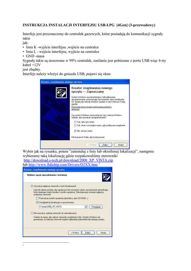 INSTRUKCJA INSTALACJI INTERFEJSU USB-LPG [4Gen] (3-przewodowy) Interfejs jest przeznaczony do centralek gazowych, które posiadają do komunikacji sygnały takie jak: • linia K -wyjście interfejsu ,wejście na centralce • linia L - wejście interfejsu, wyjście na centralce • GND -masa Sygnały takie są stosowane w 99% centralek, zasilanie jest pobierane z portu USB więc 4-rty kabel +12V jest zbędny. Interfejs naleŜy włoŜyć do gniazda USB, pojawi się okno Wybór jak na rysunku, potem ”zainstaluj z listy lub określonej lokalizacji”, następnie wybieramy taką lokalizację gdzie rozpakowaliśmy sterowniki http://download.s-tech.pl/download/2000_XP_VISTA.zip lub http://www.ftdichip.com/Drivers/D2XX.htm 1 1 wybieramy mimo to kontynuuj Następnie pojawi się USB SERIAL port który trzeba zainstalować stosując identyczne kroki j/w Pojawia się w zakładce Porty(Com i LPT) w menadŜerze urządzeń USB Serial Port (COM ##) Gdzie ## numer portu, naleŜy zwrócić uwagę Ŝe w komputerach stacjonarnych istnieją juŜ porty Com (my korzystamy USB Serial Port) , ## portu Com powinien zawierać się w 1-4, gdyŜ przewaŜnie programy gazowe korzystają z takiej numeracji. Tak zainstalowany port Com, jest tzw portem virtualnym po którym będzie zachodziła transmisja i ## powinien być zgodny z ## portu w programie gazowym. W przypadku zmianie numeru ##, naleŜy zresetować komputer. Przed podłączeniem do centralki gazowej i uruchomieniu programu gazowego USB Serial Port musi juŜ istnieć w systemie. Strony producentów LPG Diego,Bingo www.kme.com.pl STAG www.ac.com.pl Lovato,Digitronic http://www.propan.ru/support.html BRC,Autronic, LAndi, LOvtec http://www.gpl.cz/software.htm Programy do kilkudziesięciu Centralek http://members.lycos.co.uk/lpglpg/ http://members.lycos.co.uk/lpglpg1/ STRONY Wspierające temat LPG : http://www.motonews.pl/forum/?op=fvf&c=0&f=38 http://www.autogaz.xu.pl Ostrzezenia !!!! UWAGA !!! Interfejs jest zasilany z portu USB nie wolno podłączać go pod +12V jak w przypadku wersji interfejsu pod COM !!!! TakŜe zakazuje się podłączenia któregokolwiek sygnału pod +12V !!!! INTERFEJS usb JEST 3-PRZEWODOWY W ODRÓŜNIENIU OD WERSJI COM 4-PRZEWODOWEJ Warunki Gwarancji: • 12 miesięcy od daty zakupu • nie obejmuje uszkodzeń mechanicznych Warunki Reklamacji: • W przypadku problemów naleŜy najpierw zgłosić sprzedawcy i opisać problem • Stwierdzenia arbitralne : ”kabel jest uszkodzony” , ”informatyk stwierdził Ŝe interfejs jest na bank nie działa „ itp., nie są podstawą do reklamacji , obowiązkiem kupującego jest dostarczenie przede wszystkim historii instalacji oraz podania szczegółów technicznych (system operacyjny np. xp, rodzaj komputera (laptop/stacjonarny),nazwe i model centralki gazowej oraz uzyty program • Praca interfejsu LPG zaleŜy w duŜej mierze od komputera i systemu operacyjnego zainstalowanego na tym komputerze (zaleca się Win XP SP2), jeŜeli więc wystąpią problemy warto sprawdzić na drugim PC. Stwierdzenia typu „system jest w porządku bo gry działają” nie są podstawą do reklamacji. • Kupujący powinien dostarczyć informacje przede wszystkim mailem, wymagana jest podstawowa wiedza z dziedziny komputera i Windows • reklamacja moze byc złoŜona wyłącznie przez osobę która nabyła u nas przedmiot • Reklamowany towar nalezy odeslac na wlasny koszt na podany przez nas adres • przesylki które będą wysłane za "pobraniem" nie będą odbierane • reklamacje sa tylko i wyłącznie pod kątem załączonego przez państwa opisu usterki lub problemu,nie załączenie takiego opisu powoduje odesłanie go na koszt osoby np . stwierdzenie ze interfejs sie wiesza a przysłany okaze sie spalony zupełnie • reklamowany towar musi byc nienaruszony • zastrzegamy sobie prawo wymiany towaru o parametrach porównywalnych lub lepszych