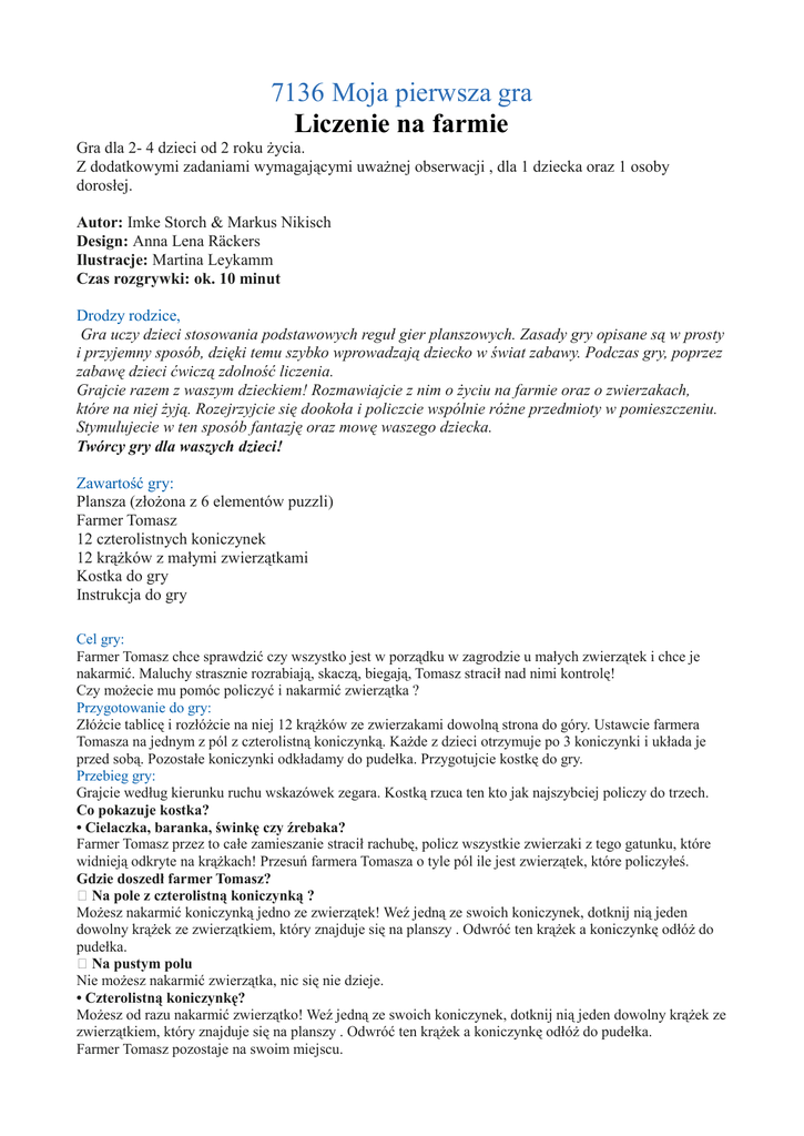 7136 Moja pierwsza gra Liczenie na farmie Gra dla 2- 4 dzieci od 2 roku życia. Z dodatkowymi zadaniami wymagającymi uważnej obserwacji , dla 1 dziecka oraz 1 osoby dorosłej. Autor: Imke Storch & Markus Nikisch Design: Anna Lena Räckers Ilustracje: Martina Leykamm Czas rozgrywki: ok. 10 minut Drodzy rodzice, Gra uczy dzieci stosowania podstawowych reguł gier planszowych. Zasady gry opisane są w prosty i przyjemny sposób, dzięki temu szybko wprowadzają dziecko w świat zabawy. Podczas gry, poprzez zabawę dzieci ćwiczą zdolność liczenia. Grajcie razem z waszym dzieckiem! Rozmawiajcie z nim o życiu na farmie oraz o zwierzakach, które na niej żyją. Rozejrzyjcie się dookoła i policzcie wspólnie różne przedmioty w pomieszczeniu. Stymulujecie w ten sposób fantazję oraz mowę waszego dziecka. Twórcy gry dla waszych dzieci! Zawartość gry: Plansza (złożona z 6 elementów puzzli) Farmer Tomasz 12 czterolistnych koniczynek 12 krążków z małymi zwierzątkami Kostka do gry Instrukcja do gry Cel gry: Farmer Tomasz chce sprawdzić czy wszystko jest w porządku w zagrodzie u małych zwierzątek i chce je nakarmić. Maluchy strasznie rozrabiają, skaczą, biegają, Tomasz stracił nad nimi kontrolę! Czy możecie mu pomóc policzyć i nakarmić zwierzątka ? Przygotowanie do gry: Złóżcie tablicę i rozłóżcie na niej 12 krążków ze zwierzakami dowolną strona do góry. Ustawcie farmera Tomasza na jednym z pól z czterolistną koniczynką. Każde z dzieci otrzymuje po 3 koniczynki i układa je przed sobą. Pozostałe koniczynki odkładamy do pudełka. Przygotujcie kostkę do gry. Przebieg gry: Grajcie według kierunku ruchu wskazówek zegara. Kostką rzuca ten kto jak najszybciej policzy do trzech. Co pokazuje kostka? • Cielaczka, baranka, świnkę czy źrebaka? Farmer Tomasz przez to całe zamieszanie stracił rachubę, policz wszystkie zwierzaki z tego gatunku, które widnieją odkryte na krążkach! Przesuń farmera Tomasza o tyle pól ile jest zwierzątek, które policzyłeś. Gdzie doszedł farmer Tomasz? � Na pole z czterolistną koniczynką ? Możesz nakarmić koniczynką jedno ze zwierzątek! Weź jedną ze swoich koniczynek, dotknij nią jeden dowolny krążek ze zwierzątkiem, który znajduje się na planszy . Odwróć ten krążek a koniczynkę odłóż do pudełka. � Na pustym polu Nie możesz nakarmić zwierzątka, nic się nie dzieje. • Czterolistną koniczynkę? Możesz od razu nakarmić zwierzątko! Weź jedną ze swoich koniczynek, dotknij nią jeden dowolny krążek ze zwierzątkiem, który znajduje się na planszy . Odwróć ten krążek a koniczynkę odłóż do pudełka. Farmer Tomasz pozostaje na swoim miejscu. Grę kontynuuje kolejne dziecko. Koniec gry: Wygrywa ten, komu uda się jako pierwszemu nakarmić zwierzątka wszystkimi swoimi koniczynkami i pozostaje bez nich! Znakomicie, okazałeś się być wspaniałym pomocnikiem dla farmera Tomasz, wygrywając tym samym grę. Wskazówka: Podczas gry dzieci liczą najwyżej do 10. Jest maksymalnie 10 zwierzątek z każdego gatunku. Możemy ułatwić grę eliminując krążki z ciemnozielonym brzegiem, wtedy w grze liczymy tylko do 5. Zadania wymagające uważnego słuchania (dla 1 dziecka oraz 1 osoby dorosłej) Ułóżcie planszę pośrodku stołu. Farmer Tomasz, krążki ze zwierzakami oraz koniczynki nie będą potrzebne. Czytajcie powoli zadania, dajcie czas dziecku na zrozumienie, obserwację oraz na licznie. Pomagajcie mu tylko kiedy widzicie, że nie da rady sam znaleźć odpowiedzi. Kiedy jakieś pytanie jest za trudne, możecie je na razie ominąć. Możecie również tworzyć własne pytania. Zadanie 1 oraz 2 pozwalają waszemu dziecku zapoznać się ze szczegółami na planszy. Przygotowują do zadania nr 3, które wymaga liczenia 1) Szukać i odkrywać • Gdzie jest dżdżownica? • Gdzie są kotki? • Odkryłeś już grzybki? • Gdzie są koszyczki? • Co robią dwie myszki? 2) Rozpoznawanie i nazywanie kolorów • Grzybki świecą, jakim kolorem? • Wszystkie kurczaczki są koloru… ( żółtego) • Gdzie widzisz coś brązowego? • motylki mają wiele kolorów, potrafisz je wymienić? • Jakiego koloru są myszki? 3) Liczenie od 1 do 12 • Ile dżdżownic widzisz? (1) • Policz myszki (2) • Ile koszyków jest na łące (2) • Policz obrazki z koniczynkami (3) • Kotki są urocze, możesz je policzyć? (4) • Ile kurczaczków widzisz? (5) • Widziałeś już motylki, policz je!(6) • Grzybki czerwone i białe są śmieszne, ile ich widzisz? (7) • Przyjrzyj się uważnie, ile jest serduszek na piknikowym obrusie w koszyczku? (8) • Na łące jest dużo kwiatków. Policz Stokrotki oraz żółte mlecze (9/10) • Ile łapek mają łącznie wszystkie kurczaczki? (10) • Na koniec: ile dużych pól znajduje się na planszy ? (12)