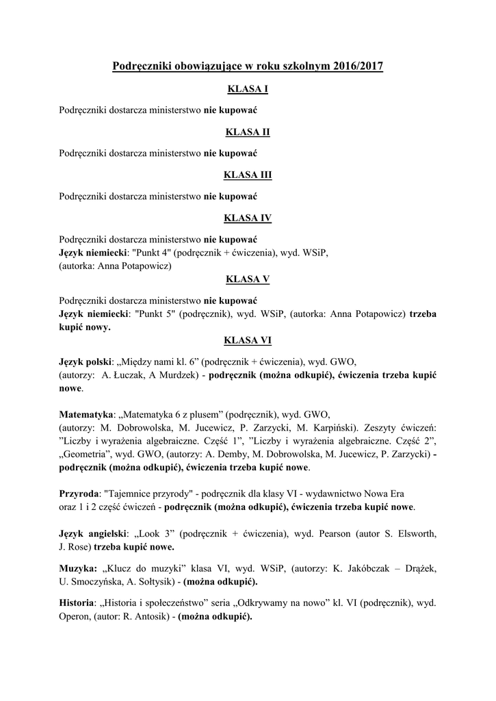 Podręczniki obowiązujące w roku szkolnym 2016/2017 KLASA I Podręczniki dostarcza ministerstwo nie kupować KLASA II Podręczniki dostarcza ministerstwo nie kupować KLASA III Podręczniki dostarcza ministerstwo nie kupować KLASA IV Podręczniki dostarcza ministerstwo nie kupować Język niemiecki: "Punkt 4" (podręcznik + ćwiczenia), wyd. WSiP, (autorka: Anna Potapowicz) KLASA V Podręczniki dostarcza ministerstwo nie kupować Język niemiecki: "Punkt 5" (podręcznik), wyd. WSiP, (autorka: Anna Potapowicz) trzeba kupić nowy. KLASA VI Język polski: „Między nami kl. 6” (podręcznik + ćwiczenia), wyd. GWO, (autorzy: A. Łuczak, A Murdzek) - podręcznik (można odkupić), ćwiczenia trzeba kupić nowe. Matematyka: „Matematyka 6 z plusem” (podręcznik), wyd. GWO, (autorzy: M. Dobrowolska, M. Jucewicz, P. Zarzycki, M. Karpiński). Zeszyty ćwiczeń: ”Liczby i wyrażenia algebraiczne. Część 1”, ”Liczby i wyrażenia algebraiczne. Część 2”, „Geometria”, wyd. GWO, (autorzy: A. Demby, M. Dobrowolska, M. Jucewicz, P. Zarzycki) podręcznik (można odkupić), ćwiczenia trzeba kupić nowe. Przyroda: "Tajemnice przyrody" - podręcznik dla klasy VI - wydawnictwo Nowa Era oraz 1 i 2 część ćwiczeń - podręcznik (można odkupić), ćwiczenia trzeba kupić nowe. Język angielski: „Look 3” (podręcznik + ćwiczenia), wyd. Pearson (autor S. Elsworth, J. Rose) trzeba kupić nowe. Muzyka: „Klucz do muzyki” klasa VI, wyd. WSiP, (autorzy: K. Jakóbczak – Drążek, U. Smoczyńska, A. Sołtysik) - (można odkupić). Historia: „Historia i społeczeństwo” seria „Odkrywamy na nowo” kl. VI (podręcznik), wyd. Operon, (autor: R. Antosik) - (można odkupić).