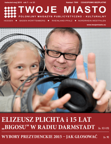 kwiecień-maj 2015 rok 7 – nr 33 Nakład: 7500 czasopismo bezpłatne TWOJE miasto P O L O N I J N Y MA G A Z Y N P u b l i c y s ty c zno - K U L T U R A L N Y Hessen Baden-Württemberg Rheinland-Pfalz Nordrhein-Westfalen Fot. Tomek Czebatul www.twojemiasto.eu EliZEUSZ Plichta i 15 lat „Bigosu” w Radiu Darmstadt Wybory prezydenckie 2015 – jak głosować (s. 12-13) (s. 9) Annette Ballon Rechtsanwältin Rok założenia 1995 • www.biuro-banasch.de Damian Ballon Rechtsanwalt Mamy bogatą ofertę! AUTOKARY DO POLSKI prawo pracy, prawo drogowe, Kindergeld, prawo karne, utrata prawa jazdy, prawo cywilne, inkasso, sprawy powypadkowe Telefon: GŁÓWNY DWORZEC KOLEJOWY WE FRANKFURCIE (069) 23 33 49 Mainzer Landstraße 351-353 telefon: 069 / 67739093 fax: 069 / 67738742 e-mail: [email protected] www.adwokat-frankfurt.pl Stuttgarter Straße Poniedziałek do piątku: 10.00 - 13.00 13.30 - 19.00 Sobota: 10.00 - 14.00 Am Hauptbahnhof PORADY I POMOC PRAWNA W JĘZYKU POLSKIM ACP UNTERNEHMENSBERATUNG GmbH & Co. KG WWW.acp-service.com Langer Weg 18, 60489 Frankfurt am Main Fon: 069. 97609515, 0157. 87034906 ACP Unternehmensberatung GmbH & Co. KG to dla Państwa najlepszy adres, jeżeli chodzi usługi w zakresie księgowości, konsultingu, jak również kierowania zasobami ludzkimi. Nasze długoletnie doświadczenie gwarantuje Państwu profesjonalne usługi na najwyższym poziomie. Umożliwiamy założenie firmy bez zameldowania w Niemczech. Zakładanie firm: ~ doradztwo przy zakładaniu firmy ~ plan biznesowy / koncepcja firmy ~ planowanie inwestycji i rentowność Prowadzenie przedsiębiorstwa, serwis księgowy i biurowy: ~ księgowość finansowa (księgowanie bieżących zdarzeń gospodarczych) ~ obliczanie płac ~ prowadzenie konta pracownika ~ sporządzanie faktur i upomnień dla Państwa firmy ~ kierowanie odpowiednich meldunków do urzędu skarbowego w ramach (§ 6 Nr. 3 i 4 StBerG). ~ prowadzenie bieżącej korespondencji, itd. [email protected] Współpracujący z nami partnerzy: Najważniejszym naszym partnerem, z którym ściśle współpracujemy w sprawach prawnych i podatkowych, jest dla nas Rechtsanwalt Dominik Pacelt. Zobacz: www.rechtsanwalt-pacelt.de Współpraca ta dotyczy w szczególności następujących zagadnień: ~ sporządzanie podatkowych rocznych rozliczeń ~ doradztwo z zakresu prawa podatkowego i prawa pracy ~ reprezentowanie przed organami skarbowymi ~ sprawy prywatne (np. pomocy przy składaniu wniosków zasiłku rodzinnego i wychowawczego wychowawczego, korespondencja, pomoc przy wypełnianiu formularzy) Od redakcji Nasz język polski Często na łamach „Twojego Miasta” piszemy o problemach z nauką języka polskiego w szkołach w Niemczech, a w szczególności w Hesji. Ciągle mamy nadzieję, że sytuacja ulegnie poprawie. W oczekiwaniu na przychylniejszy klimat dla nauczania języka polskiego, będziemy wspierać każdą inicjatywę rodziców, młodzieży, organizacji polonijnych czy stowarzyszeń chrześcijańskich, zmierzającą do organizowania dostępu do jego nauki dla dzieci i młodzieży pochodzenia polskiego. Wsparcie w tej materii obiecał Konsulat Generalny RP w Kolonii, obiecując pomoc wszędzie tam, gdzie znajdzie się kilkunastoosobowa grupa chętna do nauki języka. Na naszej stronie internetowej www.twojemiasto.eu, w dziale „informator – organizacje i instytucje” publikujemy bezpośredni link na stronę konsulatu w Kolonii, gdzie w prosty sposób znajdą Państwo adresy punktów nauki języka polskiego. Już dziś można do nich zgłaszać dzieci i starszą młodzież chcącą uczyć się lub doskonalić język kraju pochodzenia. Tak jak do tej pory, będziemy wspierać wszelkie dążenia do prawa nauczania języka polskiego w szkołach, jako język dodatkowy, a także włączenie go do egzaminu maturalnego jako język do wyboru. Nauczyciele języka polskiego i osoby zaangażowane w tę sprawę mogą korzystać z magazynu „Twoje Miasto” jako miejsca do dyskusji na ten temat zamieszczania swoich uwag itp. Jednocześnie apelujemy do Czytelników zainteresowanych nauką języka polskiego przez swoje dzieci – łączcie się w grupy, korzystajcie z pomocy Konsulatu Generalnego w Kolonii. Jeśli zajdzie taka potrzeba, „Twoje Miasto” deklaruje swoje pośrednictwo w celu uzyskania niezbędnego wsparcia przez polską placówkę konsularną. Christof Kochanski, Michael Kochanski W numerze: s. 4 s. 5 s. 6 s. 7 s. 8 s. 9 s. 10 s. 11 s. 12-13 s. 14 s. 15 s. 16 s. 17 s. 18 s. 18 s. 19 s. 20 s. 21 s. 22 Dubaj – perła Wschodu Dobra książka: „Kulminacje” Janusza Leona Wiśniewskiego Wieści polonijne: odznaczenia dla nauczycieli, Polska partnerem targów Wieści polonijne: kroniki frankfurckie Imprezy Chopinowskie Wybory prezydenckie 2015 – jak i gdzie głosować za granicą? Tyskie – konkurs przepisów kulinarnych Kalejdoskop kulinarny Wywiad z Elikiem Plichtą Horoskop Z pogranicza nauki „Gumowe ucho” Finanse i ubezpieczenia Wspomnienia emigranta Palcem w oko Porady prawne Wywiad z wicekonsulem A. Dudzińskim Motoryzacja: New Warsaw Sport w Twoim Mieście TWOJE MIASTO możesz otrzymać w polskich sklepach w czterech niemieckich landach: Hessen, Baden-Württemberg, Rheinland-Pfalz, Nordrhein-Westfalen. W niedzielę pod polskimi kościołami: Frankfurt nad Menem, Offenbach, Hanau, Mainz, Wiesbaden, Darmstadt, Worms i Mannheim. Redakcja przyjmuje ogłoszenia/reklamy, pobierając opłatę naliczaną od 1 cm2. 1 cm2 = 1,00 €. Najmniejsza wielkość reklamy/ogłoszenia wynosi 50 cm2. Redakcja nie zwraca materiałów niezamówionych, ponadto zastrzega sobie prawo do skrótów i adiustacji tekstów przyjętych do druku. Nie ponosi również odpowiedzialności za treść reklam i ogłoszeń. Przedruki tylko za pisemną zgodą redakcji. Uwaga: Czytelnicy, którzy chcą zapewnić sobie dostarczenie magazynu „Twoje Miasto” do domu, proszeni są o przysłanie na adres redakcji prośby o wysyłkę pod wskazany adres i załączenie zna