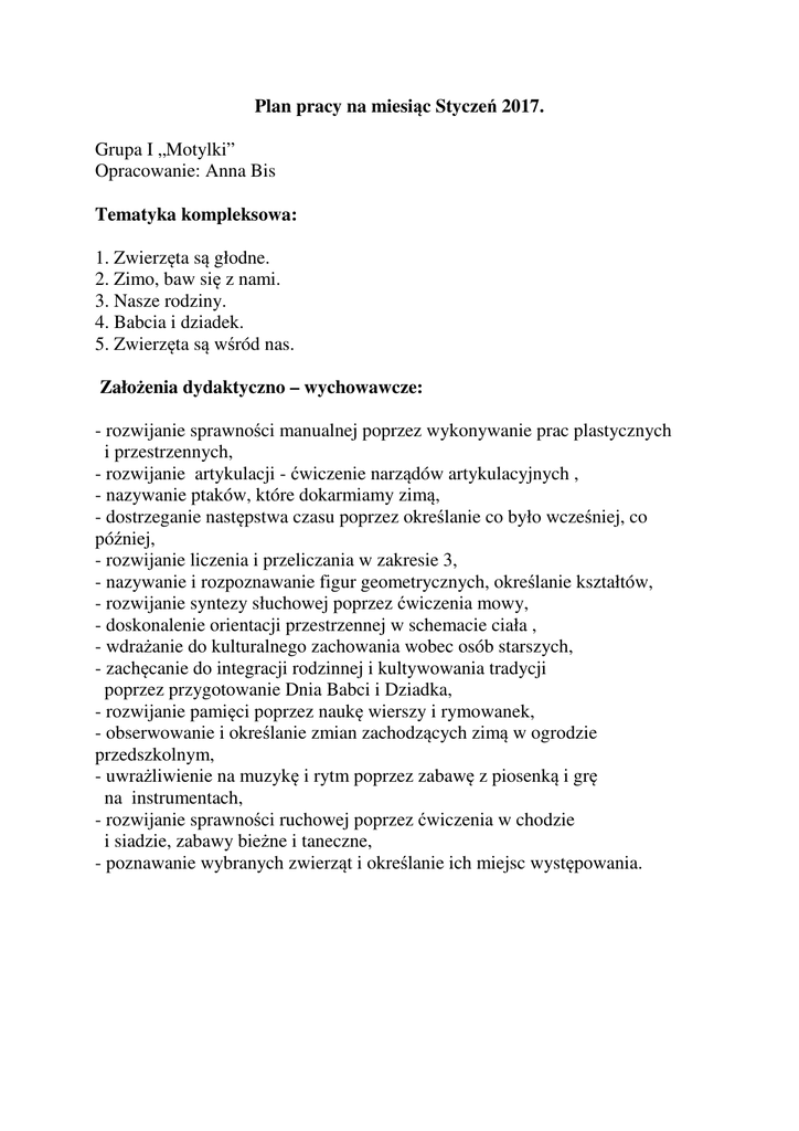 Plan pracy na miesiąc Styczeń 2017. Grupa I „Motylki” Opracowanie: Anna Bis Tematyka kompleksowa: 1. Zwierzęta są głodne. 2. Zimo, baw się z nami. 3. Nasze rodziny. 4. Babcia i dziadek. 5. Zwierzęta są wśród nas. Założenia dydaktyczno – wychowawcze: - rozwijanie sprawności manualnej poprzez wykonywanie prac plastycznych i przestrzennych, - rozwijanie artykulacji - ćwiczenie narządów artykulacyjnych , - nazywanie ptaków, które dokarmiamy zimą, - dostrzeganie następstwa czasu poprzez określanie co było wcześniej, co później, - rozwijanie liczenia i przeliczania w zakresie 3, - nazywanie i rozpoznawanie figur geometrycznych, określanie kształtów, - rozwijanie syntezy słuchowej poprzez ćwiczenia mowy, - doskonalenie orientacji przestrzennej w schemacie ciała , - wdrażanie do kulturalnego zachowania wobec osób starszych, - zachęcanie do integracji rodzinnej i kultywowania tradycji poprzez przygotowanie Dnia Babci i Dziadka, - rozwijanie pamięci poprzez naukę wierszy i rymowanek, - obserwowanie i określanie zmian zachodzących zimą w ogrodzie przedszkolnym, - uwrażliwienie na muzykę i rytm poprzez zabawę z piosenką i grę na instrumentach, - rozwijanie sprawności ruchowej poprzez ćwiczenia w chodzie i siadzie, zabawy bieżne i taneczne, - poznawanie wybranych zwierząt i określanie ich miejsc występowania. Wierszyk: "Życzenia dla babci i dziadka" Czy wy wiecie moi mili, czy wy wiecie, Ile babć i dziadków jest na świecie? Właśnie swoje święto teraz mają, Więc wnukowie im życzenia dziś składają. Uwielbiamy Was, kochamy całym sercem I radości chcemy dać Wam jak najwięcej, Nasze buzie uśmiechnięte dziś życzenia ślą przepiękne: Żyj babuniu, żyj dziaduniu latek sto! Piosenki: 1. "Polka dla babci i dziadka" 1.Dziś w przedszkolu piękny bal, bal wspaniały na sto par. Bal dla dziadków i dla babćpięknie zapraszamy was. Ref. To jest polka dla dziadziusia i dla babci i dla wnusia. kto poleczkę naszą zna, niech zatańczy tak jak ja. / bis 2.Do przedszkola zapraszamy babcię, dziadka, tatę, mamę. Gdy tańczymy polkę wraz, bardzo miło płynie czas. Ref. To jest polka... 2. "Walczyk dla babci i dziadka" Tańczymy dla babci walczyka, Niech niesie się w koło muzyka. Niech płynie muzyka na cały świat, żyj babciu, żyj nam sto lat. Tańczymy dla dziadka walczyka, Niech niesie się w koło muzyka. Niech płynie muzyka na cały świat, żyj dziadku, żyj nam sto lat. (2x) (2x)
