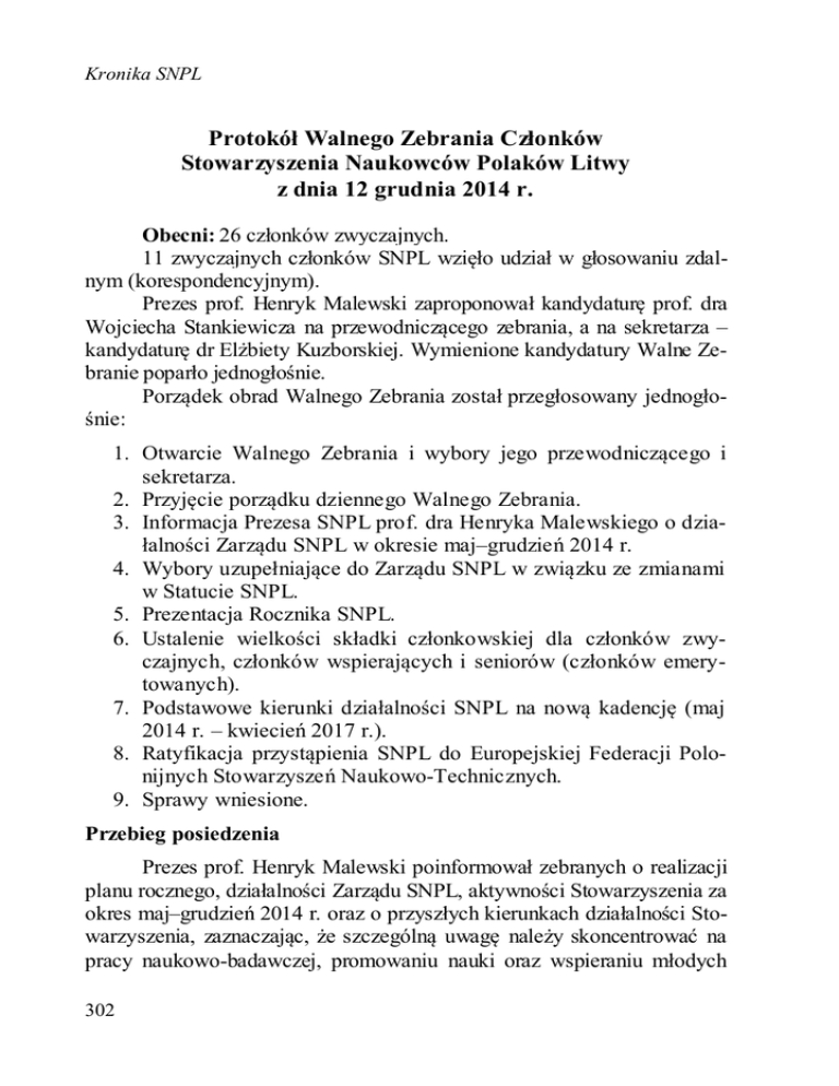 Kronika SNPL Protokół Walnego Zebrania Członków Stowarzyszenia Naukowców Polaków Litwy z dnia 12 grudnia 2014 r. Obecni: 26 członków zwyczajnych. 11 zwyczajnych członków SNPL wzięło udział w głosowaniu zdalnym (korespondencyjnym). Prezes prof. Henryk Malewski zaproponował kandydaturę prof. dra Wojciecha Stankiewicza na przewodniczącego zebrania, a na sekretarza – kandydaturę dr Elżbiety Kuzborskiej. Wymienione kandydatury Walne Zebranie poparło jednogłośnie. Porządek obrad Walnego Zebrania został przegłosowany jednogłośnie: 1. Otwarcie Walnego Zebrania i wybory jego przewodniczącego i sekretarza. 2. Przyjęcie porządku dziennego Walnego Zebrania. 3. Informacja Prezesa SNPL prof. dra Henryka Malewskiego o działalności Zarządu SNPL w okresie maj–grudzień 2014 r. 4. Wybory uzupełniające do Zarządu SNPL w związku ze zmianami w Statucie SNPL. 5. Prezentacja Rocznika SNPL. 6. Ustalenie wielkości składki członkowskiej dla członków zwyczajnych, członków wspierających i seniorów (członków emerytowanych). 7. Podstawowe kierunki działalności SNPL na nową kadencję (maj 2014 r. – kwiecień 2017 r.). 8. Ratyfikacja przystąpienia SNPL do Europejskiej Federacji Polonijnych Stowarzyszeń Naukowo-Technicznych. 9. Sprawy wniesione. Przebieg posiedzenia Prezes prof. Henryk Malewski poinformował zebranych o realizacji planu rocznego, działalności Zarządu SNPL, aktywności Stowarzyszenia za okres maj–grudzień 2014 r. oraz o przyszłych kierunkach działalności Stowarzyszenia, zaznaczając, że szczególną uwagę należy skoncentrować na pracy naukowo-badawczej, promowaniu nauki oraz wspieraniu młodych 302 Rocznik Stowarzyszenia Naukowców Polaków Litwy, 2015, T. 15 adeptów nauki z Wileńszczyzny. H. Malewski zapoznał zebranych o zmianach w Statucie SNPL, który wszedł w życie 15 września 2014 r. po jego rejestracji w Centrum Rejestru Osób Prawnych RL. Mówił o poczynionych krokach mających na celu nadanie Rocznikowi statusu punktowanego pisma naukowego, podsumował budżet konferencji „Rodzinna Europa”. Prezes podziękował wszystkim osobom wspierającym SNPL i wyraził zadowolenie z faktu, że w 2014 r. na konto SNPL z tytułu odprowadzonego przez osoby fizyczne 2% podatku dochodowego wpłynęło 1600 LTL. Następnie, zgodnie ze zmianami w Statucie SNPL, przeprowadzono wybory uzupełniające do Zarządu. Walne Zebranie jednogłośnie na członków Komisji Skrutacyjnej wybrało: dra Stanisława Majewskiego, dr Gretę Rudziańską, dr Halinę Turkiewicz. Zarząd zaproponował na listę kandydatów w wyborach uzupełniających wciągnąć kandydatury dr Ireny Mikłaszewicz i dra Mirosława Szejbaka. Innych propozycji, w tym i w biuletynach, które przesłały osoby głosujące korespondencyjnie (zdalnie), nie było. Komisja Skrutacyjna przygotowała biuletyny do tajnego głosowania z nazwiskami dr I. Mikłaszewicz i dra M. Szejbaka. Rozdano 26 biuletynów (11 osób głosowało zdalnie). Po przeliczeniu głosów, uwzględniając głosy 11 osób, które głosowały korespondencyjnie (zdalnie), na dra Mirosława Szejbaka oddano 36 głosów (na jednym biuletynie zostało wpisane nazwisko dra S. Majewskiego), a na dr Irenę Mikłaszewicz oddano 37 głosów. Walne Zebranie jednogłośnie zatwierdziło protokół Komisji Skrutacyjnej. W wyborach uzupełniających wybrano do Zarządu dwóch nowych członków – dr Irenę Mikłaszewicz i dra Mirosława Szejbaka (liczba członków Zarządu wzrosła do 9). Członkami Zarządu SNPL są: doc. dr Barbara Dwilewicz, prof. dr Bogusław Grużewski, dr hab. Henryka Ilgiewicz, dr Elżbieta Kuzborska, prof. dr Henryk Malewski, doc. dr Irena Mikłaszewicz, doc. dr Krystyna Moroz-Łapin, prof. dr Wojciech Stankiewicz, dr Mirosław Szejbak. Skarbnik – dr Katarzyna Miksza. Doc. dr Barbara Dwilewicz dokonała prezentacji kolejnego tomu Rocznika SNPL (tom 13/14, 2014), którego główną część stanowią artykuły opracowane na podstawie referatów wygłoszonych na międzynarodowej konferencji naukowej zorganizowanej przez SNPL i Polskie Towarzystwo Myśli Politycznej pt. Rodzinna Europa. Europejska myśl polityczna a wyzwania XXI wieku (9–11 kwietnia 2014 r., Wilno). B. Dwilewicz podkreśliła, że powołanie międzynarodowej Rady Naukowej (jej skład został zamieszczony w Roczniku) ma się przyczynić do podniesienia poziomu merytorycznego wydawnictwa, zwiększenia zasięgu jego oddziaływania, na303 Kronika SNPL wiązania kontaktów z innymi ośrodkami naukowo-badawczymi. Zarząd planuje w przyszłości zamieszczać i udostępniać artykuły naukowe i inne materiały Rocznika również w formie elektronicznej. W związku ze zmianami statutowymi oraz wprowadzeniem na Litwie europejskiej waluty (euro) Zarząd zaproponował wprowadzenie zmian w opłacaniu składek członkowskich. Walne Zebranie poparło propozycję Zarządu i ustaliło następującą wysokość rocznej składki członkowskiej: członek zwyczajny – 10 euro; członek stowarzyszony – 5 euro; senior (członek emerytowany) – 1 euro. Zebranie przez aklamację przyjęło tę uchwałę. Dr Elżbieta Kuzborska przedstawiła podstawowe kierunki działalności SNPL na okres maj 2014 – kwiecień 2017 (Zarys działalności Zarządu na obecną kadencję był przegłosowany na Zarządzie i jest zamieszczony na stronie internetowej SNPL). Podstawowymi kierunkami działalności Stowarzyszenia pozostają: realizacja celów statutowych, aktywizacja działalności naukowej, udział w projektach naukowo-badawczych, organizacja konferencji naukowych, regularne wydawanie Rocznika SNPL, współpraca międzynarodowa, propagowanie nauki i popieranie młodych adeptów wybierających ścieżkę naukową. Zebranie jednogłośnie zaaprobowało podstawowe kierunki działalności Stowarzyszenia na kadencję. Prof. dr B. Grużewski zaprezentował działalność EFPSNT, zaznaczając, że przystąpienie SNPL do Federacji oznacza wejście na poziom europejsk