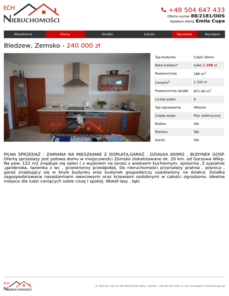 +48504647433 Ofertanumer88/2181/ODS OpiekunofertyEmilaCupa Mieszkania Domy Działki Lokale Sprzedaż Wynajem Bledzew,Zemsko-240000zł Typbudynku Częśćdomu Ratakredytu* tylko1288zł Powierzchnia 180m2 Cena/m2 1333zł Powierzchniadziałki 871.00m2 Liczbapokoi 4 Typogrzewania Własne Ciepławoda Piecelektryczny Balkon Tak Piwnica Tak Garaż Tak PILNA SPRZEDAŻ - ZAMIANA NA MIESZKANIE Z DOPŁATĄ.GARAŻ , DZIAŁKA 600M2 , BUDYNEK GOSP. OfertąsprzedażyjestpołowadomuwmiejscowościZemskozlokalizowaneok.20km.odGorzowaWlkp. Napow.122m2znajdujesięsalon(zwyjściemnataras)zaneksemkuchennym,spiżarnia,3sypialnie ,garderoba, łazienka z wc , przestronny przedpokój. Do nieruchomości przynależy pralnia , piwnica , garaż znajdujący się w bryle budynku oraz budynek gospodarczy usadowiony na działce. Działka zagospodarowana nasadzeniami owocowymi oraz krzewami ozdobnymi w całości ogrodzona. Idealne miejscedlaludziceniącychsobieciszęispokój.Wokółlasy,łąki. ul.MieszkaI-go2/3,66-400GorzówWlkp.,telefon:+48504647443,e-mail:[email protected]