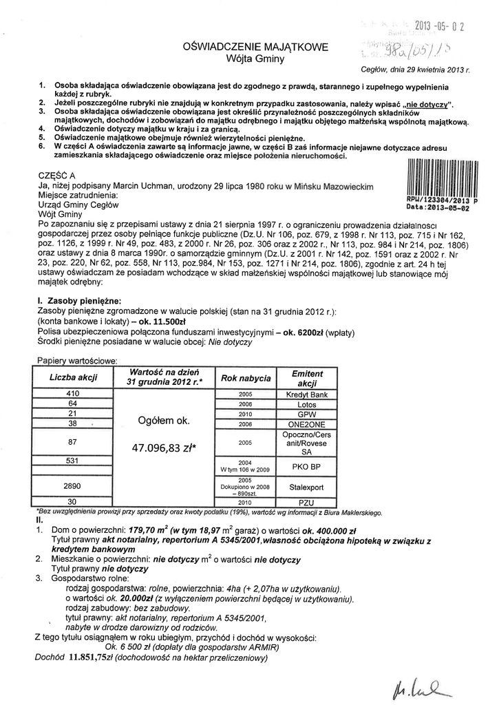 , oŚWlADcZEN lE MAJĄTKoWE Wójta Gminy 'l. 2. 3' 4. 5. 6. ': ' ,,,,,, ,?0ĺ3 ;Ü5_ 0 2 '!jP"/ł,5-l ,/ 5 Ce$fw, dnia 29 kwietnia 2013 r. osoba składająca oświadczenieobowiązana jest do zgodnego z prawdą, starannego i zupełnego wypełnienia każdej z rubryk. Jeżell poszczególne-rubryki nie znajdują w konkretnym pzypadku zastosowania, należy wpisać ,,11i41ygy''' osoba składająca oświadczenieobowiązana jest określićprzynależnośó poszczególnych srładnĺxów 1ajątkowych, dochodów i zobowiązań do majątku odrębnego i majątku objętego maľżeńską wspólnoĘ majątkową. oświadczenie dotyczy majątku w kraju i za granicą. oświadczenle majątkowe obejmuje równĺeżwierzytelnościpieniężne. W częściA oświadczenia zawaÉe są informacje jawne, w częściB zaśinformacje niejawne dotyczące adresu zamieszkania składającego oświadczenie oraz miejsce czĘŚl A Ja, niżej podpisany Marcin Uchman, urodzony 29 lipca 19 Miejsce zatrudnienia: Urząd Gminy Cegłlw Wójt Gminy Po zapoznanĺu się z pzepisami ustawy z dnia 21 sierpnia 1997 r. o ograniczeniu prowadzenia działalnoscl gospodarczej przez osoby pďniące funkcje publiczne (Dz.U. Nr 106, poz.679, z 1998 r. Nr 1 13, poz.715 i Nr 'ĺ62, poz.1126,z 1999 r. Nr49, poz.483,z2000 r. Nr26, poz. 306 orazz2002r', Nr'ĺ13, poz. 984 i Nr214, poz. 1806) oraz ustawy zdnia 8 marca 1990r. o samoządzie gminnym (Dz.U. z2001r. Nr 142, poz. 1591 orazz2002 r. Nr 23,po2.220,Nr62,po2.558,Nr113,po2.984,Nr153,po2.1271iNr214,po2. 1806),zgodniezart.24htej ustawy oświadczam że posĺadam wchodzące w skład małżeńskiejwspilnoŚci majątkowej lub stanowiące mlj majątek odrębny: l. Zasoby pieniężne: Zasoby pienięŻne zgromadzone wwalucie polskiej (stan na 31 grudnia 2012r'): (konta bankowe i lokaty) - ok. 11.500zł Polisa ubezpieczeniowa połączona funduszami inwestycyjnymi- ok. 6200zł (wpłaty) Srodki pienięŻne posiadane w walucie obcej: Nie dotyczy rtery wa rtościowe: Liczba akcji WałŤośćna dzień 31 grudnÍa 2012 r." Rok nabycia 410 64 2006 ogďem ok. 38 87 47.096,83 zł* 20'10 GPW 2006 ONE2ONE 2005 Opoczno/Cers aniURovese SA 531 Wtym 2004 106 w 2009 2005 2890 Dokupiono w 2008 - 89oszt. 30 2010 prowizji przy spnedaży oraz !1. Kredvt Bank Lotos 2005 21 kwoý Emitent akcji PKO BP Stalexport PZU wartośćWg informacji zz Biura Maklerskiego. Dom o powiezchni 179,70 m' (w tym 18,97 m2 garaŻ) o wartościok.400.000 zł Tytuł prawny ak notarialny, repertorium A 5345/2001,własnośćobciążona hipoteką w związku 1. kredyten banhowym 2. 3. Mieszkanie o powierzchni: nie dotyczy m2 o wartości nie dotyczy Tytuł prawny nie doýczy Gospodarstwo rolne: rodzďJ gospodarstwa: rolne, powieŻchnia 4ha (+ 2,07ha w użýRowaniu). o wartości ok. 20.000zl (z wyłączeniem powierzchni będącejw uŻytkowaniu). rodzĄ zabudowy: bez zabudowy' ' Ztego Doch tytuł prawny: akt notarialny, repertorium A 5345/2001, nabýe w drodze darowizny od rodziclw. tytułu osĺągnąłemw roku ubiegłym, pzychÓd idochld w wysokości: ok' 6 500 zł (dopłaty dla gospodarstw ARMIR) 1|.85|,7 5zł (dochodowoŚć n a hektar przel icze n iowy) ld z 4. lnne nieruchomoŚci: Działka budowlana: powiezchnia 1026 m2 o wartości:ok. 80.000zł(z wyłączeniem waĺtościdomu) tytuł prawny akt notarialny, repertorium A 5345/2001 własnośćobciążona hipoteką w związku z kredytem bankowym nabyta w drodze darowizny od rodziclw. Budowa domu zakończona w 2012 roku. il!. Posiadam udziały w spÓłkach handlowych - nalezy podai liczbę i emitenta udziałow: nie dotyczy udziały te stanowĺą pakĺet większy niŻ 10o/o udziałów w spÓłce: nie dotyczy z tego tytułu osiągnąłem w roku ubiegłym dochÓd w wysokości: nie dotyczy IV. - Posiadam akcje w innych społkach naleŻy podać liczbę i emitenta akc] LÍczba akcji Emitent akcji 410 Kredvt Bank 21 GPW 64 Lotos 38 87 ONE2ONE Opoczno/CersaniURovese SA 531 PKO BP 2890 30 Stalexport PZU akcje te stanowią pakiet większy niŻ 10% udziałlw w spďce: nie Z tego tytułu osiągnąłem w roku 2012 następujące przychody: Nie doýczy doýczy V. Nabyłem (mlj małŻonek nabył, zwyłączeniem mienia przyna\eŻnego do jego majątku)od Skarbu Państwa' ĺnnej osoby prawnej, jednostek samoządu terytorialnego, ich związkÓw lub od komunalnej osoby prawnej następujące mienie, które podległo zbyciu w drodze przetargu - naleŻy podal opis mĺenia i datę nabycia, od kogo: nie dotyczy VI. 1. Prowadzę działalnoŚć gospodarczą (należy podai formę prawną i przedmiot działalnoŚci): nie dotyczy nie dotyczy wspllnĺe z innymi osobami nÍe doýczy Z tego tytułu osiągnąłem w roku ubiegłym przychid i dochid w wysokoŚci: nie dotyczy Zarządzam działalnościągospodarcząlubjestem przedstawicielem, pďnomocnikiem takiej dzĺałalnoŚci (nalezy - osobiŚcie - 2. podać formę prawną i przedmiot dzĺałalnoŚci): nie dotyczy - osobiścienie doýczy - wspÓlnie z innymi osobami nie doýczy Z tego tytułu osiągnąłem w roku ubiegłym przychód i dochÓd w wysokoŚci: nie dotyczy vll. 1' W spółkach handlowych (nazwa, siedziba spÓłki): nie dotyczy - jestem członkiem zarządu (od kiedy): nie dotyczy - jestem członkiem rady nadzorczej (od kiedy): nie dotyczy - jestem komisji rewizyjnej (od kiedy): nie doýczy Ztego tytułu osiągnąłem w roku ubiegłym dochÓd w wysokości: nie doýczy W spółdzielniach (nazwa, siedziba spiłki): nie dotyczy - jestem członkiem zarządu (od kiedy): nie dotyczy - jestem członkiem rady nadzorczej (od kiedy): rtie dotyczy - jestem komisji rewizyjnej (od kiedy): nie dotyczy Ztego tytułu osiągnąłem w roku ubiegłym dochid w wysokości: nie doýczy 3. W fundacjach prowadzących działalnoŚl gospodarczą (nazwa, siedziba spółki): nie dotyczy - jestem członkiem zarządu (od kiedy): nie doýczy - jestém członkiem rady nadzorczej (od kiedy): nie dotyczy - jestem komisji rewizyjnej (od kiedy): nie dotyczy Ztego tytułu osiągnąłem w roku ubiegłym dochÓd w wysokoŚci