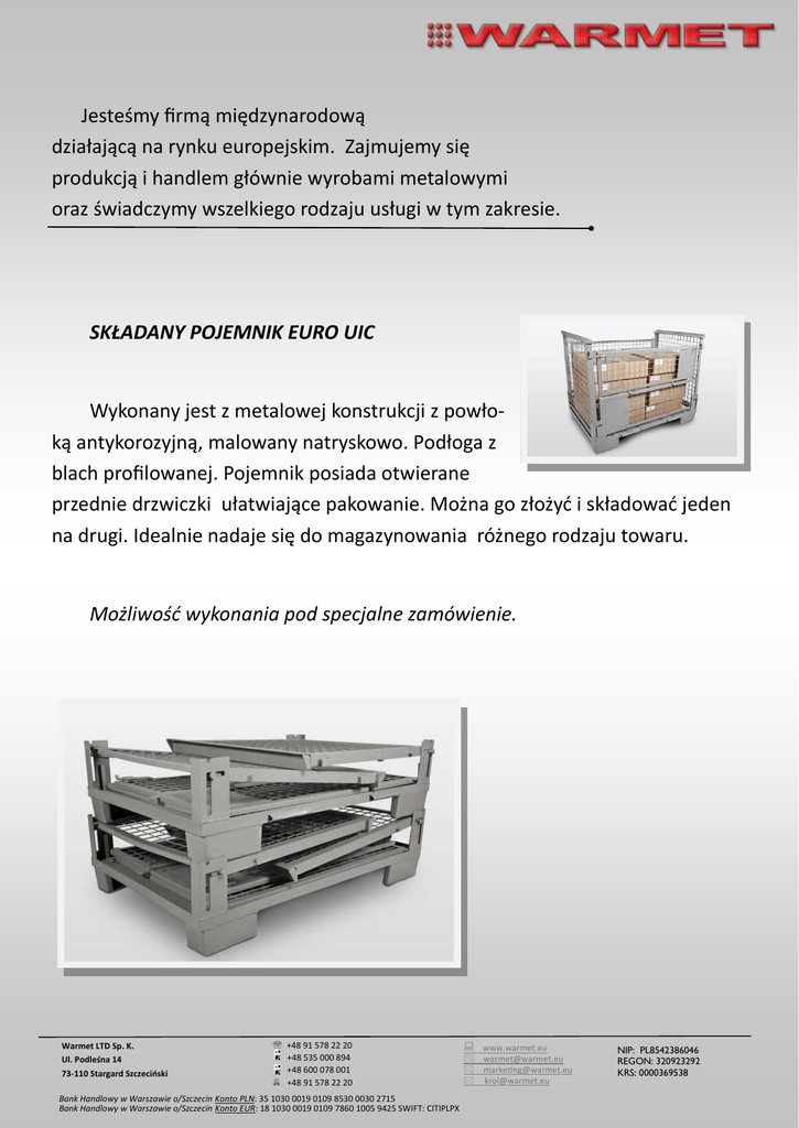 Jesteśmy firmą międzynarodową działającą na rynku europejskim. Zajmujemy się produkcją i handlem głównie wyrobami metalowymi oraz świadczymy wszelkiego rodzaju usługi w tym zakresie. SKŁADANY POJEMNIK EURO UIC Wykonany jest z metalowej konstrukcji z powłoką antykorozyjną, malowany natryskowo. Podłoga z blach profilowanej. Pojemnik posiada otwierane przednie drzwiczki ułatwiające pakowanie. Można go złożyć i składować jeden na drugi. Idealnie nadaje się do magazynowania różnego rodzaju towaru. Możliwość wykonania pod specjalne zamówienie. Warmet LTD Sp. K. Ul. Podleśna 14 73-110 Stargard Szczeciński +48 91 578 22 20 +48 535 000 894 +48 600 078 001 +48 91 578 22 20 Bank Handlowy w Warszawie o/Szczecin Konto PLN: 35 1030 0019 0109 8530 0030 2715 Bank Handlowy w Warszawie o/Szczecin Konto EUR: 18 1030 0019 0109 7860 1005 9425 SWIFT: CITIPLPX www.warmet.eu [email protected] [email protected] [email protected] NIP: PL8542386046 REGON: 320923292 KRS: 0000369538 Model Wymiary (cm) Wymiary po złożeniu (cm) Ładowność (kg) Waga (kg) Symbol Cena brutto 120x80x97 120x80x30 800 60 1800-120 469,00 zł EURO UIC Warmet LTD Sp. K. Ul. Podleśna 14 73-110 Stargard Szczeciński +48 91 578 22 20 +48 535 000 894 +48 600 078 001 +48 91 578 22 20 Bank Handlowy w Warszawie o/Szczecin Konto PLN: 35 1030 0019 0109 8530 0030 2715 Bank Handlowy w Warszawie o/Szczecin Konto EUR: 18 1030 0019 0109 7860 1005 9425 SWIFT: CITIPLPX www.warmet.eu [email protected] [email protected] [email protected] NIP: PL8542386046 REGON: 320923292 KRS: 0000369538 NADSTAWKI NA PALETY Solidna metalowa konstrukcja, ocynkowana galwanicznie. Pręt o Ø 4 cm, oczka o wymiarze 5,5cm x 12cm. Nasadzane na europaletę o wymiarach 120x80cm. Nadstawki przeznaczone są do magazynowania i transportu różnego rodzaju towarów. Możliwość składowania jednej na drugą do 4 szt. maksymalnie, pozwala zaoszczędzić miejsca. Nadstawka H850 posiada otwierany jeden bok dla łatwiejszego pakowania towaru. Możliwe jest wykonanie nadstawek według zamówienia klienta. Warmet LTD Sp. K. Ul. Podleśna 14 73-110 Stargard Szczeciński +48 91 578 22 20 +48 535 000 894 +48 600 078 001 +48 91 578 22 20 Bank Handlowy w Warszawie o/Szczecin Konto PLN: 35 1030 0019 0109 8530 0030 2715 Bank Handlowy w Warszawie o/Szczecin Konto EUR: 18 1030 0019 0109 7860 1005 9425 SWIFT: CITIPLPX www.warmet.eu [email protected] [email protected] [email protected] NIP: PL8542386046 REGON: 320923292 KRS: 0000369538 H400 Model Wymiary (cm) Waga (kg) Ładowność (kg) Symbol Cena brutto Nadstawka H850 80x120x85 26 750 01800-010 273,00 zł Nadstawka H400 80x120x400 16 700 01800-020 170,00 zł Warmet LTD Sp. K. Ul. Podleśna 14 73-110 Stargard Szczeciński +48 91 578 22 20 +48 535 000 894 +48 600 078 001 +48 91 578 22 20 Bank Handlowy w Warszawie o/Szczecin Konto PLN: 35 1030 0019 0109 8530 0030 2715 Bank Handlowy w Warszawie o/Szczecin Konto EUR: 18 1030 0019 0109 7860 1005 9425 SWIFT: CITIPLPX www.warmet.eu [email protected] [email protected] [email protected] NIP: PL8542386046 REGON: 320923292 KRS: 0000369538 Informacje dodatkowe Gwarancja: Pojemnik EURO UIC - 5 lat Nadstawki - 12 miesięcy Termin realizacji: do 3 dni po złożonym zamówieniu towar na zamówienie do 4 tygodni Sposób płatności: przedpłata (przy stałej współpracy możliwy termin płatności 7-14 dni) Zamówienie: składane drogą elektroniczną Koszt transportu: Pojemnik EURO UIC 1-5 szt. 125,00 zł brutto (przedpłata) Nadstawka H850 1-25 szt. 164,00 zł brutto (przedpłata) Nadstawka H400 1-50 szt. 164,00 zł brutto (przedpłata) W ofercie naszej firmy znajdą Państwo również: Odwijarki Wózki transportowe Stojaki rowerowe Stojaki na śmieci Nadstawki na palety Warmet LTD Sp. K. Ul. Podleśna 14 73-110 Stargard Szczeciński +48 91 578 22 20 +48 535 000 894 +48 600 078 001 +48 91 578 22 20 Bank Handlowy w Warszawie o/Szczecin Konto PLN: 35 1030 0019 0109 8530 0030 2715 Bank Handlowy w Warszawie o/Szczecin Konto EUR: 18 1030 0019 0109 7860 1005 9425 SWIFT: CITIPLPX www.warmet.eu [email protected] [email protected] [email protected] NIP: PL8542386046 REGON: 320923292 KRS: 0000369538