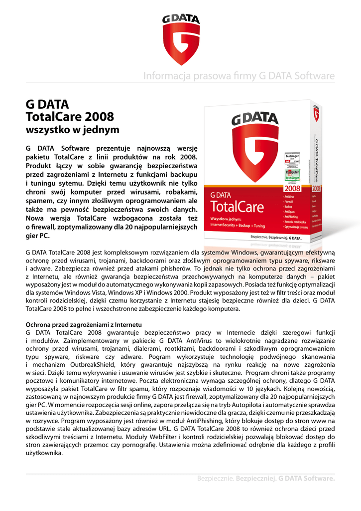 Informacja prasowa firmy G DATA Software G DATA TotalCare 2008 wszystko w jednym G DATA Software prezentuje najnowszą wersję pakietu TotalCare z linii produktów na rok 2008. Produkt łączy w sobie gwarancję bezpieczeństwa przed zagrożeniami z Internetu z funkcjami backupu i tuningu sytemu. Dzięki temu użytkownik nie tylko chroni swój komputer przed wirusami, robakami, spamem, czy innym złośliwym oprogramowaniem ale także ma pewność bezpieczeństwa swoich danych. Nowa wersja TotalCare wzbogacona została też o firewall, zoptymalizowany dla 20 najpopularniejszych gier PC. G DATA TotalCare 2008 jest kompleksowym rozwiązaniem dla systemów Windows, gwarantującym efektywną ochronę przed wirusami, trojanami, backdoorami oraz złośliwym oprogramowaniem typu spyware, riksware i adware. Zabezpiecza również przed atakami phisherów. To jednak nie tylko ochrona przed zagrożeniami z Internetu, ale również gwarancja bezpieczeństwa przechowywanych na komputerze danych – pakiet wyposażony jest w moduł do automatycznego wykonywania kopii zapasowych. Posiada też funkcję optymalizacji dla systemów Windows Vista, Windows XP i Windows 2000. Produkt wyposażony jest też w filtr treści oraz moduł kontroli rodzicielskiej, dzięki czemu korzystanie z Internetu stajesię bezpieczne również dla dzieci. G DATA TotalCare 2008 to pełne i wszechstronne zabezpieczenie każdego komputera. Ochrona przed zagrożeniami z Internetu G DATA TotalCare 2008 gwarantuje bezpieczeństwo pracy w Internecie dzięki szeregowi funkcji i modułów. Zaimplementowany w pakiecie G DATA AntiVirus to wielokrotnie nagradzane rozwiązanie ochrony przed wirusami, trojanami, dialerami, rootkitami, backdoorami i szkodliwym oprogramowaniem typu spyware, riskware czy adware. Pogram wykorzystuje technologię podwójnego skanowania i mechanizm OutbreakShield, który gwarantuje najszybszą na rynku reakcję na nowe zagrożenia w sieci. Dzięki temu wykrywanie i usuwanie wirusów jest szybkie i skuteczne. Program chroni także programy pocztowe i komunikatory internetowe. Poczta elektroniczna wymaga szczególnej ochrony, dlatego G DATA wyposażyła pakiet TotalCare w filtr spamu, który rozpoznaje wiadomości w 10 językach. Kolejną nowością, zastosowaną w najnowszym produkcie firmy G DATA jest firewall, zoptymalizowany dla 20 najpopularniejszych gier PC. W momencie rozpoczęcia sesji online, zapora przełącza się na tryb Autopilota i automatycznie sprawdza ustawienia użytkownika. Zabezpieczenia są praktycznie niewidoczne dla gracza, dzięki czemu nie przeszkadzają w rozrywce. Program wyposażony jest również w moduł AntiPhishing, który blokuje dostęp do stron www na podstawie stale aktualizowanej bazy adresów URL. G DATA TotalCare 2008 to również ochrona dzieci przed szkodliwymi treściami z Internetu. Moduły WebFilter i kontroli rodzicielskiej pozwalają blokować dostęp do stron zawierających przemoc czy pornografię. Ustawienia można zdefiniować odrębnie dla każdego z profili użytkownika. Bezpiecznie. Bezpieczniej. G DATA Software. G DATA Backup – zabezpieczenie danych Kopie zapasowe to codzienność dla średnich firm i przedsiębiorstw. Wielu użytkowników indywidualnych nie korzysta jednak z tej formy zabezpieczania danych. Regularne wykonywanie kopii zapasowych w znacznej mierze podnosi standard bezpieczeństwa danych. Użytkownicy domowi coraz częściej przechowują na komputerach dane istotne z najróżniejszych względów - zeznania podatkowe, prywatną korespondencję czy chociażby zdjęcia pierwszych kroków stawianych przez dzieci. W przypadku poważnej awarii dysku lub kradzieży notebooka nie ma możliwości odzyskania plików. TotalCare oferuje narzędzie do wykonywana automatycznych kopii zapasowych. Zabezpieczenie danych jest możliwe za pomocą kilku kliknięć myszką. Harmonogram kopii zapasowych umożliwia zaplanowanie automatycznego wykonywania kopii wybranych plików i ich uaktualniania. G DATA Backup sporządza pełne kopie wskazanych danych, a oprócz tego potrafi uaktualniać zawartość kopii metodą różnicową lub przyrostową. G DATA Backup obsługuje standardowe nośniki danych czyli wbudowane dyski twarde, jak i dyski wymienne oraz nośniki pamięci USB. Kopie zapasowe można automatycznie wysyłać na serwer FTP. W cenie programu G DATA Software zapewnia bezpłatne konto na serwerze FTP o rozmiarze 1 GB. G DATA Tuning – Optymalizacja Windows G DATA Tuning służy do optymalizacji ustawień systemów Windows Vista, XP oraz 2000. Narzędzie skanuje komputer w poszukiwaniu potencjalnych problemów i optymalizuje system zgodnie z preferencjami. Zintegrowane narzędzie do defragmentacji dysków twardych pozwala przyspieszyć pracę dysku twardego i zapobiec wystąpieniu awarii. G DATA Tuning usuwa niepotrzebne pliki tymczasowe zapisywane przez różne aplikacje. Naprawia także błędy w rejestrze systemu. Dzięki temu zwiększa się stabilność i szybkość działania systemów operacyjnych Windows Vista, XP oraz 2000. Aktualizacja i pomoc techniczna Cyber-przestępcy nie tracą czasu – stale tworzą nowe szkodliwe programy, coraz trudniejsze do wykrycia i usunięcia. Dlatego szczególnie istotna jest bieżąca aktualizacja programu antywirusowego. Użytkownicy, którzy kupią pakiet G DATA TotalCare 2008, zyskują dostęp do darmowej aktualizacji plików programu i baz sygnatur wirusów przez cały rok. Dodatkowo mogą korzystać z pomocy technicznej, dostępnej zarówno za pośrednictwem telefonu jak i poczty elektronicznej. Specyfikacja • Obsługa systemów Windows Vista (32-bit oraz 64-bit) • G DATA AntiVirus z ulepszoną technologią podwójnego skanowania oraz mechanizmem OutbreakShield • Ochrona poczty w programach Outlook, Outlook Express, Thunderbird, The Bat, Opera itd. (POP3 oraz IMAP) • G DATA Firewall zoptymalizowany dla 20 najpopularniejszych gier PC • Blokowanie ataków typu DoS, Ping of Death, blokada skanowania portów