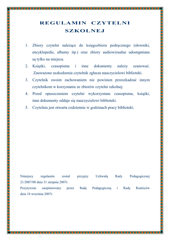REGULAMI N CZYTELNI SZKOLNEJ 1. Zbiory czytelni należące do księgozbioru podręcznego (słowniki, encyklopedie, albumy itp.) oraz zbiory audiowizualne udostępniane są tylko na miejscu. 2. Książki, czasopisma i inne dokumenty należy szanować. Zauważone uszkodzenia czytelnik zgłasza nauczycielowi biblioteki. 3. Czytelnik swoim zachowaniem nie powinien przeszkadzać innym czytelnikom w korzystaniu ze zbiorów czytelni szkolnej. 4. Przed opuszczeniem czytelni wykorzystane czasopisma, książki, inne dokumenty oddaje się nauczycielowi biblioteki. 5. Czytelnia jest otwarta codziennie w godzinach pracy biblioteki. Niniejszy regulamin został przyjęty Uchwałą Radę Pedagogiczną Rady Pedagogicznej 21/2007/08 dnia 31 sierpnia 2007r. Pozytywnie zaopiniowany dnia 18 września 2007r. przez i Radę Rodziców REGULAMIN KORZYSTANIA ZE STANOWISK KOMPUTEROWYCH BIBLIOTEKI 1. Ze sprzętu komputerowego uczniowie korzystają za zgodą nauczyciela bibliotekarza. Użytkownik powinien wpisać się do zeszytu odwiedzin. 2. Dla komfortu wszystkich użytkowników w czytelni należy zachować ciszę. 3. U dyżurnego bibliotekarza można osobiście dokonywać rezerwacji stanowiska komputerowego. 4. Z komputerów można korzysta po zapoznaniu się z instrukcją BHP stanowiska pracy i jedynie w celach edukacyjnych. 5. Nie można wykorzystywać komputerów do prowadzenia prywatnej korespondencji (e-mail) lub do gier i zabaw. Korzystać można tylko z zainstalowanych programów. 6. Zabrania się instalowania innych programów i dokonywania zmian w już istniejących oprogramowaniach. Do pracowni nie można wnosić własnych dyskietek, płyt CD oraz jakiegokolwiek oprogramowania. 7. Wszelki uszkodzenia lub nieprawidłowości w pracy komputerów należy zgłaszać natychmiast dyżurnemu bibliotekarzowi. 8. W przypadku stwierdzenia naruszenia obowiązujących zasad, dyżurny bibliotekarz, administrator sieci ma prawo do natychmiastowego przerwania sesji użytkownika. 9. Użytkownicy ponoszą odpowiedzialność finansową za szkody spowodowane niewłaściwym użytkowaniem sprzętu komputerowego. 10.Po zakończeniu pracy stanowisko komputerowe należy pozostawić w idealnym porządku, zgłosić zakończenie pracy bibliotekarzowi i nie wyłączać samodzielnie komputera. INSTRUKCJA BHP NA STANOWISKU PRACY Z KOMPUTEREM I DRUKARKĄ Uczniowie mogą korzystać z komputerów tylko pod nadzorem nauczyciela. Czas pracy dzieci i młodzieży przy komputerach nie może przekraczać 45 minut. Po każdej lekcji uczniowie muszą mieć przerwę w pracy na stanowisku z komputerem. Na stanowisku komputerowym z urządzeniami peryferyjnymi mogą pracować pracownicy, którzy ukończyli 18 rok życia, posiadają zaświadczenie lekarskie bez przeciwwskazań zdrowotnych oraz niezbędne kwalifikacje do posługiwania się w/w urządzeniami i po odbyciu szkolenia bhp zostali upoważnieni przez bezpośredniego przełożonego do pracy na danym stanowisku. Na stanowisku pracy z komputerem obowiązują zakazy: Zakaz pracy bezpośrednio przy monitorze ekranowym kobiecie w całym okresie ciąży ze względu na ryzyko poronienia. Zakaz spożywania posiłków na stanowisku pracy. palenia tytoniu w pomieszczeniu z komputerem. Zakaz przechowywania na stanowisku cieczy łatwopalnych. Zakaz samodzielnego dokonywania napraw urządzeń komputerowych. Zakaz pracy na stanowisku osób nieupoważnionych. Zakaz przechowywania na stanowisku pracy magnesów i metali magnesowych jak również noszenia biżuterii magnetycznej w czasie pracy zagrażającej trwałości zapisów magnetycznych. CZYNNOŚCI PRZYGOTOWAWCZE NA STANOWISKU. Przed rozpoczęciem pracy pracownik powinien: 1. Wywietrzyć dokładnie pomieszczenie. 2. Dostosować biurko, krzesło i podnóżek do wymiarów swojego ciała. 3. Sprawdzić kompletność technicznego wyposażenia. 4. Sprawdzić czy otwory wentylacyjne komputera i urządzeń komputerowych są oddalone od innych przedmiotów lub ścian min. 10 cm. 5. Wyregulować ustawienie ekranu monitora oraz jego obrót i nachylenie tak, aby górny brzeg ekranu był na wysokości oczu lub poniżej. 6. Przygotować komputer do pracy, wyregulować jasność i kontrast między znakami i tłem w zależności od potrzeb i aktualnych warunków otoczenia, w razie potrzeby zastosować filtr lub ekran ochronny. 7. Przygotować dokumenty niezbędne do pracy w taki sposób, aby odległość pomiędzy monitorem a dokumentami nie przekraczała 50 – 90 cm Zbyt duże odległości mogą powodować akomodacje oczu prowadzą do zmęczenia wzroku, zaburzenia widzenia, pieczenie oczu i bóle głowy. II. CZYNNOŚCI KOŃCOWE NA STANOWISKU Po skończonej pracy pracownik powinien: 1. Wyłączyć komputer, monitor, drukarkę i inne urządzenia oraz sprzęt stanowiskowy zasilany energią elektryczną. 2. Zetrzeć kurz miękką szmatką z powierzchni blatu biurka, monitora oraz podłączonych urządzeń i sprzętu. Nie wolno: - czyścić na mokro obudowy komputera będącego pod napięciem; - używać do czyszczenia rozpuszczalników; - przykrywać urządzenia pokrowcami. III. PRZERWY NA STANOWISKU PRACY Dla utrzymania kondycji zdrowotnej oraz zdolności koncentracji zaleca się osobom pracującym przy monitorach ekranowych przerwy odpoczynkowe. Przerwy odpoczynkowe organizują sobie sami pracownicy. Toruń, dnia 29 października 2007 roku