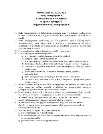 Uchwała Nr 3/2011/2012 Rady Pedagogicznej Gimnazjum nr 1 w Chełmży w sprawie przyjęcia Regulaminu Rady Pedagogicznej 1. Rada Pedagogiczna jest kolegialnym organem szkoły w zakresie realizacji jej działań statutowych dotyczących kształcenia oraz sprawowania wychowania i opieki. 2. Rada Pedagogiczna uczestniczy w rozwiązywaniu spraw wewnętrznych gimnazjum oraz może występować do Kuratora z wnioskami o zbadanie i dokonanie oceny działalności gimnazjum, jej Dyrektora lub innego nauczyciela zatrudnionego w szkole. 3. Przewodniczącym rady pedagogicznej jest Dyrektor szkoły. 4. Przewodniczący Rady w szczególności: a) przygotowuje, zwołuje i prowadzi posiedzenia Rady; b) podpisuje opinie oraz uchwały Rady; c) dokonuje podziału zadań między członkami Rady, koordynuje ich pracę; d) dokonuje podziału zadań między członkami Rady, koordynuje ich pracę; e) zapoznaje i wyjaśnia członkom Rady obowiązujące przepisy prawa oświatowego; f) czuwa nad prawidłową i terminową realizacją zadań, uchwał i wniosków Rady; g) dba o podejmowanie optymalnych decyzji, uchwał i wniosków; h) sprzeciwia się i zawiesza uchwały Rady niezgodne z przepisami prawa oświatowego; 5. Dyrektor Szkoły przedstawia Radzie Pedagogicznej, nie rzadziej niż dwa razy w roku szkolnym, ogólne wnioski wynikające ze sprawowania nadzoru pedagogicznego oraz informacje o działalności szkoły. 6. W przypadku nieobecności Dyrektora szkoły, przewodniczącym Rady zostaje wicedyrektor lub inna osoba sprawująca funkcję kierowniczą w szkole. 7. W skład Rady Pedagogicznej wchodzą Dyrektor Gimnazjum i wszyscy nauczyciele i pracownicy pedagogiczni zatrudnieni w szkole. 8. W zebraniach Rady Pedagogicznej mogą także mogą brać udział z głosem doradczym osoby zaproszone przez jej przewodniczącego, za zgodą lub na wniosek członków Rady. 9. Zebrania Rady Pedagogicznej organizowane są: a) przed rozpoczęciem roku szkolnego b) w każdym semestrze w związku z zatwierdzeniem wyników klasyfikowania i promowania uczniów c) po zakończeniu rocznych zajęć szkolnych d) w miarę bieżących potrzeb e) w miarę potrzeb zebrania mogą być organizowane na wniosek Kuratora, organu prowadzącego, z inicjatywy przewodniczącego Rady Pedagogicznej albo co najmniej 1/3 członków Rady Pedagogicznej. 10. Przewodniczący zwołuje, przygotowuje i prowadzi zebranie Rady Pedagogicznej oraz jest odpowiedzialny za zawiadomienie wszystkich jej członków o terminie i porządku zebrania zgodnie z Regulaminem Rady Pedagogicznej. 11. Ogłoszenia dotyczące terminu posiedzenia Pady Pedagogicznej są publikowane zarówno na tablicy ogłoszeń w pokoju nauczycielskim i na szkolnej stronie internetowej co najmniej tydzień przez zaplanowanym posiedzeniem. 12. Dopuszcza się możliwość, z przyczyn istotnych dla właściwego funkcjonowania szkoły, zwoływania posiedzeń Rady w trybie nadzwyczajnym, z pominięciem wymagań określonych w pkt. 11. W przypadku takim informacja o terminie i porządku posiedzenia może być podana tylko w formie zawiadomienia na tablicy ogłoszeń w pokoju nauczycielskim. 13. Rada Pedagogiczna może głosować zarówno w sposób jawny, jak i tajny. 14. Głosowanie jawne przeprowadza Przewodniczący Rady Pedagogicznej lub osoba przez niego wyznaczona. W głosowaniu jawnym członkowie Rady głosują przez podniesienie ręki. 15. Głosowanie tajne przeprowadza dwuosobowa komisja skrutacyjna wyłoniona spośród członków grona pedagogicznego i zatwierdzona w drodze jawnego głosowania. W głosowaniu tajnym członkowie Rady głosują kartami do głosowania przygotowanymi przez komisję. 16. Głosowanie jawne przeprowadza się m.in. podczas: a) zatwierdzania porządku obrad Rady Pedagogicznej, b) zatwierdzania egzaminów, klasyfikacji i promocji uczniów, c) zatwierdzania innowacji i eksperymentów pedagogicznych, d) ustalania organizacji doskonalenia zawodowego nauczycieli, e) skreślenia z listy uczniów pełnoletnich, f) zatwierdzania planów pracy gimnazjum, g) podejmowania uchwał, h) wydawania opinii, i) zatwierdzania wewnątrzszkolnych dokumentów, j) zatwierdzania zmian w Statucie gimnazjum, k) zatwierdzania organizacji pracy gimnazjum, l) zatwierdzania projektu planu finansowego szkoły, m) opiniowania wniosków o przyznanie nauczycielom odznaczeń, nagród i innych wyróżnień n) przydzielania wytypowanym przez Dyrektora Gimnazjum nauczycielom przydziału stałych prac i zajęć, o) i w innych sprawach, które nie dotyczą spraw personalnych innych członków Rady Pedagogicznej, obsadzania stanowisk kierowniczych w szkole oraz delegowania przedstawicieli Rady do innych organów. 17. Głosowanie tajne Rada Pedagogiczna przeprowadza podczas wyrażania swojego stanowiska, które dotyczy one spraw personalnych innych członków Rady Pedagogicznej, obsadzania stanowisk kierowniczych w szkole oraz delegowania przedstawicieli Rady do innych organów. 18. Uchwały Rady są podejmowane zwykłą większością głosów w obecności co najmniej połowy jej członków. W przypadku równej liczby głosów "za" i "przeciw" Przewodniczący zarządza ponowne głosowanie 19. Dyrektor Szkoły wstrzymuje wykonanie uchwał wynikających z kompetencji stanowiących Rady Pedagogicznej niezgodnych z przepisami prawa. O wstrzymaniu wykonania uchwały powiadamia niezwłocznie organ prowadzący Szkołę oraz sprawujący nadzór pedagogiczny. 20. Do kompetencji stanowiących i obowiązków Rady pedagogicznej należy: a) zatwierdzenie planów pracy szkoły b) podejmowanie uchwał w sprawie wyników klasyfikacji i promocji uczniów; c) podejmowanie uchwał w sprawie innowacji i eksperymentów pedagogicznych w Szkole; d) ustalenie organizacji doskonalenia zawodowego nauczycieli; e) podejmowanie uchwał w sprawach skreślenia z listy uczniów. 21. Rada Pedagogiczna opiniuje w szczególności: a) organizację pracy Szkoły, w tym tygodniowy rozkład zajęć lekcyjnych i pozalekcyjnych; b) projekt planu finansowe