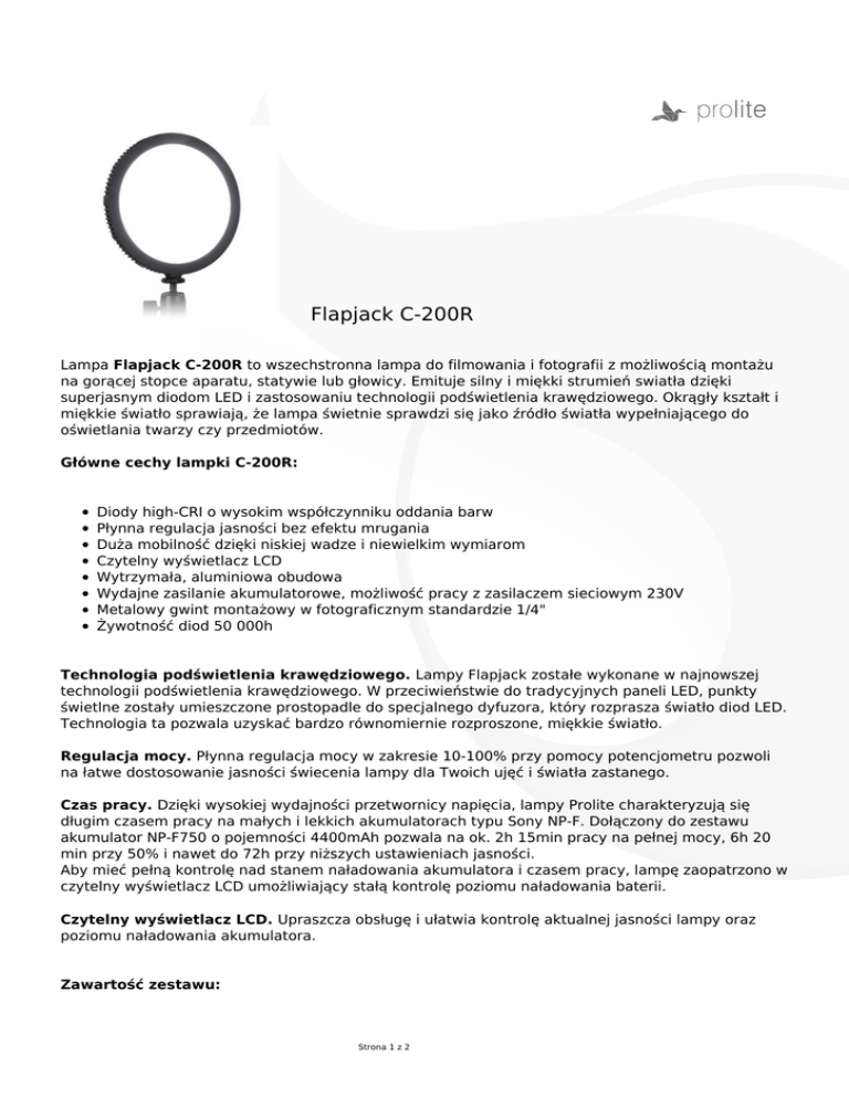 Flapjack C-200R Lampa Flapjack C-200R to wszechstronna lampa do filmowania i fotografii z możliwością montażu na gorącej stopce aparatu, statywie lub głowicy. Emituje silny i miękki strumień swiatła dzięki superjasnym diodom LED i zastosowaniu technologii podświetlenia krawędziowego. Okrągły kształt i miękkie światło sprawiają, że lampa świetnie sprawdzi się jako źródło światła wypełniającego do oświetlania twarzy czy przedmiotów. Główne cechy lampki C-200R: Diody high-CRI o wysokim współczynniku oddania barw Płynna regulacja jasności bez efektu mrugania Duża mobilność dzięki niskiej wadze i niewielkim wymiarom Czytelny wyświetlacz LCD Wytrzymała, aluminiowa obudowa Wydajne zasilanie akumulatorowe, możliwość pracy z zasilaczem sieciowym 230V Metalowy gwint montażowy w fotograficznym standardzie 1/4" Żywotność diod 50 000h Technologia podświetlenia krawędziowego. Lampy Flapjack zostałe wykonane w najnowszej technologii podświetlenia krawędziowego. W przeciwieństwie do tradycyjnych paneli LED, punkty świetlne zostały umieszczone prostopadle do specjalnego dyfuzora, który rozprasza światło diod LED. Technologia ta pozwala uzyskać bardzo równomiernie rozproszone, miękkie światło. Regulacja mocy. Płynna regulacja mocy w zakresie 10-100% przy pomocy potencjometru pozwoli na łatwe dostosowanie jasności świecenia lampy dla Twoich ujęć i światła zastanego. Czas pracy. Dzięki wysokiej wydajności przetwornicy napięcia, lampy Prolite charakteryzują się długim czasem pracy na małych i lekkich akumulatorach typu Sony NP-F. Dołączony do zestawu akumulator NP-F750 o pojemności 4400mAh pozwala na ok. 2h 15min pracy na pełnej mocy, 6h 20 min przy 50% i nawet do 72h przy niższych ustawieniach jasności. Aby mieć pełną kontrolę nad stanem naładowania akumulatora i czasem pracy, lampę zaopatrzono w czytelny wyświetlacz LCD umożliwiający stałą kontrolę poziomu naładowania baterii. Czytelny wyświetlacz LCD. Upraszcza obsługę i ułatwia kontrolę aktualnej jasności lampy oraz poziomu naładowania akumulatora. Zawartość zestawu: Strona 1 z 2 Lampka C-200R (1 szt.) Akumulator 7.4V typu NP-F750 o pojemności 4400mAh Dwustanowiskowa ładowarka akumulatorów NP-F Kabel samochodowy do zasilania lampki lub ładowarki akumulatorów Głowica kulowa z możliwością montażu na stopce aparatu lub na gwincie 1/4" Wygodna torba do przenoszenia zestawu Specyfikacja techniczna Model Flapjack C-200R Liczba diód LED 40 (high CRI >90) Jasność 1050 lx/0.5m, 286 lx/1m Kąt świecenia lampy 120° Temperatura barwowa 5600K Czas pracy (pełna moc) ok. 135 minut Moc LED 16W Napięcie zasilania DC 7.4 - 14.8V Akumulator typu Sony NP-F, 7.4V 4400mAh (standardowy) Wymiary (LWH) Ø17.8 x 4.6 cm Mocowanie 2 x1/4" (metalowy), adatper na gorącą stopkę aparatu Waga 411g Strona 2 z 2