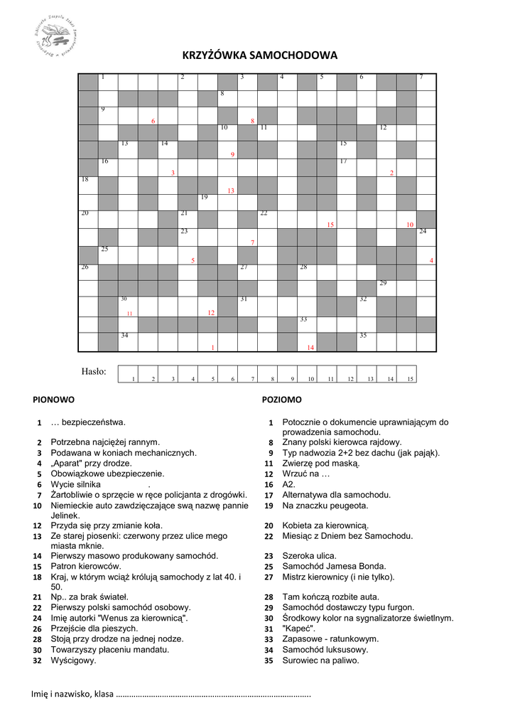 KRZYŻÓWKA SAMOCHODOWA 1 2 3 4 5 6 7 8 9 6 13 8 10 11 12 14 15 9 16 17 3 18 2 13 19 20 21 22 15 23 10 24 7 25 5 26 27 4 28 29 31 30 32 12 1 11 33 34 35 1 14 Hasło: 1 2 3 4 5 6 PIONOWO 1 2 3 4 5 6 7 10 12 13 14 15 18 21 22 24 26 28 30 32 … bezpieczeństwa. Potrzebna najciężej rannym. Podawana w koniach mechanicznych. „Aparat" przy drodze. Obowiązkowe ubezpieczenie. Wycie silnika . Żartobliwie o sprzęcie w ręce policjanta z drogówki. Niemieckie auto zawdzięczające swą nazwę pannie Jelinek. Przyda się przy zmianie koła. Ze starej piosenki: czerwony przez ulice mego miasta mknie. Pierwszy masowo produkowany samochód. Patron kierowców. Kraj, w którym wciąż królują samochody z lat 40. i 50. Np.. za brak świateł. Pierwszy polski samochód osobowy. Imię autorki "Wenus za kierownicą". Przejście dla pieszych. Stoją przy drodze na jednej nodze. Towarzyszy płaceniu mandatu. Wyścigowy. 7 8 9 10 11 12 13 14 15 POZIOMO 8 9 11 12 16 17 19 Potocznie o dokumencie uprawniającym do prowadzenia samochodu. Znany polski kierowca rajdowy. Typ nadwozia 2+2 bez dachu (jak pająk). Zwierzę pod maską. Wrzuć na … A2. Alternatywa dla samochodu. Na znaczku peugeota. 20 22 Kobieta za kierownicą. Miesiąc z Dniem bez Samochodu. 23 25 27 Szeroka ulica. Samochód Jamesa Bonda. Mistrz kierownicy (i nie tylko). 28 29 30 31 33 34 35 Tam kończą rozbite auta. Samochód dostawczy typu furgon. Środkowy kolor na sygnalizatorze świetlnym. "Kapeć". Zapasowe - ratunkowym. Samochód luksusowy. Surowiec na paliwo. 1 Imię i nazwisko, klasa ……………………………………………………………………………..