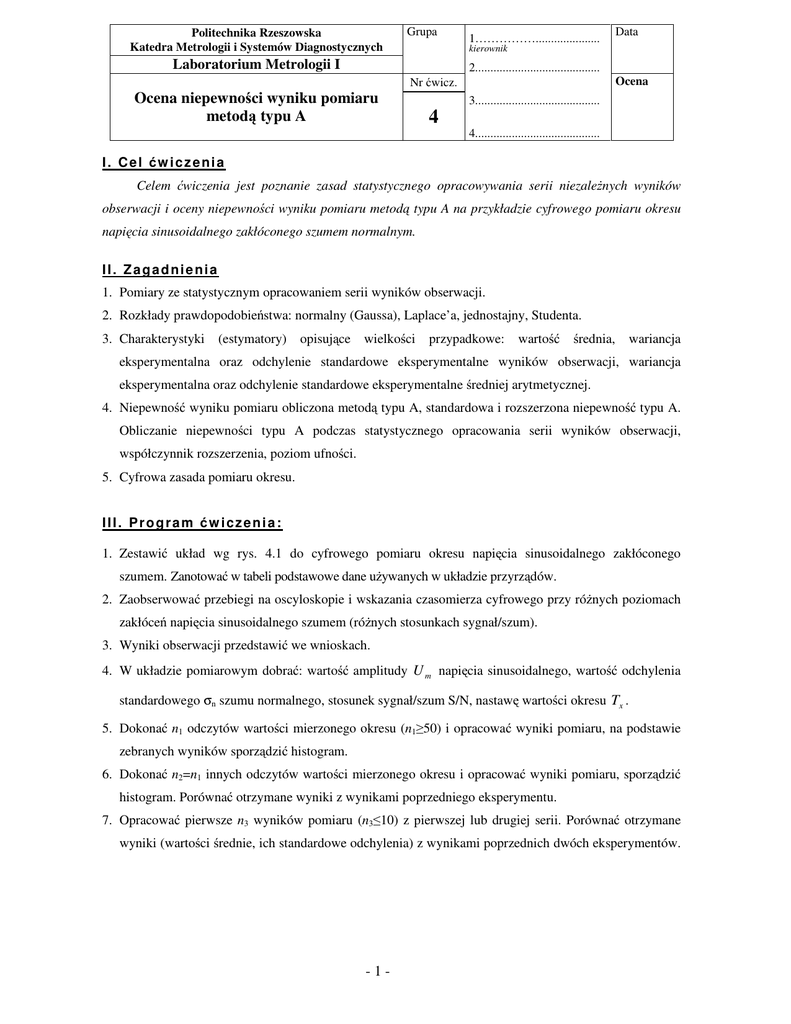 Politechnika Rzeszowska Katedra Metrologii i Systemów Diagnostycznych Grupa 1……………..................... Data kierownik Laboratorium Metrologii I 2......................................... Ocena Nr ćwicz. Ocena niepewności wyniku pomiaru metodą typu A 3......................................... 4 4......................................... I. Cel ćw iczenia Celem ćwiczenia jest poznanie zasad statystycznego opracowywania serii niezależnych wyników obserwacji i oceny niepewności wyniku pomiaru metodą typu A na przykładzie cyfrowego pomiaru okresu napięcia sinusoidalnego zakłóconego szumem normalnym. II. Zagadnienia 1. Pomiary ze statystycznym opracowaniem serii wyników obserwacji. 2. Rozkłady prawdopodobieństwa: normalny (Gaussa), Laplace’a, jednostajny, Studenta. 3. Charakterystyki (estymatory) opisujące wielkości przypadkowe: wartość średnia, wariancja eksperymentalna oraz odchylenie standardowe eksperymentalne wyników obserwacji, wariancja eksperymentalna oraz odchylenie standardowe eksperymentalne średniej arytmetycznej. 4. Niepewność wyniku pomiaru obliczona metodą typu A, standardowa i rozszerzona niepewność typu A. Obliczanie niepewności typu A podczas statystycznego opracowania serii wyników obserwacji, współczynnik rozszerzenia, poziom ufności. 5. Cyfrowa zasada pomiaru okresu. III. Program ćw iczenia: 1. Zestawić układ wg rys. 4.1 do cyfrowego pomiaru okresu napięcia sinusoidalnego zakłóconego szumem. Zanotować w tabeli podstawowe dane używanych w układzie przyrządów. 2. Zaobserwować przebiegi na oscyloskopie i wskazania czasomierza cyfrowego przy różnych poziomach zakłóceń napięcia sinusoidalnego szumem (różnych stosunkach sygnał/szum). 3. Wyniki obserwacji przedstawić we wnioskach. 4. W układzie pomiarowym dobrać: wartość amplitudy U m napięcia sinusoidalnego, wartość odchylenia standardowego σn szumu normalnego, stosunek sygnał/szum S/N, nastawę wartości okresu Tx . 5. Dokonać n1 odczytów wartości mierzonego okresu (n1≥50) i opracować wyniki pomiaru, na podstawie zebranych wyników sporządzić histogram. 6. Dokonać n2=n1 innych odczytów wartości mierzonego okresu i opracować wyniki pomiaru, sporządzić histogram. Porównać otrzymane wyniki z wynikami poprzedniego eksperymentu. 7. Opracować pierwsze n3 wyników pomiaru (n3≤10) z pierwszej lub drugiej serii. Porównać otrzymane wyniki (wartości średnie, ich standardowe odchylenia) z wynikami poprzednich dwóch eksperymentów. -1- Katedra Metrologii i Systemów Diagmostycznych Laboratorium Metrologii I. 2010/11 I V . P r z e b i e g ćw i c z e n i a 1. Zastosowane przyrządy: GS Tabela 1 Generator sygnału sinusoidalnego typ numer zakres zmian napięcia wyjściowego rezystancja wyjściowa zakresy częstotliwości MUZ Model układu zakłócającego (generator szumu białego + sumator + komparator dopasowany) typ numer model laboratoryjny pasmo częstotliwości generatora odchylenie standardowe szumu 10 Hz - 4 kHz σn = Cz-C Czasomierz cyfrowy z interfejsem typ numer względna graniczna niestabilność częstotliwości generatora wzorcowego δG,gr = względna graniczna niestabilność bramkowania δB,gr =± Częstotliwości wzorcowe generatora OE Oscyloskop elektroniczny typ numer czułość kanału Y pasmo częstotliwości kanału Y stała czasowa. kanału X 2. Układ pomiarowy: Rys. 4.1 Schemat układu do pomiaru okresu napięcia sinusoidalnego zakłóconego szumem 3 .Wyniki pomiarów i obliczeń 3.1. W celu zamodelowania eksperymentu pomiarowego dobrać: • Wartość amplitudy napięcia sinusoidalnego około Um=1V (wartość skuteczna U = U m / 2 ), • Nominalną wartość okresu Tx z przedziału (10 do 100 ms)- wg zaleceń prowadzącego ćwiczenie. -2- Katedra Metrologii i Systemów Diagmostycznych Laboratorium Metrologii I. 2010/11 • Wartość odchylenia standardowego szumu normalnego wyznaczoną oscyloskopem z przedziału ±3σn około σn =20mV, S U • Obliczyc stosunek sygnał/szum = N σ n 2 Um = 2 ⋅σ n 2 =, 3.2. Dokonać n1≥50 odczytów wartości mierzonego okresu sygnału zniekszyałconego szumem. Wyniki odczytów zapisać w pliku tekstowym oraz w tabeli 2. Wartości mierzonego okresu, ms Tabela 2 Następne obliczenia przeprowadzić za pomocą funkcji statystycznych dostępnych w programach STATGRAPHICS, STATISTICA, lub innych. 3.3. Na podstawie zebranych wyników dla n1=......... pomiarów sporządzić histogram. Liczbę m klas (przedziałów) przy opracowaniu histogramu wybrać wykorzystując na przykład empiryczny wzór Sturgesa: m ≈ 1 + 3,3 lg(n1 ) = . 3.4. Oszacować wartość wyniku pomiaru okresu jako wartość średnia arytmetyczna serii wyników obserwacji okresu: Tx = T = 1 n1 n1 ∑T = i ; i =1 3.5. Przeprowadzić obliczenia niepewności wyniku pomiaru okresu metodą typu A - obliczyć wariancję eksperymentalną n s 2 (T ) = 1 1 ∑ Ti − T n1 − 1 i =1 ( ) 2 = ; obliczyć wariancję eksperymentalną wartości średniej (wariancja typu A) () s2 T = s 2 (T ) = n1 ; obliczyć niepewność standardową typu A wartości średniej (odchylenie standardowe eksperymentalne wartości średniej) -3- Katedra Metrologii i Systemów Diagmostycznych Laboratorium Metrologii I. 2010/11 s 2 (T ) = n1 () u (T ) = s 2 T = ; - obliczyć niepewność rozszerzoną wyniku pomiaru (poziom ufności p zadany przez prowadzącego ćwiczenie) U p = k p ⋅ u (T ) = , - gdzie k p = t P (ν ) = współczynnik z rozkładu t-Studenta dla zadanego poziomu ufności p = oraz liczby stopni swobody ν = n1 − 1 = . 3.6. Przedstawić końcowy wynik pomiaru według wzoru: T = T ± U , [ jednostka ], p = T= [ ± ], p = ,ν = . Komentarz do przedstawionego wyniku pomiaru: Wynik pomiaru T= wartość średnia z serii n1 = , ν = n1 − 1 = znaleziony jako niezależnych obserwacji okresu sygnału sinusoidalnego przy założeniu normalnego rozkładu wyników obserwacji, standardowa niepewność wyniku u (T ) = , niepewność rozszerzona U p = 