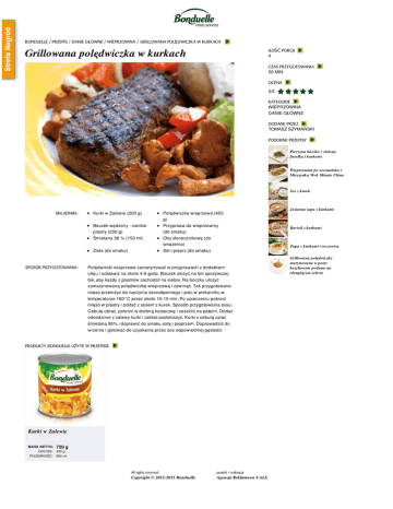 BONDUELLE / PRZEPIS / DANIE GŁÓWNE / WIEPRZOWINA / GRILLOWANA POLĘDWICZKA W KURKACH Grillowana polędwiczka w kurkach ILOŚĆ PORCJI 4 CZAS PRZYGOTOWANIA 50 MIN OCENA 5/5 KATEGORIE WIEPRZOWINA DANIE GŁÓWNE DODANE PRZEZ TOMASZ SZYMAŃSKI PODOBNE PRZEPISY Pieczona kaczka z zieloną fasolką i kurkami Wieprzowina po seczuańsku z Mieszanką Wok Minute China Sos z kurek SKŁADNIKI: Kurki w Zalewie (200 g) Boczek wędzony - cienkie plastry (200 g) Śmietana 36 % (150 ml) Zioła (do smaku) SPOSÓB PRZYGOTOWANIA: Polędwiczka wieprzowa (450 g) Przyprawa do wieprzowiny (do smaku) Olej słonecznikowy (do smażenia) Sól i pieprz (do smaku) Polędwiczki wieprzowe zamarynować w przyprawach z dodatkiem oleju i odstawić na około 4-6 godz. Boczek ułożyć na foli spożywczej tak, aby każdy z plastrów zachodził na siebie. Na boczku ułożyć zamarynowaną polędwiczkę wieprzową i zawinąć. Tak przygotowane mięso przełożyć do naczynia żaroodpornego i piec w piekarniku w temperaturze 180°C przez około 10-15 min. Po upieczeniu pokroić mięso w plastry i podać z sosem z kurek. Sposób przygotowania sosu: Cebulę obrać, pokroić w drobną kosteczkę i zeszklić na patelni. Dodać odcedzone z zalewy kurki i całość podsmażyć. Kurki z cebulą zalać śmietaną 36% i doprawić do smaku solą i pieprzem. Doprowadzić do wrzenia i gotować do uzyskania przez sos odpowiedniej gęstości. PRODUKTY BONDUELLE UŻYTE W PRZEPISIE Kurki w Zalewie MASA NETTO: 720 g ODCIEK: 400 g POJEMNOŚĆ: 850 ml All rights reserved projekt i realizacja Copyright © 2012-2015 Bonduelle Agencja Reklamowa 4 ALL Jesienna zupa z kurkami Ravioli z kurkami Zupa z kurkami i soczewicą Grillowana polędwiczka marynowana w pesto bazyliowym podana na chrupiącym selerze