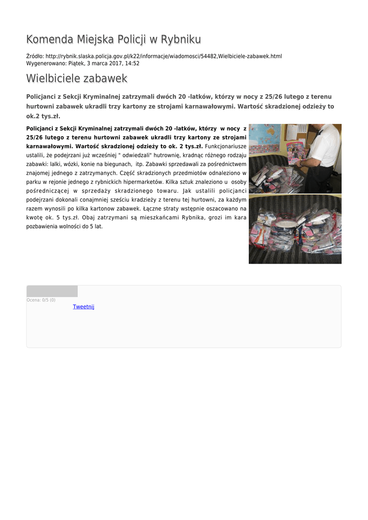 Komenda Miejska Policji w Rybniku Źródło: http://rybnik.slaska.policja.gov.pl/k22/informacje/wiadomosci/54482,Wielbiciele-zabawek.html Wygenerowano: Piątek, 3 marca 2017, 14:52 Wielbiciele zabawek Policjanci z Sekcji Kryminalnej zatrzymali dwóch 20 -latków, którzy w nocy z 25/26 lutego z terenu hurtowni zabawek ukradli trzy kartony ze strojami karnawałowymi. Wartość skradzionej odzieży to ok.2 tys.zł. Policjanci z Sekcji Kryminalnej zatrzymali dwóch 20 -latków, którzy w nocy z 25/26 lutego z terenu hurtowni zabawek ukradli trzy kartony ze strojami karnawałowymi. Wartość skradzionej odzieży to ok. 2 tys.zł. Funkcjonariusze ustalili, że podejrzani już wcześniej " odwiedzali" hutrownię, kradnąc różnego rodzaju zabawki: lalki, wózki, konie na biegunach, itp. Zabawki sprzedawali za pośrednictwem znajomej jednego z zatrzymanych. Część skradzionych przedmiotów odnaleziono w parku w rejonie jednego z rybnickich hipermarketów. Kilka sztuk znaleziono u osoby pośredniczącej w sprzedaży skradzionego towaru. Jak ustalili policjanci podejrzani dokonali conajmniej sześciu kradzieży z terenu tej hurtowni, za każdym razem wynosili po kilka kartonow zabawek. Łączne straty wstępnie oszacowano na kwotę ok. 5 tys.zł. Obaj zatrzymani są mieszkańcami Rybnika, grozi im kara pozbawienia wolności do 5 lat. Ocena: 0/5 (0) Tweetnij