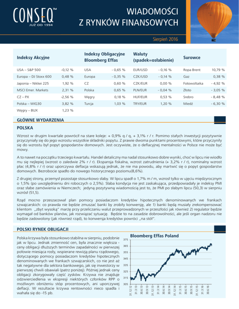 I N V E S T I Č NWIADOMOŚCI Í PROGRAM Z RYNKÓW FINANSOWYCH HORIZONT INVEST Informace o produktu Sierpień 2016 Program Horizont Invest je inspirován životem. V mládí je plný dravosti a energie, s přibývajícím Indeksy Obligacyjne Waluty stářím preferuje jistoty a bezpečí. V počátku je koncipován razantněji (silnější zastoupení investic Indeksy Akcyjne Surowce Bloomberg Effas (spadek=osłabienie) s vyšším výnosem a rizikem), s blížícím se závěrem programu se pak poměr investic mění ve prospěch-0,12 konzervativních, jejichž investiční riziko (a výnos) jsou nižší. USA – S&P 500 % USA - 0,65 % EUR/USD - 0,16 % Ropa Brent 10,79 % Europa – DJ Stoxx 600 0,48 % Europa - 0,35 % CZK/USD - 0,14 % Gaz 0,38 % Program Horizont Invest vám věkem a blížícím se závěrem pomůže jednoduše investovat Fotowoltaika programu se pak- 4,92 zastoupení Japonia – Nikkei 225 1,92 % CZ 0,60 % CZK/EUR 0,00 % % a zvýšit tak potenciál zhodno- rizikovějších investic snižuje MSCI Emer. Markets 2,31 % Polska 0,65 % PLN/EUR - 0,04 % peněz. Złoto - 3,05 % cení vašich uspořených a jsou nahrazovány investicemi Současně je ale 0,53 navržen konzervativními, -jejichž invesCZ – PX -2,56 % Węgry 0,18 % HUF/EUR % tak, aby Srebro 8,48 % maximálně stabilizoval a chránil tiční riziko (a výnos) jsou nižší. Polska – WIG30 3,82 % Turcja 1,03 % TRY/EUR % Miedź - 6,30 % výnosy vložených1,20 investic. Atraktivní nástroj pro investováWęgry – BUX 1,23 % ní z něj činí zejména možnost Program Horizont Invest vám pomůže řešit kombinovat investice s vyšším financování všech zásadních životních situací. GŁÓWNE WYDARZENIA výnosem s investicemi s nízkým Chcete své DĚTI vybavit do dospělého života? rizikem. Program je tak možné POLSKA navrhnout podle vašich možOpravujete nebo kupujete váš nový DOMOV? ností, představ a potřeb. V počáWzrost w drugim kwartale powrócił na stare + 0,9% q / q, + 3,1% r / r. Pomimo stałych inwestycji pozytywnie Potřebujete se zabezpečit na koleje: DŮCHOD? tečním období, kdy před sebou przyczyniały się do jego wzrostu wszystkie składniki popytu. Z prawie dwoma punktami procentowymi, które przyczyniły Nebo chcete vhodně investovat VOLNÉPROSTŘEDKY? máte dostatek času k překlenutí się do wzrostu był popyt gospodarstw domowych. Jest oczywiste, że o deflacyjnej mentalności w Polsce nie może być • Dlouhodobé pravidelné invesmowy. tování převážně do rizikových Které portfolio je pro vás nejvhodnější? aktiv (zejména akciových fonA to nawet na początku trzeciego kwartału. Handel detaliczny ma nadal stosunkowo dobre wyniki, choć w lipcu nie wiodło dů) zvyšuje potenciál zhodnoLiší se poměrem dynamických a konzervativních investičních mu się nejlepiej (wzrost o zaledwie 2% r / r). Ekspansja fiskalna, wzrost zatrudnienia (+ 3,2% r / r), nominalny wzrost nástrojů, ovšem u všech platí, že s přibližujícím se koncem cení úspor investora. płac (4,8% r / r) oraz uporczywa deflacjasložky wskazują nie ma powodu, aby martwić się o•popyt gospodarstw programu podíl dynamické klesá vejednak, prospěchżesložky Postupné snižování rizikovosti domowych. Bezrobocie spadło do nowego historycznego poziomu(8,6%). konzervativní. portfolia v posledních letech programu naopak chrání dříve Z drugiej strony, przemysł pozostaje stosunkowo słaby. W lipcu spadł o 1,7% m / m, wzrosł tylko w ujęciu międzyrocznym Vyvážené portfolio dosažené výnosy a investovao 1,5% (po uwzględnieniu dni roboczych o 2,5%). Słaba kondycja nie jest zaskakująca, przedpowiadały je indeksy PMI né prostředky. Investiční horizont: doporučení min. 5 let oraz słabe zamówienia w Niemczech; střední jedyną pozytywną wiadomością jest to, że PMI po słabym lipcu (50,3) w sierpniu • Časový horizont lze navrhnout Riziko: (úroveň 3 z 5) wzrósł (51,5). případných výkyvů na trhu, je podle potřeb klienta, libovolVstupní poplatek: max. 4,0 % z hodnoty investice program zahájen razantněji (silně ho průběžně upravovat Manažerský poplatek: max. 0,5 % ročně z objemu portfolia Rząd mocno przeszacował plan pomocy posiadaczom kredytów hipotecznych denominowanych we frankach nější zastoupení investic s vyša celý program funguje zcela szwajcarskich: co prawda nie będzie zmuszać banki by zrobiły konwersję, ale 1) banki będą musiałyautomaticky zrekompensować Růstové portfolio ším výnosem a rizikem). Se zvybez nutnosti záklientom „zbyt wysoką“ marżę przy przeliczaniu walut przeprowadzonych w przeszłości jak również 2) będzie šující se investovanou částkou, sahůregulator ze strany investora. Investiční horizont: doporučení min. 8 let wymagał od banków planów, jak rozwiązać sytuację. Będzie to na zasadzie dobrowolności, ale jeśli organ nadzoru nie Riziko: střední až vysoké (úroveň 4 z 5) będzie zadowolonyVstupní (jak również rząd), to konwersja kredytów powróci „na stół”. poplatek: max. 4,5 % z hodnoty investice Právě vám je určen program dlouhodobého Manažerský poplatek: max. 0,5 % ročně z objemu portfolia průběžného investování Horizont Invest. POLSKI RYNEK OBLIGACJI Dynamické portfolio 30.6.16 31.3.16 31.12.15 30.9.15 30.6.15 31.3.15 30.9.14 31.12.14 30.6.14 31.3.14 30.9.13 31.12.13 30.6.13 31.3.13 31.12.12 Bloomberg Effas Poland horizont: doporučení min.podobnie 10 let Základní informace Polska krzywa byłaInvestiční stosunkowo stabilna w sierpniu, 375 Riziko: vysoké (úroveň 5 z 5) jak w lipcu. Jednak zmienność cen, była znacznie większa Investiční manager: Conseq Investment Management, a. s. Vstupní poplatek: max. 5 % z hodnoty investice ceny obligacji dłuższych terminów zapadalności w pierwszej 365 Min. pravidelná investice: 500 Kč / měsíc Manažerský poplatek: max. 0,5 % ročně z objemu portfolia połowi
