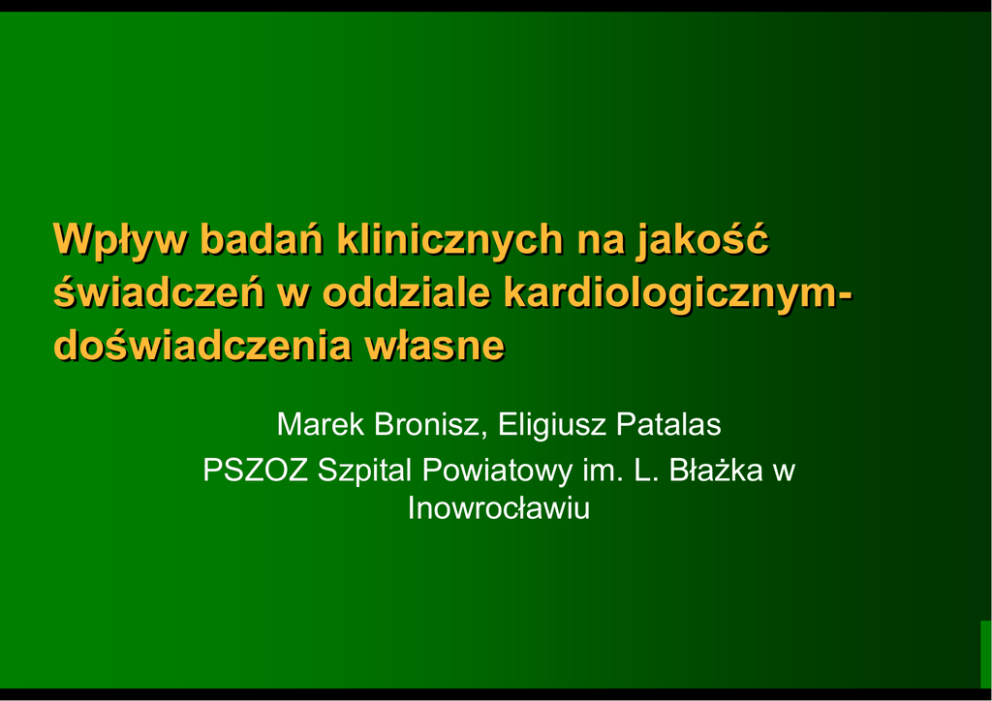 Wpływ badań klinicznych na jakość świadczeń w oddziale kardiologicznymdoświadczenia własne Marek Bronisz, Eligiusz Patalas PSZOZ Szpital Powiatowy im. L. Błażka w Inowrocławiu Definicja Jakość opieki zdrowotnej, jako zakres w jakim świadczenia udzielane jednostkom zwiększają prawdopodobieństwo uzyskania pozytywnego efektu zdrowotnego i są związane z aktualną wiedzą. Wiedza medyczna Jednym z głównych narzędzi kształtowania i postępu wiedzy medycznej są badania kliniczne. PLATelet inhibition and patient Outcomes ESC Barcelona 2009 n==18624 z OZW Ocena skuteczności i bezpieczeństwa terapii Tikagrelorem (180mg,2x90mg), w porównaniu z klopidogrelem (300mg, 1x75mg) Pierwszorzędowy punkt końcowy zgony sercowo naczyniowe (zawał lub udar)- 9,8/11,7% (p<0,001) Ocena bezpieczeństwa- bez różnicy w ilości poważnych krwawień Wniosek: istotna redukcja zgonów sercowo-naczyniowych, zawałów i udarów bez wzrostu poważnych krwawień w grupie leczonej Tikagrelorem Nowe zalecenia ESC Paryż 2011 Klopidogrel jest zalecany tylko u chorych, którzy nie mogą przyjmować Tikagreloru lub Prasugrelu (klasa IA) Nowa Era w Leczeniu Migotania Przedsionków Aristotle- n=18201 pacjentów z F.A i cz. ryzyka udaru mózgu Apiksaban-doustny inhibitor cz. X a (2x5mg)/Warfaryna (INR 2-3,0) Średni czas obserwacji 1,8 roku Aristotle ESC Paryż 2011 Główne wyniki: zmniejszenie udaru lub zatoru obwodowego o 21% z jednoczesną redukcją powikłań krwotocznych o 31% oraz redukcją zgonu o 11% Nie wykazano istotnej redukcji udarów niedokrwiennych SHIFT (Systolic Heart failure treatment with the If inhibitor ivabradine Trial) n=6505 z niewydolnością serca (EF<35%, NYHA II48%, NYHA III-50% ), z rytmem zatokowym, hospitalizowanych w ciągu ostatniego roku z powodu zaostrzenia niewydolności serca, ale stabilni hemodynamicznie w ciągu ostatnich 4 tygodni Stosowano dodatkowe leczenie- Ivabradynę/placebo w dawce zależnej od HR (od 2,5-7,5mg) ESC 2010 Sztokholm SHIFT 1-rzędowy p. końcowy (złożony)- zgon lub hospitalizacja z powodu pogorszenia n. serca był istotnie mniejszy w grupie leczonej Ivabradyną (24/29%, p<0,0001) bez różnicy z powodu zgonów sercowo-naczyniowych, ani wszystkich zgonów Ivabradyna – inhibitor kanałów If w węźle zatokowym, nie wpływa na kurczliwość mm sercowego Wniosek: Iwabradyna poprawia efekty leczenia niewydolności serca poprzez zwolnienie jego częstości ( na koniec badania HR w grupie leczonej o 8 uderzeń na min. mniejszy) Corona-Controlled Rosuvastatin Multinational Study in Heart Failure AHA 2007 Orlando Ocena skuteczności Rosuwastatyny (10mg/placebo) na przeżywalność u chorych z niewydolnością serca N=5011,NYHA II-IV, EF<40%, czas obserwacji 32,8miesiąca Bez wpływu na częstość zgonu i ilość zdarzeń sercowonaczyniowych Mniejsza ilość hospitalizacji z przyczyn sercowonaczyniowych. Appraise-2 ISTH Kioto 2010 n=7392 Apiksaban 2x5mg u chorych po OZW z wysokim ryzykiem jego nawrotu Po średnim okresie obserwacji 241 dni badanie przerwano z powodu wzrostu liczby poważnych krwawień w tym śródczaszkowych (1,3%/0,5%,p=0,001), które nie były zadawalając równoważone zmniejszeniem nawrotu OZW (7,5%/7,9%, p=0,51) RUBY-1 ESC Paryż 2011 N=1264 badanie II fazy u chorych z OZW (STEMI i NSTEMI) Czas obserwacji 6 miesięcy Dareksaban- doustny inhibitor cz. Xa dodany w ciągu 7 dni od wystąpienia zawału (dawki 5,1-,15,30 i 60mg raz i dwa razy dziennie) do standardowej terapii p/płytkowej RUBY-1 Odnotowano 2-4 razy wzrost krwawień, bez zmniejszenia epizodów niedokrwiennych. Dareksaban (Astellas) był dobrze tolerowany i nie wykazywał hepatotoksyczności. Główny badacz dr Gabriel Steg wyraził opinię o potencjalnym zastosowaniu niskich dawek Dareksabanu w OZW. Badanie ACTIVE W Celem badania było wykazanie, że terapia skojarzona – klopidogrel (75mg) + ASA (75-100mg), u chorych z migotaniem przedsionków i wysokim ryzykiem incydentów naczyniowych jest równie skuteczna jak leczenie standardowe – stosowanie leków przeciwkrzepliwych. Konkluzja: główny punkt końcowy, definiowany, jako udar, zator, zawał i śmierć z przyczyn naczyniowych wystąpił znamiennie częściej w grupie skojarzonego leczenia przeciwpłytkowego- 5,6 versus 3,63/rok (P=0,0002) Częstość poważnych krwawień była zbliżona i wynosiła odpowiednio – 2,4 w grupie terapii p/płytkowei i 2,2 w grupie leczonej warfaryną Wniosek Badania kliniczne mogą mieć zróżnicowany wpływ na uzyskanie pozytywnego efektu zdrowotnego. Relacje pacjent-personel medyczny Uzyskanie świadomej zgody chorego na udział w badaniu Informacja dla pacjenta Możliwość awaryjnego kontaktu z lekarzem prowadzącym Konieczność systematycznej kontroli oraz raportowania zdarzeń (AE, SAE). Badanie compliance Efekt Wzrost zaufania do personelu medycznego Większa świadomość i udział chorego w procesie leczenia Zwiększona dyscyplina terapii Poprawa relacji pacjent-personel, co zwiększa prawdopodobieństwo uzyskania pozytywnego efektu zdrowotnego (poprawa jakości) Strefa techniczna (zaplecze) Stosowanie nowatorskich leków, systemów terapii i urządzeń Niezbędne wyposażenie medyczne i jego standard (np. kontrola techniczna-paszporty sprzętu, monitoring temperatury) Zagrożenia i problemy Wzbudzanie nadmiernego lęku, stresu (np. przesadne rozbudowanie świadomej zgody) Wydłużenie czasu trwania procedur – opóźnienie terapii Potencjalny negatywny wpływ na efekt zdrowotny Dodatkowe obciążenie pracą Aspekty etyczne (równoprawne traktowanie pacjentów, komercjalizacja) Aspekty prawne i ekonomiczne (rozliczenia z szpitalem, NFZ, czas hospitalizacji, odpowiedzialność prawna, odszkodowania, ubezpieczenia) Podsumowanie Prawidłowo zaprojektowane i przeprowadzone badanie kliniczne ma pozytywny wpływ na jakość świadczeń zdrowotnych. Dotyczy to szczególnie poprawy relacji pacjenta z personelem medycznym, zwiększenia dyscypliny leczenia, kontroli jego b