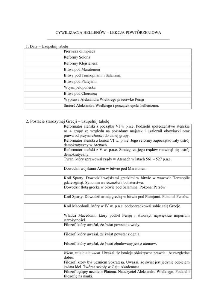 CYWILIZACJA HELLENÓW – LEKCJA POWTÓRZENIOWA _____________________________________________________________ 1. Daty – Uzupełnij tabelę Pierwsza olimpiada Reformy Solona Reformy Klejstenesa Bitwa pod Maratonem Bitwy pod Termopilami i Salaminą Bitwa pod Platejami Wojna peloponeska Bitwa pod Cheroneą Wyprawa Aleksandra Wielkiego przeciwko Persji Śmierć Aleksandra Wielkiego i początek epoki hellenizmu. 2. Postacie starożytnej Grecji – uzupełnij tabelę Reformator ateński z początku VI w p.n.e. Podzielił społeczeństwo ateńskie na 4 grupy ze względu na posiadany majątek i uzależnił obowiązki oraz prawa od przynależności do danej grupy. Reformator ateński z końca VI w. p.n.e. Jego reformy zapoczątkowały ustrój demokratyczny w Atenach. Reformator ateński z V w. p.n.e. Strateg, za jego rządów rozwinął się ustrój demokratyczny. Tyran, który sprawował rządy w Atenach w latach 561 – 527 p.n.e. Dowodził wojskami Aten w bitwie pod Maratonem. Król Sparty. Dowodził wojskami greckimi w bitwie w wąwozie Termopile gdzie zginął. Synonim waleczności i bohaterstwa. Dowodził flotą grecką w bitwie pod Salaminą. Pokonał Persów Król Sparty. Dowodził armią grecką w bitwie pod Platejami. Pokonał Persów. Król Macedonii, który w IV w. p.n.e. podporządkował sobie całą Grecję. Władca Macedonii, który podbił Persję i stworzył największe imperium starożytności Filozof, który uważał, że świat powstał z wody. Filozof, który uważał, że świat powstał z ognia. Filozof, który uważał, że świat zbudowany jest z atomów. Wiem, że nic nie wiem. Uważał, że istnieje obiektywna prawda i bezwzględne dobro. Filozof, który był uczniem Sokratesa. Uważał, że świat jest jedynie odbiciem świata idei. Twórca szkoły w Gaju Akademosa Filozof będący uczniem Platona. Nauczyciel Aleksandra Wielkiego. Podzielił filozofię na nauki. Pisarz – Napisał „Iliadę” i „Odyseję”; twórca epiki. Ojciec historiografii greckiej – napisał „Dzieje” – historię wojen grecko – perskich. Pierwszy historyk; napisał „Wojnę peloponeską”. Tragediopisarz grecki. Tragediopisarz grecki. Tragediopisarz grecki Autor komedii greckiej Rzeźbiarz. Wyrzeźbił rzeźby na Akropolu ateńskim np. Atenę Partenos oraz posąg Zeusa w Olimpii – jeden z 7 cudów świata starożytnego. Rzeźbiarz, który jest autorem Dyskobola Rzeźbiarz, który wprowadził zasady harmonii. Postacie, które wyrzeźbił cechuje idealna proporcja. 3. Pojęcia – nowe słowa, które poznaliśmy. ustrój, w którym władzę sprawuje niewielka grupa ludzi wywodzących się najczęściej spośród arystokracji rodowej lub majątkowej rządy ludu (demos – lud, krateo – rządzić) ustrój, w którym władzę sprawują obywatele ustrój, w którym władzę sprawuje człowiek nie mający ku temu żadnych podstaw prawnych greckie miasto – państwo wraz z przylegającymi obszarami; wspólnota polityczna, religijna i ekonomiczna rada starców w starożytnej Sparcie składająca się z 28 gerontów (starców powyżej 28 roku życia) oraz z 2 królów urzędnik w starożytnej Sparcie powoływany na rok przez Zgromadzenie Ludowe. najważniejszy urzędnik w starożytnych Atenach, powoływany na rok przez Zgromadzenie Ludowe; rada ateńska, w skład której wchodzili byli archonci. dowódca wojskowy w starożytnych Atenach centralny plac polis greckiej; zgromadzenie obywateli polis sąd skorupkowy; w starożytnych Atenach sąd mający na celu usunięcie z kraju obywatela podejrzanego o dążenie do przejęcia władzy (tyranii) najbiedniejsza warstwa społeczeństwa ateńskiego; mogli brać udział w obradach Zgromadzenie. Podczas wojny służyli na okrętach. trójrzędowiec – galera ateńska poruszana 3 rzędami wioseł szyk bojowy armii greckiej ciężkozbrojny piechur grecki okres w dziejach Grecji i krajów Bliskiego Wschodu od połowy IV do końca I w. p.n.e., który charakteryzował się szerokim rozprzestrzenieniem się terytorialnym kultury greckiej, która po zetknięciu się z kulturami Wschodu uległa przeobrażeniom (tworząc kulturę hellenistyczną) 4. Rozwiąż zadania na mapie: Napisz nazwy: Półwysep Bałkański, Macedonia, Tracja, Azja Mniejsza, Morze Kreteńskie, Morze Jońskie, Morze Egejskie. Znajdź na mapie i podkreśl nazwy: Ateny, Sparta, Góra Olimp, Olimpia Zaznacz na mapie miejsca bitew: Maraton, Wąwóz Termopile, Salamina, Plateje 5. Przypomnij sobie: Jaki wpływ miało środowisko geograficzne na rozwój państw greckich? Na jakie warstwy dzieliło się społeczeństwo polis Sparty? Jak w Sparcie wychowywano młodzież? W jaki sposób żyli starożytni Grecy? Jak spędzali czas wolny? Scharakteryzuj ustrój oligarchiczny Sparty i demokratyczny Aten. Jakie były najważniejsze organy władzy, jak je wybierano i jakie miały uprawnienia? Jakie były przyczyny, przebieg i skutki wojen Greków z Persami? Filozofię grecką – najważniejszych filozofów i ich poglądy. Religię grecką – cechy religii, najważniejszych bogów i czym się opiekowali, w jaki sposób Grecy oddawali im cześć? Kulturę grecką – gatunki literackie, architekturę – cechy architektury greckiej, porządki architektoniczne, wygląd świątyni, rzeźbę – cechy rzeźby greckiej, najważniejszych rzeźbiarzy i ich dzieła. Imperium Aleksandra Wielkiego – jak powstało, w jaki sposób zostało zorganizowane, co się z nim stało po śmierci Aleksandra, jakie są cechy kultury hellenistycznej i jakie znasz przykłady tej kultury? Ustrój oligarchiczny SPARTY Rządy spoczywały w rękach ________________________________ w którym wieku się wykształcił? _____________________________ Kto wprowadził ten ustrój? __________________________________ Organy władzy: 2 królów o Czym się zajmowali? ______________________________________________ ______________________________________________ Geruzja - ________________________ o kto w niej zasiadał? ___________