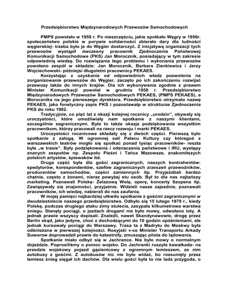 Przedsiębiorstwo Międzynarodowych Przewozów Samochodowych PMPS powstało w 1958 r. Po nieszczęściu, jakie spotkało Węgry w 1956r. społeczeństwo polskie w porywie solidarności zbierało dary dla ludności węgierskiej- trzeba było je do Węgier dostarczyć. Z inicjatywą organizacji tych przewozów wystąpił ówczesny pracownik Zjednoczenia Państwowej Komunikacji Samochodowe (PKS) Jan Morocznik, posiadający w tym zakresie odpowiednią wiedzę. Do rozwiązania tego problemu i wykonania przewozów powołano zespół w składzie: Jan Morocznik, Barbara Zienkiewicz i Jerzy Wojciechowski- późniejsi długoletni pracownicy PEKAES. Korzystając z uzyskania od odpowiednich władz pozwolenia na zorganizowanie przewozów do Węgier, zaczęto po ich zakończeniu rozwijać przewozy także do innych krajów. Dla ich wykonywania zgodnie z prawem Minister Komunikacji powołał w grudniu 1958 r. Przedsiębiorstwo Międzynarodowych Przewozów Samochodowych PEKAES, (PMPS PEKAES), a Morocznika na jego pierwszego dyrektora. Przedsiębiorstwo otrzymało nazwę PEKAES, jako fonetyczny zapis PKS i pozostawałp w strukturze Zjednoczenia PKS do roku 1982. Tradycyjnie, co pięć lat z okazji kolejnej rocznicy „urodzin”, obywały się uroczystości, które umożliwiały nam spotkanie z naszymi klientami, szczególnie zagranicznymi. Była to także okazja podziękowania wszystkim pracownikom, którzy pracowali na rzecz rozwoju i marki PEKAES. Uroczystości rocznicowe składały się z dwóch części. Pierwszą było spotkanie z załogą. W ogromnej sali Pałacu Kultury czy któregoś z warszawskich teatrów mogło się spotkać ponad tysiąc pracowników- reszta była „w trasie”. Były podziękowania i odznaczenia państwowe i IRU, występy znanych zespołów np. Zespołu Pieśni i Tańca Mazowsze, znakomitszych polskich artystów, śpiewaków itd. Druga część była dla gości zagranicznych, naszych kontrahentów: spedytorów, korespondentów, szefów zagranicznych zrzeszeń przewoźników, producentów samochodów, części zamiennych itp. Przyjeżdżali bardzo chętnie, często z żonami, nieraz powyżej stu osób. Był to dla nas najtańszy marketing. Poznawali Polskę- Żelazową Wolę, operę, koncerty Szopena itp. Zawiązywały się znajomości, przyjaźnie. Widzieli nasze zajezdnie, poznawali pracowników, ich wiedzę, nabierali do nas zaufania. W mojej pamięci najbardziej utkwiło spotkanie z gośćmi zagranicznymi w dwudziestolecie naszego przedsiębiorstwa. Odbyło się 15 lutego 1979 r., kiedy Polskę, podczas drugiego ataku zimy stulecia, zasypała kilkumetrowa warstwa śniegu. Stanęły pociągi, o jazdach drogami nie było mowy, odwołano loty. A jednak prawie wszyscy dopisali. Znaleźli, nawet Skandynawowie, drogę przez Berlin skąd, jako jedyne, choć z dochodzącymi do 10 godzin opóźnieniami, ale jednak kursowały pociągi do Warszawy. Trasa ta z Madrytu do Moskwy była odśnieżana w pierwszej kolejności. Rosyjski v-ce Minister Transportu Arkady Suworow doprowadził prawie do katastrofy, zmuszając pilota do lądowania. Spotkanie miało odbyć się w Jachrance. Nie było mowy o normalnym dojeździe. Poprosiliśmy o pomoc wojsko. Do Jachranki ruszyła kawalkada- na przedzie wojskowy pojazd gąsienicowy z ogromnym lemieszem, za nim autobusy z gośćmi. Z autobusów nic nie było widać, bo rozsunięty przez lemiesz śnieg sięgał ich dachów. Dla wielu gości była to nie lada przygoda, o której wspominano przez wiele lat. Spotkanie się udało, wszyscy bawili się świetnie. *** Tylko w najbardziej potrzebnych miejscach piszę imiennie o pracownikach PEKAES. Sądzę, że o nich powinno być osobne opracowaniedzięki nim PEKAES wyrósł na wielką, i znaną firmę. Nie mogę jednak nie wymienić dwóch z nich- pierwszych dyrektorów i twórców jego wielkości. Pierwszy to Jan Morocznik, drugi Juliusz. D. Kowalik Dyr. Jan Morocznik Na czele PMPS staje Morocznik. Wskrzesza zapomniane od kilku lat międzynarodowe przewozy samochodowe, nawiązuje kontakty ze spedytorami, i odpowiednimi instytucjami międzynarodowymi. Rozpoczyna kompletowanie załogi, w tym kierowców o bardzo wysokich kwalifikacjach, utrudnione przez obowiązujące w tym czasie, nazywając delikatnie, ostre kryteria paszportowe. Zakupił także 10 samochodów marki Magirus- Jupiter. Ogromne trudności sprawiało wejście do IRU np. wymóg działania przynajmniej 10 przewoźników międzynarodowych w danym kraju. W Polsce „zmobilizowano” do tego 10 przedsiębiorstw PKS. A także uzyskiwanie wiz i zezwoleń, gdyż niewiele państw chciało „najazdu komunistów” (cytat z prasy szwajcarskiej, kiedy pojawiły się tam pierwszy raz nasze samochody), a ich i nasze służby podsycały powszechną szpiegomanię. Wielka Brytania zabroniła nam wjazdu na swoje terytorium, i dopiero sąd brytyjski tę sprawę odwrócił. Tu dygresja. Jeszcze w latach osiemdziesiątych ubiegłego wieku, będąc w pewnej mediolańskiej firmie z Jerzym Wojciechowskim szefem naszego działu handlowo-marketingowego, usłyszeliśmy od bardzo aroganckiego rozmówcy: wszyscy kierowcy PEKAES to oficerowie KGB. Zdenerwowany naszym ironicznym uśmieszkiem i milczeniem poprawił się: wyżsi oficerowie KGB. Wszystkie te kłopoty sprawiały, że zakupione samochody miały znaczne przestoje. Na modnych wtedy naradach pracowniczych zarzucano Morocznikowi, że samochody stoją, a on stale przebywa za granicą. Z tych prawdopodobnie przyczyn minister odwołał go 22.12.1960 r. ze stanowiska dyrektora PMPS. Morocznik urodził się w Warszawie w 1908 r. Ukończył cztery klasy gimnazjum (mała matura) a później, w trakcie pracy, „kurs ekspedycyjno-celny Instytutu Praktycznej Wiedzy Handlowej im. senatora St. G. Brauna w Warszawa Waliców 2/4”. Po „wykonaniu wszystkich prac i ćwiczeń programem przewidzianych”, „złożył egzamin końcowy w dniu 18. czerwca 1929 z przedmiotów: Drogi komunikacyjne Taryfy kolejowe Technika ekspedyc