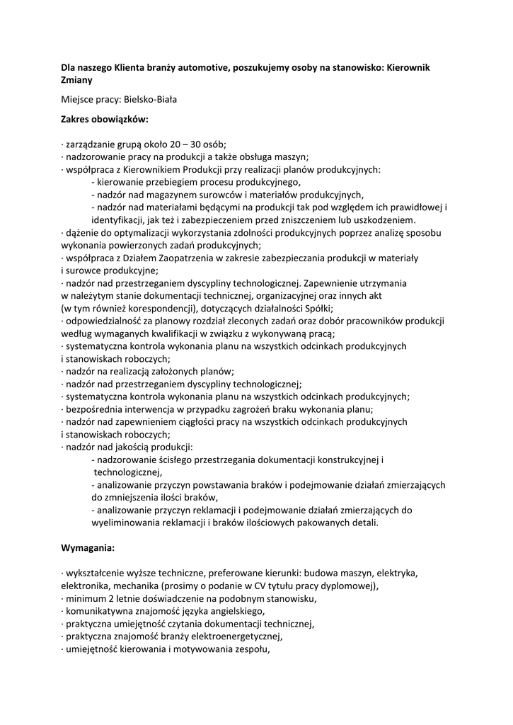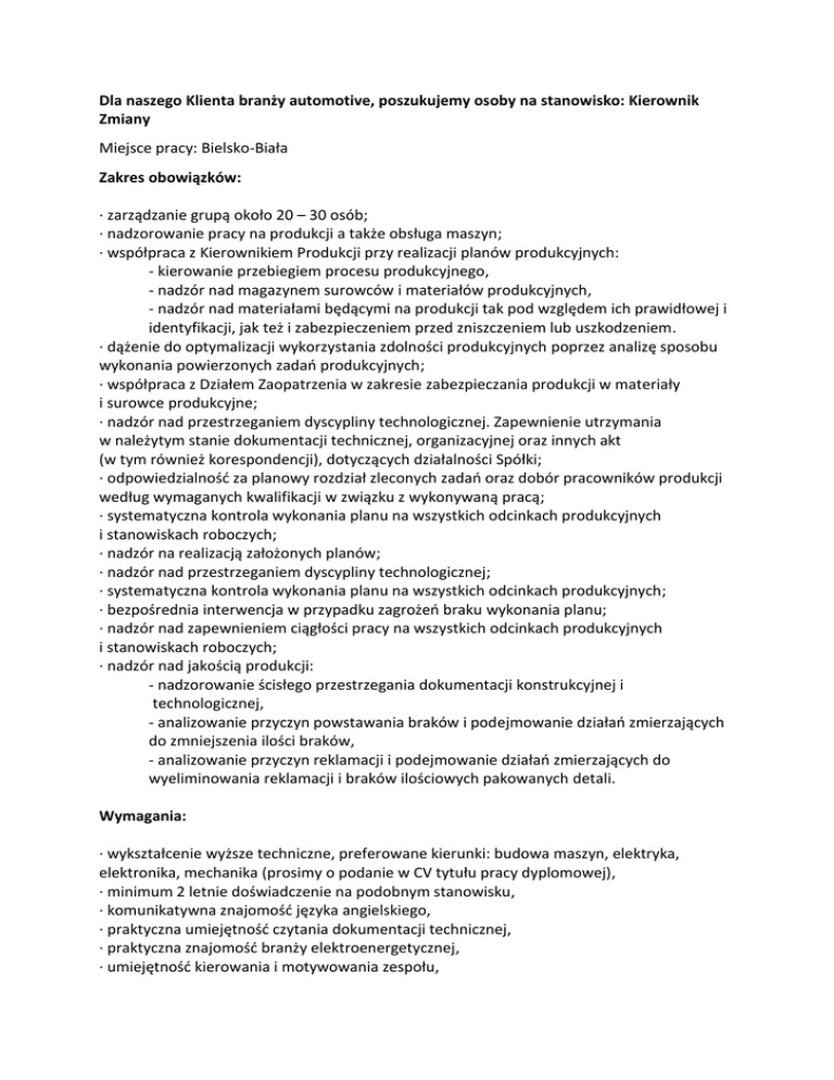 Dla naszego Klienta branży automotive, poszukujemy osoby na stanowisko: Kierownik Zmiany Miejsce pracy: Bielsko-Biała Zakres obowiązków: · zarządzanie grupą około 20 – 30 osób; · nadzorowanie pracy na produkcji a także obsługa maszyn; · współpraca z Kierownikiem Produkcji przy realizacji planów produkcyjnych: - kierowanie przebiegiem procesu produkcyjnego, - nadzór nad magazynem surowców i materiałów produkcyjnych, - nadzór nad materiałami będącymi na produkcji tak pod względem ich prawidłowej i identyfikacji, jak też i zabezpieczeniem przed zniszczeniem lub uszkodzeniem. · dążenie do optymalizacji wykorzystania zdolności produkcyjnych poprzez analizę sposobu wykonania powierzonych zadań produkcyjnych; · współpraca z Działem Zaopatrzenia w zakresie zabezpieczania produkcji w materiały i surowce produkcyjne; · nadzór nad przestrzeganiem dyscypliny technologicznej. Zapewnienie utrzymania w należytym stanie dokumentacji technicznej, organizacyjnej oraz innych akt (w tym również korespondencji), dotyczących działalności Spółki; · odpowiedzialność za planowy rozdział zleconych zadań oraz dobór pracowników produkcji według wymaganych kwalifikacji w związku z wykonywaną pracą; · systematyczna kontrola wykonania planu na wszystkich odcinkach produkcyjnych i stanowiskach roboczych; · nadzór na realizacją założonych planów; · nadzór nad przestrzeganiem dyscypliny technologicznej; · systematyczna kontrola wykonania planu na wszystkich odcinkach produkcyjnych; · bezpośrednia interwencja w przypadku zagrożeń braku wykonania planu; · nadzór nad zapewnieniem ciągłości pracy na wszystkich odcinkach produkcyjnych i stanowiskach roboczych; · nadzór nad jakością produkcji: - nadzorowanie ścisłego przestrzegania dokumentacji konstrukcyjnej i technologicznej, - analizowanie przyczyn powstawania braków i podejmowanie działań zmierzających do zmniejszenia ilości braków, - analizowanie przyczyn reklamacji i podejmowanie działań zmierzających do wyeliminowania reklamacji i braków ilościowych pakowanych detali. Wymagania: · wykształcenie wyższe techniczne, preferowane kierunki: budowa maszyn, elektryka, elektronika, mechanika (prosimy o podanie w CV tytułu pracy dyplomowej), · minimum 2 letnie doświadczenie na podobnym stanowisku, · komunikatywna znajomość języka angielskiego, · praktyczna umiejętność czytania dokumentacji technicznej, · praktyczna znajomość branży elektroenergetycznej, · umiejętność kierowania i motywowania zespołu, · bardzo dobra umiejętność organizacji pracy, · umiejętność zarządzania czasem pracy, · umiejętność analitycznego i twórczego myślenia, · umiejętność samodzielnego podejmowania decyzji i oceny podejmowanego ryzyka, · wysokie poczucie odpowiedzialność za podejmowane decyzje, · asertywność, · umiejętność koordynacji wielu zadań, · umiejętność wyznaczania priorytetów, · umiejętność planowania wykonania powierzonych zadań. Firma oferuje: · ciekawą pracę, · zatrudnienie bezpośrednio przez firmę w ramach umowy o pracę, · możliwości dalszego rozwoju, · atrakcyjne warunki zatrudnienia. Osoby spełniające powyższe wymagania prosimy o wysłanie CV na adres: [email protected] Koniecznie z dopiskiem w tytule: Kierownik Zmiany