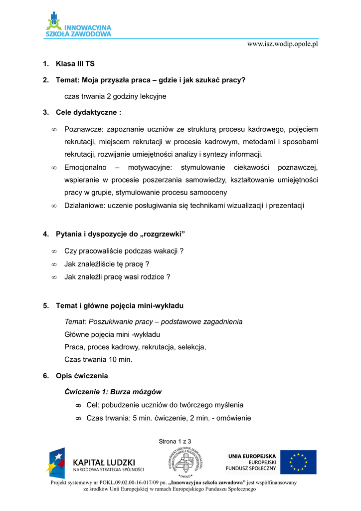www.isz.wodip.opole.pl 1. Klasa III TS 2. Temat: Moja przyszła praca – gdzie i jak szukać pracy? czas trwania 2 godziny lekcyjne 3. Cele dydaktyczne : • Poznawcze: zapoznanie uczniów ze strukturą procesu kadrowego, pojęciem rekrutacji, miejscem rekrutacji w procesie kadrowym, metodami i sposobami rekrutacji, rozwijanie umiejętności analizy i syntezy informacji. • Emocjonalno – motywacyjne: stymulowanie ciekawości poznawczej, wspieranie w procesie poszerzania samowiedzy, kształtowanie umiejętności pracy w grupie, stymulowanie procesu samooceny • Działaniowe: uczenie posługiwania się technikami wizualizacji i prezentacji 4. Pytania i dyspozycje do „rozgrzewki” • Czy pracowaliście podczas wakacji ? • Jak znaleźliście tę pracę ? • Jak znaleźli pracę wasi rodzice ? 5. Temat i główne pojęcia mini-wykładu Temat: Poszukiwanie pracy – podstawowe zagadnienia Główne pojęcia mini -wykładu Praca, proces kadrowy, rekrutacja, selekcja, Czas trwania 10 min. 6. Opis ćwiczenia Ćwiczenie 1: Burza mózgów • Cel: pobudzenie uczniów do twórczego myślenia • Czas trwania: 5 min. ćwiczenie, 2 min. - omówienie Strona 1 z 3 Projekt systemowy nr POKL.09.02.00-16-017/09 pn. „Innowacyjna szkoła zawodowa” jest współfinansowany ze środków Unii Europejskiej w ramach Europejskiego Funduszu Społecznego www.isz.wodip.opole.pl • Pomoce: tablica i kreda • Przebieg ćwiczenia: Uczniowie zgłaszają pomysły dotyczące sposobów poszukiwania pracy i zapisują je na tablicy (sesja twórcza). W następnym kroku dokonują oceny zgłoszonych pomysłów (sesja oceniająca) i zostawiają na tablicy zapisane te najlepsze. Ćwiczenie 2: Praca w grupach • Cel: analiza i ocena poszczególnych sposobów poszukiwania pracy, zrozumienie roli i znaczenia pracy zespołowej. • Czas trwania: 20 min. ćwiczenie, 10 min. omówienie • Pomoce: czyste kartki papieru A4 • Przebieg ćwiczenia: Uczniowie dzielą się na grupy trzyosobowe. KaŜdej grupie nauczyciel przydziela jeden ze sposobów rekrutacji. Zadaniem grupy jest określenie cech i moŜliwości zastosowania wybranego sposobu poszukiwania pracy. Uczniowie budują listę „plusów” i „minusów” kaŜdego ze sposobów. W kolejnym kroku prezentują swoje ustalenia w formie np. tabeli. • Po wysłuchaniu wystąpień wszystkich grup nauczyciel podsumowuje tę część zajęć Które metody poszukiwania pracy są najczęściej stosowane przez pracowników i dlaczego ? Które metody poszukiwania pracowników stosują najczęściej pracodawcy i dlaczego ? Ćwiczenie 3: Tworzenie ulotki informacyjnej • Cel: praktyczne zastosowanie umiejętności obsługi edytora tekstu. przetwarzanie informacji i tworzenie materiałów informacyjnych, zrozumienie roli i znaczenia pracy zespołowej. • Czas trwania: 30 min ćwiczenie, 10 min omówienie • Pomoce: komputery z oprogramowanie w postaci edytora tekstu (np. Strona 2 z 3 Projekt systemowy nr POKL.09.02.00-16-017/09 pn. „Innowacyjna szkoła zawodowa” jest współfinansowany ze środków Unii Europejskiej w ramach Europejskiego Funduszu Społecznego www.isz.wodip.opole.pl MS WORD, MS Publisher), drukarka sieciowa, kartki papieru • W tej części zadaniem uczniów w tych samych trzyosobowych grupach będzie opracowanie i wydrukowanie ulotki informacyjnej dotyczącej wybranego sposobu poszukiwania pracy. W ulotce powinny znaleźć się następujące informacje Nazwa metody i jej krótki opis np. ogłoszenie w prasie MoŜliwości zastosowania np. zawody typowe prasa lokalna itp. Najczęściej stosowane formy np. krótkie ogłoszenie w dziale praca itp. Gdzie szukać np. Gazeta Wyborcza itp. Zalety i wady wybranej metody 7. Pytania i zagadnienia do podsumowania lekcji Jakimi sposobami będziecie szukać pracy w przyszłości i dlaczego ? Czy jesteście zadowoleni z efektów swojej dzisiejszej pracy na zajęciach ? 8. Treść zadania domowego: Napisz jak sobie wyobraŜasz sposoby poszukiwania pracy za 10 lat. Opracował: Krzysztof Kalisz Zespół Szkół Zawodowych nr 1 w Strzelcach Opolskich Strona 3 z 3 Projekt systemowy nr POKL.09.02.00-16-017/09 pn. „Innowacyjna szkoła zawodowa” jest współfinansowany ze środków Unii Europejskiej w ramach Europejskiego Funduszu Społecznego