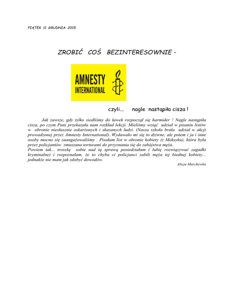 PIĄTEK 11 GRUDNIA 2015 ZROBIĆ COŚ BEZINTERESOWNIE - czyli... nagle nastąpiła cisza ! Jak zawsze, gdy tylko siedliśmy do ławek rozpoczął się harmider ! Nagle nastąpiła cisza, po czym Pani przekazała nam rozkład lekcji. Mieliśmy wziąć udział w pisaniu listów w obronie niesłusznie oskarżonych i skazanych ludzi. (Nasza szkoła brała udział w akcji prowadzonej przez Amnesty International). Wydawało mi się to dziwne, ale potem i ja i inne osoby mocno się zaangażowaliśmy . Pisałam list w obronie kobiety (z Meksyku), która była przez policjantów zmuszana torturami do przyznania się do zabójstwa męża. Powiem tak... troszkę sobie nad tą sprawą posiedziałam ( lubię rozwiązywać zagadki kryminalne) i rozpoznałam, że to chyba ci policjanci zabili męża tej biednej kobiety... jednakże nie mam jak zdobyć dowodów. Alicja Marchewka