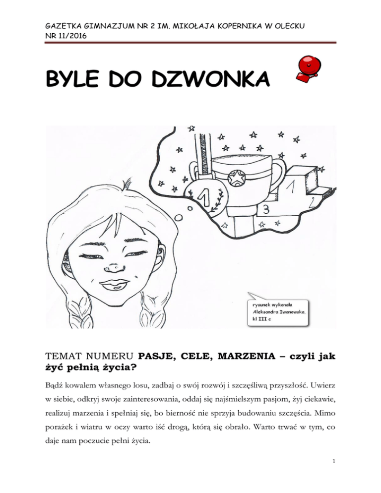 GAZETKA GIMNAZJUM NR 2 IM. MIKOŁAJA KOPERNIKA W OLECKU NR 11/2016 BYLE DO DZWONKA TEMAT NUMERU PASJE, CELE, MARZENIA – czyli jak żyć pełnią życia? Bądź kowalem własnego losu, zadbaj o swój rozwój i szczęśliwą przyszłość. Uwierz w siebie, odkryj swoje zainteresowania, oddaj się najśmielszym pasjom, żyj ciekawie, realizuj marzenia i spełniaj się, bo bierność nie sprzyja budowaniu szczęścia. Mimo porażek i wiatru w oczy warto iść drogą, którą się obrało. Warto trwać w tym, co daje nam poczucie pełni życia. 1 GAZETKA GIMNAZJUM NR 2 IM. MIKOŁAJA KOPERNIKA W OLECKU NR 11/2016 wartościowe, Drodzy Czytelnicy! ponieważ długo nad tym pracowaliśmy. Kolejny numer dedykujemy Martyna, kl. III d wszystkim pasjonatom, tym, którzy są ciekawi świata, zdolni do marzeń i mają wyobraźnię bez granic, tym, Warto marzyć, lecz jeszcze bardziej warto którzy wierzą w siebie, mają odwagę pytać, zamieniać nasze marzenia na plany. To daje nam sięgać dalej, spoglądać inaczej. większą mobilizację, do osiągnięcia wyznaczonych celów. Pamiętajmy, ze jeśli Ten, kto ma wizję i odwagę, by jej bronić, z potrafimy cos zaplanować, potrafimy to także pewnością osiągnie sukces. Pamiętaj, „marzenia zrealizować, wystarczy tylko nad tym pracować. Julia, kl. III c się spełniają, tylko mocno, mocno w nie wierz”. Miłej lektury życzy, Magdalena Nyga opiekun Koła dziennikarskiego Czy warto marzyć? Marzenia są nieodłącznym elementem życia człowieka, marzy każdy, bogaty czy biedny, są marzenia dalekosiężne jak i te bliskie, tylko trzeba umieć je przeanalizować, odpowiednio zabrać się za ich realizację, aby Czy warto marzyć? – sonda mogły się spełnić. Uważam że każde, nawet te wydawałoby się niemożliwe marzenia są realne, lecz to od nas zależy, czy podejmiemy adekwatne kroki, które przybliżą nas do osiągnięcia celu. Uważam że warto marzyć, kim bylibyśmy bez marzeń, które napędzają nas do działania? Aleksandra, kl. III c Marzenia nadają naszemu życiu kolorów. Człowiek pozbawiony marzeń odczuwa w życiu pustkę, nicość, nic go nie cieszy. Marzenia nie należą do sfery materialnej, a bardziej wartościowej – duchowej, która zbawiennie wpływa na nasz rozwój. Uważam, że warto, a Bez marzeń, nasze życie nie ma sensu. Jeżeli marzymy mamy cel, do którego dążymy i to staje nawet trzeba marzyć. Jakub, kl. I f sie motorem wszystkich naszych działań. Świat staje się piękniejszy i barwniejszy. A to co Sondę przeprowadziła Aleksandra Morus, osiągniemy jest bardziej przez nas doceniane i kl. III c 2 GAZETKA GIMNAZJUM NR 2 IM. MIKOŁAJA KOPERNIKA W OLECKU NR 11/2016 Wiem, co chciałabym robić moich ulubionych seriali, co również bardzo pomaga mi w nauce. w przyszłości – rozmowa z Moniką Drobiszewską Czy wiążesz przyszłość ze swoją pasją? Tak, w przyszłości chciałabym zostać Czy od zawsze interesowały cię języki obce? tłumaczem. Ten zawód da mi możliwość Języki obce interesowały mnie od małego, rozwoju i robienia tego, co lubię jednocześnie. ponieważ duża część mojej rodziny mieszka w Anglii, a ja podczas wizyt miałam okazję Czy masz jeszcze inne zainteresowania? obserwować tamtejszą kulturę i zafascynować się Interesuję się wieloma rzeczami. Od książek po językiem angielskim. Dodatkowo moją pasję sport i zdrowie odżywianie, jednak moją lingwistyczną mogłam największą pasją zawsze będą języki obce. zagranicznym bajkom rozwijać i dzięki serialom, które oglądałam. Co poradziłabyś innym, by udało im się osiągnąć ich cele? Ludzie bardzo często wyznaczają sobie ambitne cele, ale nawet najmniejsze niepowodzenia podcinają im skrzydła, a słomiany zapał uniemożliwia zrealizowanie pragnienia. Najważniejsza w osiągnięciu wymarzonego celu jest determinacja i samozaparcie. Musimy ciężko pracować i się nie Ile znasz języków? Jeżeli są takie, których nauki nie oferuje twoja szkoła, to w jaki sposób się ich uczysz? Biegle posługuję angielskim i się językiem hiszpańskim, a w polskim, stopniu komunikatywnym rosyjski i niemiecki. Obecnie mam możliwość uczenia się dwóch języków, ale dzięki szkole w Wielkiej Brytanii udoskonaliłam swój angielski i nauczyłam się hiszpańskiego poddawać, nawet jeśli nasza droga do realizacji zamierzeń jest kręta i pełna przeciwności. Myślę, że przysłowie „bez pracy nie ma kołaczy” jak najbardziej oddaje trud, jaki wiąże się ze spełnianiem naszych marzeń. Jeśli się nie wysilimy i nie włożymy całego serca w dążenie do realizacji planów, to nie osiągniemy sukcesu. Wywiad przeprowadziła: Dominika Słomska, kl. III c oraz niemieckiego. Aby utrwalać i poszerzać swoją wiedzę korzystam z różnych aplikacji internetowych, które w nauce języków są bardzo pomocne. Dodatkowo zajmuję się tłumaczeniem 3 GAZETKA GIMNAZJUM NR 2 IM. MIKOŁAJA KOPERNIKA W OLECKU NR 11/2016 Podróże – te małe i te duże, hotelu. „Będę starał się was zachęcić do wyjścia czyli pasja do podróżowania ze swojej strefy komfortu, do rezygnacji z pomocy biur podróży i samodzielnej eksploracji wybranego kraju. W ten sposób nie tylko Od kiedy tylko pamiętam zawsze lubiłam oszczędzicie pieniądze, ale przede wszystkim odkrywać nieznane krainy. Podróże stały się nabierzecie nieodłączną częścią mojej fascynacji. Jako przeżyjecie swoją własną przygodę, a satysfakcja dziecko traktowałam je jak rozrywkę, teraz, stały po się one moją pasją. najpiękniejszych wakacjach All Inclusive” – pisze takich wiary w swoje wakacjach możliwości, smakuje lepiej od znany podróżnik – Marek Warmuz. Sama, z prawdziwym podróżowaniem zetknęłam się już dawno temu. Często mieszkałam w hostelach, wynajętych domkach czy nawet w domu nieznanych mi wcześniej osób. Podróżowanie pomaga mi lepiej zrozumieć innych i odejść od oceniania świata i 