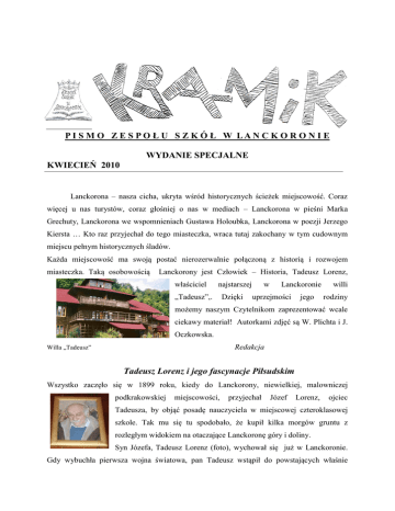 P I S M O Z E S P O Ł U S Z K Ó Ł W LA N C K O R O N I E WYDANIE SPECJALNE KWIECIEŃ 2010 Lanckorona – nasza cicha, ukryta wśród historycznych ścieżek miejscowość. Coraz więcej u nas turystów, coraz głośniej o nas w mediach – Lanckorona w pieśni Marka Grechuty, Lanckorona we wspomnieniach Gustawa Holoubka, Lanckorona w poezji Jerzego Kiersta … Kto raz przyjechał do tego miasteczka, wraca tutaj zakochany w tym cudownym miejscu pełnym historycznych śladów. Każda miejscowość ma swoją postać nierozerwalnie połączoną z historią i rozwojem miasteczka. Taką osobowością Lanckorony jest Człowiek – Historia, Tadeusz Lorenz, właściciel najstarszej „Tadeusz”,. Dzięki w Lanckoronie uprzejmości jego willi rodziny możemy naszym Czytelnikom zaprezentować wcale ciekawy materiał! Autorkami zdjęć są W. Plichta i J. Oczkowska. Willa „Tadeusz” Redakcja Tadeusz Lorenz i jego fascynacje Piłsudskim Wszystko zaczęło się w 1899 roku, kiedy do Lanckorony, niewielkiej, malowniczej podkrakowskiej miejscowości, przyjechał Józef Lorenz, ojciec Tadeusza, by objąć posadę nauczyciela w miejscowej czteroklasowej szkole. Tak mu się tu spodobało, że kupił kilka morgów gruntu z rozległym widokiem na otaczające Lanckoronę góry i doliny. Syn Józefa, Tadeusz Lorenz (foto), wychował się już w Lanckoronie. Gdy wybuchła pierwsza wojna światowa, pan Tadeusz wstąpił do powstających właśnie Legionów, gdzie służył w artylerii. Potem znalazł się w sztabie Józefa Piłsudskiego jako wojskowy do zadań specjalnych. Dosyć bliskie związki, a nawet pewna zażyłość z Komendantem, jak również z ówczesnymi oficerami - Ignacym Mościckim, Rydzem Śmigłym i Józefem Beckiem - zaowocowały licznymi pamiątkami pieczołowicie przechowywanymi aż do dziś w lanckorońskiej willi „Tadeusz”. Pensjonat „Tadeusz” funkcjonuje nieprzerwanie od 1926r. Przetrwał niespokojne czasy II wojny światowej, obecność rosyjskich dygnitarzy. Celowo zachowano autentyczny wystrój tego domu z licznymi pamiątkami świadczącymi o fascynacji gospodarza Józefem Piłsudskim. PAMIĄTKI ŚWIADCZĄCE O FASCYNACJI TADEUSZA LORENZA JÓZEFEM PIŁSUDSKIM Pokój - izba pamięci Józefa Piłsudskiego. 2 Pamiątkowy dyplom budowy Kopca Piłsudskiego i łopatka. Legiony i Piłsudski – temat wiodący wśród pamiątek Lorenzów. 3 Zdjęcie Kopca Medale za pomoc w usypywaniu Kopca Piłsudskiego. Pamiątki rodzinne Lorenzów listy, zdjęcia, rysunki łączą się z historycznymi wydarzeniami… Liczne odznaczenia, wycinki prasowe, 4 Srebrny Krzyż Zasługi Willa „Tadeusz” osiągnęła szacowny wiek osiemdziesięciu lat. Dziś z wielkim sukcesem dzieło pradziadka, dziadka i ojca kontynuują pani Alicja i jej mąż Jacek Łomnicki. Atmosferę zasiedzenia i dawności odczuwa się zwłaszcza we wnętrzu domu. Wypełniają je pamiętające przełom XIX i XX wieku ciężkie, solidne meble z ciemnego drewna: wielki stół, przy którym może zasiąść kilkanaście osób, przepastne kredensy, stylowe komody i szafy. A na ścianach - niby w legionowej izbie pamięci - mnóstwo pamiątek z tamtego czasu: wycinki z gazet, oprawione starannie w ramki listy, rozkazy oraz zdjęcia, odznaczenia, karykatury, broń i liczne portrety Marszałka, które wisiały tu niezmiennie i za Hitlera, i za Stalina. Goście zatrzymujący się w pensjonacie mają okazję wziąć udział w interesującej lekcji historii… Wiktoria Plichta, Justyna Oczkowska KRAMIK – PISMO ZESPOŁU SZKÓŁ W LANCKORONIE Adres redakcji: Zespól Szkół w Lanckoronie 34-143 Lanckorona tel. (033) 8763590 Redaguje zespół pod opieką J. Buckiej. Kontakt: [email protected] 5