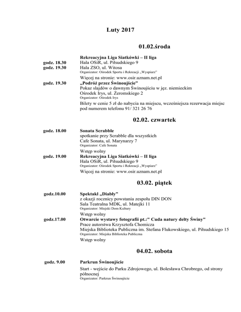 Luty 2017 01.02.środa godz. 18.30 godz. 19.30 Rekreacyjna Liga Siatkówki – II liga Hala OSiR, ul. Piłsudskiego 9 Hala ZSO, ul. Witosa Organizator: Ośrodek Sportu i Rekreacji „Wyspiarz” godz. 19.30 Więcej na stronie: www.osir.uznam.net.pl „Podróż przez Świnoujście” Pokaz slajdów o dawnym Świnoujściu w jęz. niemieckim Ośrodek Irys, ul. Żeromskiego 2 Organizator: Ośrodek Irys Bilety w cenie 5 zł do nabycia na miejscu, wcześniejsza rezerwacja miejsc pod numerem telefonu 91/ 321 26 76 02.02. czwartek godz. 18.00 Sonata Scrabble spotkanie przy Scrabble dla wszystkich Cafe Sonata, ul. Marynarzy 7 Organizator: Cafe Sonata godz. 19.00 Wstęp wolny Rekreacyjna Liga Siatkówki – II liga Hala OSiR, ul. Piłsudskiego 9 Organizator: Ośrodek Sportu i Rekreacji „Wyspiarz” Więcej na stronie: www.osir.uznam.net.pl 03.02. piątek godz.10.00 Spektakl „Diabły” z okazji rocznicy powstania zespołu DIN DON Sala Teatralna MDK, ul. Matejki 11 Organizator: Miejski Dom Kultury godz.17.00 Wstęp wolny Otwarcie wystawy fotografii pt.:" Cuda natury delty Świny" Prace autorstwa Krzysztofa Chomicza Miejska Biblioteka Publiczna im. Stefana Flukowskiego, ul. Piłsudskiego 15 Organizator: Miejska Biblioteka Publiczna Wstęp wolny 04.02. sobota godz. 9.00 Parkrun Świnoujście Start - wejście do Parku Zdrojowego, ul. Bolesława Chrobrego, od strony północnej Organizator: Parkrun Świnoujście godz. 10.00-14.00 Więcej na stronie: www.parkrun.pl/swinoujscie Dziecięcy Targ Pasaż Rondo, Plac Wolności 6 Organizator: Przedsiębiorcy z Pasażu Rondo, Akademia Każdego Wieku godz. 15.00 Halowy Turniej Tenisa Ziemnego o puchar Dyrektora OSiR „Wyspiarz” w kategorii MIXT gry eliminacyjne (w grupach) Hala Tenisowa OSiR, ul. Matejki 17 A Organizator: Ośrodek Sportu i Rekreacji „Wyspiarz” Zapisy do piątki 03.02., do godz.19.00, losowanie godz.19.00, Hala Tenisowa OSiR, tel. 91 322 21 06 Więcej na stronie: www.osir.uznam.net.pl 05.02. niedziela godz. 10.30 godz. 11.45 Świnoujska Basket Liga – VII edycja Hala OSiR, ul. Piłsudskiego 9 Organizator: Ośrodek Sportu i Rekreacji „Wyspiarz” Więcej na stronie:swibas.pl godz.15.30 Halowy Turniej Tenisa Ziemnego o puchar Dyrektora OSiR „Wyspiarz” w kategorii MIXT półfinały i finały Hala Tenisowa OSiR, ul. Matejki 17 A Organizator: Ośrodek Sportu i Rekreacji „Wyspiarz” Zapisy do piątki 03.02., do godz.19.00, losowanie godz.19.00, Hala Tenisowa OSiR, tel. 91 322 21 06 Więcej na stronie: www.osir.uznam.net.pl 07.02. wtorek godz. 15.30 Koncert Trzech Tenorów Sanatorium Uzdrowiskowe „Rybniczanka”, ul. Kasprowicza 14 Organizator: Biuro Turystyczne „Wybrzeże” godz.17.00 Bilety w cenie 30 zł do nabycia w Biurze Turystycznym „Wybrzeże”, ul. Słowackiego 23, tel. 91/321 20 23 Koncert Orkiestry Wojskowej i uczniów Państwowej Szkoły Muzycznej I stopnia w Świnoujściu Sala Teatralna MDK, ul. Matejki 11 Organizator: Miejski Dom Kultury, Państwowa Szkoła Muzyczna I stopnia w Świnoujściu, Orkiestra Wojskowa ze Świnoujścia godz.19.30 Wstęp wolny Wieczór muzyczny akordeon i saksofon – Mirosław Sienicki Ośrodek Irys, ul. Żeromskiego 2 Organizator: Ośrodek Irys Bilety w cenie 5 zł do nabycia na miejscu, wcześniejsza rezerwacja miejsc pod numerem telefonu 91/ 321 26 76 08.02. środa godz. 17.30 godz. 18.30 godz. 19.30 Rekreacyjna Liga Siatkówki – I liga Hala ZSO, ul. Witosa Rekreacyjna Liga Siatkówki – II liga Hala OSiR, ul. Piłsudskiego 9 Hala ZSO, ul. Witosa Organizator: Ośrodek Sportu i Rekreacji „Wyspiarz” Więcej na stronie: www.osir.uznam.net.pl 09.02. czwartek godz.16.00 Koncert urodzinowy zespołu Biedronki mi solistów MDK Warszów Filia MDK Warszów, ul. Sosnowa 18 Organizator: Miejski Dom Kultury godz. 18.00 Wstęp wolny Sonata Scrabble spotkanie przy Scrabble dla wszystkich Cafe Sonata, ul. Marynarzy 7 Organizator: Cafe Sonata godz. 19.00 Wstęp wolny Rekreacyjna Liga Siatkówki – II liga Hala OSiR, ul. Piłsudskiego 9 Organizator: Ośrodek Sportu i Rekreacji „Wyspiarz” Więcej na stronie: www.osir.uznam.net.pl 10.02. piątek godz.18.00 Otwarcie wystawy prac członków koła plastycznego Uniwersytetu Trzeciego Wieku z okazji 10. lecia Galeria Art. Miejskiego Domu Kultury, ul. Wojska Polskiego 1/1 Organizator: Miejski Dom Kultury, Uniwersytet Trzeciego Wieku Wstęp wolny 11.02. sobota godz. 9.00 Parkrun Świnoujście Start - wejście do Parku Zdrojowego, ul. Bolesława Chrobrego, od strony północnej Organizator: Parkrun Świnoujście godz. 10.00 - 14.00 Więcej na stronie: www.parkrun.pl/swinoujscie Jarmark Rękodzieła Artystycznego Pasaż Rondo, Plac Wolności 6 Organizator: Przedsiębiorcy z Pasażu Rondo, Akademia Każdego Wieku godz. 12.00 godz.15.00 Uniwersytet Trzeciego Wieku Wykład dr. Józefa Plucińskiego Wykład prof. Anety Zelek Sala Teatralna MDK, ul. Matejki 11 Organizator: Miejski Dom Kultury, Uniwersytet Trzeciego Wieku godz. 18.00 Wstęp wolny Otwarcie wystawy pt.: Pobliże malarstwo, rysunek, fotografia artystów z Polski i Niemiec Galeria Sztuki Współczesnej ms44, ul. Armii Krajowej 13 Organizator: Galeria Sztuki Współczesnej ms 44 Wstęp wolny 12.02. niedziela godz. 9.00 - 11.30 Giełda numizmatyczna monety, banknoty, odznaczenia, medale, widokówki, znaczki, itp. Ciastkarnia „Karpatka”, ul. Grunwaldzka 47 a Organizator: Koło Filatelistyczne w Świnoujściu godz. 10.30 godz. 11.45 Wstęp wolny Świnoujska Basket Liga – VII edycja Hala OSiR, ul. Piłsudskiego 9 Organizator: Ośrodek Sportu i Rekreacji „Wyspiarz” godz. 19.30 Więcej na stronie:swibas.pl Rekreacyjna Liga Siatkówki – I liga Hala OSiR, ul. Piłsudskiego 9 Organizator: Ośrodek Sportu i Rekreacji „Wyspiarz” Więcej na stronie: www.osir.uznam.net.pl 13.02.-26.02 Ferie zimowe zgodnie z oddzielnym harmonogramem www.swinoujscie.pl 14.02. wtorek godz.19.30 Wieczór muzyczny akordeon i saksofon – Mirosław Sienicki Ośrodek Irys, ul. Żeromskiego 2 Organizator: Ośrodek 