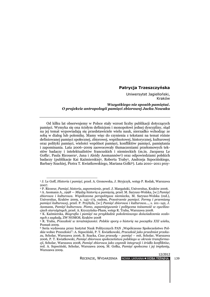 Patrycja Trzeszczyńska Uniwersytet Jagielloński, Kraków Wszystkiego nie sposób pamiętać. O projekcie antropologii pamięci zbiorowej Jacka Nowaka Od kilku lat obserwujemy w Polsce stały wzrost liczby publikacji dotyczących pamięci. Wymyka się ona ścisłym definicjom i monopolowi jednej dyscypliny, stąd na jej temat wypowiadają się przedstawiciele wielu nauk, nierzadko wchodząc ze sobą w dialog lub polemikę. Mamy więc do czynienia z tekstami na temat różnie definiowanej pamięci społecznej, zbiorowej, wspólnotowej, historycznej, kulturowej oraz polityki pamięci, wielości wspólnot pamięci, konfliktów pamięci, pamiętania i zapominania. Lata 2006–2009 zaowocowały tłumaczeniami przełomowych tekstów badaczy i intelektualistów francuskich i niemieckich (m.in. Jacquesa Le Goffa1, Paula Ricouera2, Jana i Aleidy Assmannów3) oraz odpowiedziami polskich badaczy (publikacje Kai Kaźmierskiej4, Roberta Traby5, Andrzeja Szpocińskiego, Barbary Szackiej, Piotra T. Kwiatkowskiego, Mariana Golki6). Lata 2010–2011 przy- J. Le Goff, Historia i pamięć, przeł. A. Gronowska, J. Stryjczyk, wstęp P. Rodak, Warszawa 2007. 2 P. Ricoeur, Pamięć, historia, zapomnienie, przeł. J. Margański, Universitas, Kraków 2006. 3 A. Assmann A., 1998 — Między historią a pamięcią, przeł. M. Saryusz-Wolska, [w:] Pamięć zbiorowa i kulturowa. Współczesna perspektywa niemiecka, M. Saryusz-Wolska (red.), Universitas, Kraków 2009, s. 143–173, eadem, Przestrzenie pamięci. Formy i przemiany pamięci kulturowej, przeł. P. Przybyła, [w:] Pamięć zbiorowa i kulturowa…, s. 101–142, J. Assmann, Pamięć kulturowa. Pismo, zapamiętywanie i polityczna tożsamość w cywilizacjach starożytnych, przeł. A. Kryczyńska-Pham, wstęp R. Traba, Warszawa 2008. 4 K. Kaźmierska, Biografia i pamięć na przykładzie pokoleniowego doświadczenia ocalonych z zagłady, ZW NOMOS, Kraków 2008 5 R. Traba, Przeszłość w teraźniejszości. Polskie spory o historię na początku XXI wieku, Poznań 2009. 6 Seria wydawana przez Instytut Nauk Politycznych PAN „Współczesne Społeczeństwo Polskie wobec Przeszłości”: A. Szpociński, P. T. Kwiatkowski, Przeszłość jako przedmiot przekazu, Scholar, Warszawa 2006, B. Szacka, Czas przeszły – pamięć – mit, Scholar, Warszawa 2006, P. T. Kwiatkowski, Pamięć zbiorowa społeczeństwa polskiego w okresie transformacji, Scholar, Warszawa 2008, Pamięć zbiorowa jako czynnik integracji i źródło konfliktów, red. A. Szpociński, Scholar, Warszawa 2009, M. Golka, Pamięć społeczna i jej implanty, Warszawa 2009. 12/2012 1 RECENZJE, WYDARZENIA 139 140 Patrycja Trzeszczyńska niosły książki socjologów7, kulturoznawców8, historyków9, a także pokłosia konferencji10. O ile wszystkie te pozycje wskazują na coraz większą tendencję do uszczegóławiania i zawężania wywodu o pamięci, o tyle książka Jacka Nowaka11 ma zdecydowanie odmienne ambicje: zebrać dyskusje i stworzyć kompendium o pamięci w naukach społecznych. Gdyby nie szereg czynników, które czynią tę pracę dyskusyjną, można byłoby pokusić się o dostrzeżenie tu prototypu podręcznika o pamięci zbiorowej na gruncie antropologii. Publikacja Społeczne reguły pamiętania stanowi podsumowanie kilkuletnich zainteresowań autora zagadnieniem pamięci w Europie Środkowo-Wschodniej, szczególnie na Ukrainie. Mimo że w wielu miejscach książki twierdzi on, iż zbiera w niej refleksje i wnioski z badań prowadzonych nad pamięcią od połowy lat dziewięćdziesiątych, czytelnik znający teksty tego autora, na czele z posiadającą dwa wydania książką Zaginiony świat? Nazywają ich Łemkami12, zauważy brak owych „pamięciowych wątków” w jego pisarstwie przed 2006 r. Niemniej, Społeczne reguły… niewątpliwie przykuwają uwagę rozmachem teoretycznym i liczbą ilustracji refleksji autora o społecznych uwarunkowaniach pamięci w naszej części Europy. Książka składa się z dwóch części: teoretycznej, poświęconej zagadnieniu pamięci zbiorowej i jej przemianom w różnych kontekstach oraz empirycznej, stanowiącej ilustrację refleksji autora, opartej na badaniach prowadzonych w latach 1996–2006 przede wszystkim na zachodniej Ukrainie w kilku wsiach rajonu halickiego w obwodzie iwano-frankowskim (choć podstawą, jak pisze Nowak, są także badania prowadzone na potrzeby poprzedniej książki na Słowacji i na Łemkowszczyźnie). Całość podzielona jest na siedem rozdziałów, opatrzonych wstępem, zakończeniem, bibliografią i krótkim indeksem rzeczowym oraz anglojęzycznym streszczeniem. We wstępie autor przybliża czytelnikowi cel książki: „analizę natury pamięci zbiorowej”. W jego zamierzeniu ma ona stanowić wieloaspektowy wykład o negocjowaniu jednostkowych pamięci przez członków grup, uzgadnianiu znaczeń w obrębie pamięci o różnie doświadczonych wydarzeniach, gry pamięci z tożsamością grupową oraz procesach jej demokratyzacji i instrumentalizacji. Autor zapowiada tu swój projekt antropologii pamięci zbiorowej jako podstawy tożsamości grup etnicznych i narodów w Europie Środkowo-Wschodniej po upadku komunizmu. Mimo że nie precyzuje ani tu, ani w innym miejscu książki, jakim rozumieniem pamięci będzie się posługiwał, stosując termin „pamięć kolektywna” wymiennie ze „społeczną”, „wspólnotową” i „zbiorową”, definiuje ją jako „zestaw wyobrażeń członków wspólnoty o jej przeszłości, uzgadniany w aktach komunikacji wewnętrznej, przekazywany w drodze międzypokoleniowej transmisji w celu utrzymania spójnej narracji tożsamościowej” (s. 13). Autor koncentruje się na „kulturowych skutkach pamięci”, na jej przejawach w życiu wspólnot. Choć, jak podkreśla, nie jest 7 A. Szpociński, B. Szacka, P. T. Kwiatkowski, L. M. Nijakowski, Między codziennością a wielką historią. Druga wojna światowa w pamięć zbiorowej społeczeństwa polskiego, Scholar, War