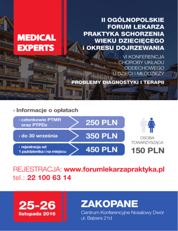II OGÓLNOPOLSKIE FORUM LEKARZA PRAKTYKA SCHORZENIA WIEKU DZIECIĘCEGO i OKRESU DOJRZEWANIA VI KONFERENCJA CHOROBY UKŁADU ODDECHOWEGO U DZIECI I MŁODZIEŻY PROBLEMY DIAGNOSTYKI I TERAPII › Informacje o opłatach › członkowie PTMR oraz PTPDz 250 PLN › do 30 września 350 PLN › rejestracja od 1 paździenika i na miejscu 450 PLN OSOBA TOWARZYSZĄCA 150 PLN REJESTRACJA: www.forumlekarzapraktyka.pl tel.: 22 100 63 14 25-26 listopada 2016 ZAKOPANE Centrum Konferencyjne Nosalowy Dwór ul. Balzera 21d PROGRAM 25.11.2016 (PIĄTEK) 10:00 – 19:00 REJESTRACJA UCZESTNIKÓW KONFERENCJI WARSZTATY PRAKTYCZNE (Nowoczesna diagnostyka w chorobach układu oddechowego: oscylometria, spirometria, usg płuc, poziom tlenku azotu, refluks gardłowo-krtaniowy, CRP) POCZĘSTUNEK REGIONALNY OTWARCIE KONFERENCJI WYKŁAD INAUGURACYJNY: KOMPAS POZ 2016 Rozpoznawanie i leczenie astmy wczesnodziecięcej w podstawowej opiece zdrowotnej – pierwsze polskie wytyczne SESJA I Leczenie wspomagające w zakażeniach ukłaadu oddechowego u dzieci A.D. 2016 CIEKAWE PRZYPADKI PULMONOLOGICZNE HOT TOPIC I – Rekomendacje postępowania w kaszlu u dzieci. Konsensus 2016 SESJA II ALERGOLOGIA I PNEUMONOLOGIA DZIECIĘCA Alergiczny nieżyt nosa, atopowe zapalenie skóry, leczenie inhalacyjne u dzieci HOT TOPIC II – Immunomodulacja w chorobach układu oddechowego u dzieci 26.11.2016 (SOBOTA) 09:00 – 16:30 WARSZTATY PRAKTYCZNE (główna sala konferencyjna) Ciężkie zakażenie, czy łagodna infekcja... stany zagrożenia w chorobach infekcyjnych u dzieci SESJA III SZCZEPIENIA OCHRONNE – VADEMECUM LEKARZA PRAKTYKA Przychodzi pacjent na szczepienie... czyli od ogółu do szczegółu; szczepienia ochronne u chorych przewlekle; szczepienia – fakty i mity SESJA IV CHOROBY SKÓRY DLA NIE-DERMATOLOGA Choroby młodej skóry; AZS; trądzik WARSZTATY PRAKTYCZNE (główna sala konferencyjna) – mokre opatrunki SESJA V BÓL NIEJEDNO MA IMIĘ... Gorączka i ból u dziecka; bóle brzucha niewiadomego pochodzenia; bóle menstruacyjne; neuropatia cukrzycowa; ból można i trzeba leczyć SESJA VI CHOROBY UKŁADU MOCZOWEGO Moczenie nocne u dzieci; nietrzymanie moczu o różnej etiologii – możliwości profilaktyki i terapii; nawracające zakażenia układu moczowego SESJA VII NEUROPSYCHIATRIA DLA POZ zaburzenia snu; depresja; lęk; nowoczesne leczenie padaczki IGNORANTIA IURIS NOCET (nieznajomość prawa szkodzi) problemy i zagrożenia w codziennej praktyce lekarskiej; konsekwencje błędów w prowadzeniu dokumentacji medycznej; pozwy sądowe pacjent vs. lekarz Kontakt: PODSUMOWANIE I ZAKOŃCZENIE KONFERENCJI 22 100 63 14