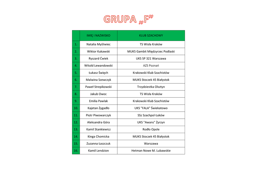 IMIĘ I NAZWISKO KLUB SZACHOWY 1. Natalia Myśliwiec TS Wisła Kraków 2. Wiktor Kukawski MUKS Gambit Międzyrzec Podlaski 3. Ryszard Ćwiek UKS SP 321 Warszawa 4. Witold Lewandowski AZS Poznań 5. Łukasz Święch Krakowski Klub Szachistów 6. Malwina Szewczyk MUKS Stoczek 45 Białystok 7. Paweł Strepikowski Trzydziestka Olsztyn 8. Jakub Owoc TS Wisła Kraków 9. Emilia Pawlak Krakowski Klub Szachistów 10. Kajetan Żygadło UKS "FALA" Świekatowo 11. Piotr Piwowarczyk SSz Szachpol Łuków 12. Aleksandra Góra UKS "Awans" Żyrzyn 13. Kamil Stankiewicz Rodło Opole 14. Kinga Chomicka MUKS Stoczek 45 Białystok 15. Zuzanna Łaszczuk Warszawa 16. Kamil Lendzion Hetman Nowe M. Lubawskie