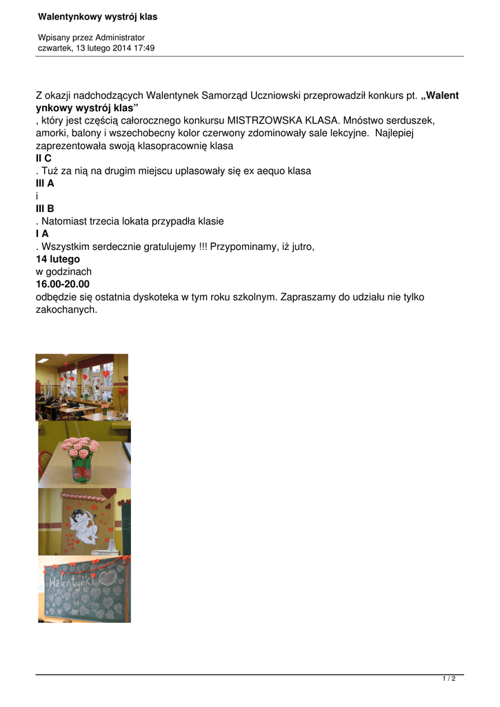 Walentynkowy wystrój klas Wpisany przez Administrator czwartek, 13 lutego 2014 17:49 Z okazji nadchodzących Walentynek Samorząd Uczniowski przeprowadził konkurs pt. „Walent ynkowy wystrój klas” , który jest częścią całorocznego konkursu MISTRZOWSKA KLASA. Mnóstwo serduszek, amorki, balony i wszechobecny kolor czerwony zdominowały sale lekcyjne. Najlepiej zaprezentowała swoją klasopracownię klasa II C . Tuż za nią na drugim miejscu uplasowały się ex aequo klasa III A i III B . Natomiast trzecia lokata przypadła klasie IA . Wszystkim serdecznie gratulujemy !!! Przypominamy, iż jutro, 14 lutego w godzinach 16.00-20.00 odbędzie się ostatnia dyskoteka w tym roku szkolnym. Zapraszamy do udziału nie tylko zakochanych. 1/2 Walentynkowy wystrój klas Wpisany przez Administrator czwartek, 13 lutego 2014 17:49 2/2