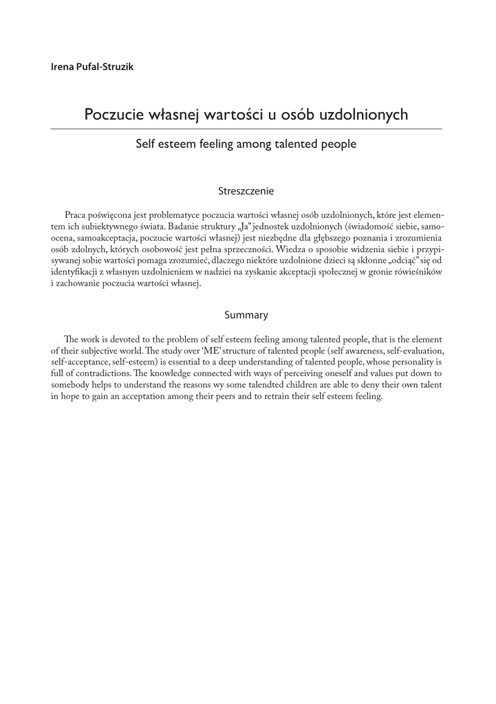 Irena Pufal-Struzik Poczucie własnej wartości u osób uzdolnionych Self esteem feeling among talented people Streszczenie Praca poświęcona jest problematyce poczucia wartości własnej osób uzdolnionych, które jest elementem ich subiektywnego świata. Badanie struktury „Ja” jednostek uzdolnionych (świadomość siebie, samoocena, samoakceptacja, poczucie wartości własnej) jest niezbędne dla głębszego poznania i zrozumienia osób zdolnych, których osobowość jest pełna sprzeczności. Wiedza o sposobie widzenia siebie i przypisywanej sobie wartości pomaga zrozumieć, dlaczego niektóre uzdolnione dzieci są skłonne „odciąć” się od identyfikacji z własnym uzdolnieniem w nadziei na zyskanie akceptacji społecznej w gronie rówieśników i zachowanie poczucia wartości własnej. Summary The work is devoted to the problem of self esteem feeling among talented people, that is the element of their subjective world. The study over ‘ME’ structure of talented people (self awareness, self-evaluation, self-acceptance, self-esteem) is essential to a deep understanding of talented people, whose personality is full of contradictions. The knowledge connected with ways of perceiving oneself and values put down to somebody helps to understand the reasons wy some talendted children are able to deny their own talent in hope to gain an acceptation among their peers and to retrain their self esteem feeling.
