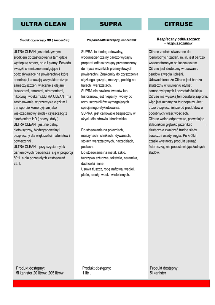 ULTRA CLEAN Środek czyszczący HD ( koncentrat) ULTRA CLEAN jest efektywnym środkiem do zastosowania tam gdzie występują smary, brud i plamy. Posiada związki chemiczne emulgujące i oddziaływujące na powierzchnie które penetrują i usuwają wszystkie rodzaje zanieczyszczeń włącznie z olejami, tłuszczami, smarami, atramentami, nikotyną i woskami.ULTRA CLEAN ma zastosowanie w przemyśle ciężkim i transporcie komercyjnym jako wielozadaniowy środek czyszczący z określeniem HD ( heavy duty ). ULTRA CLEAN jest nie palny, nietoksyczny, biodegradowalny i bezpieczny dla większości materiałów i powierzchni . ULTRA CLEAN przy użyciu myjek ciśnieniowych rozcieńcza się w proporcji 50:1 a dla pozostałych zastosowań 25:1. Produkt dostępny: 5l kanister 20 litrów, 205 litrów SUPRA CITRUSE Preparat odtłuszczający, koncentrat Bezpieczny odtłuszczacz - rozpuszczalnik SUPRA to biodegradowalny, wodorozcieńczalny bardzo wydajny preparat odtłuszczający przeznaczony do mycia wszelkich przemysłowych powierzchni. Znakomity do czyszczenia ciężkiego sprzętu, maszyn, podłóg na halach i warsztatach. SUPRA nie zawiera kwasów lub fosforanów, jest niepalny i wolny od rozpuszczalników wymagających specjalnego etykietowania. SUPRA jest całkowicie bezpieczny w użyciu dla zdrowia i środowiska. Do stosowania na pojazdach, maszynach i silnikach, dywanach, stołach warsztatowych, narzędziach, podłach. Do stosowania na metal, szkło, tworzywa sztuczne, tekstylia, ceramika, dachówki i inne. Usuwa tłuszcz, ropę naftową, węgiel, pleśń, smołę, wosk i wiele innych. Produkt dostępny: 1 litr . Citruse zostało stworzone do różnorodnych zadań, m. in. jest bardzo wszechstronnym odtłuszczaczem. Citruse jest skuteczny w usuwaniu osadów z węgla i pleśni. Udowodniono, że Citruse jest bardzo skuteczny w usuwaniu etykiet samoprzylepnych i pozostałości kleju. Citruse ma wysoką temperaturę zapłonu, więc jest uznany za trudnopalny. Jest dużo bezpieczniejsze od produktów o podobnych właściwościach. Citruse wolno odparowuje, pozwalając składnikom głęboko przenikać i skutecznie zwalczać trudne ślady tłuszczu i osady węgla. Po krótkim czasie wystarczy produkt usunąć ściereczką, nie pozostawiając żadnych śladów. Produkt dostępny: 5l kanister MAD-SOLV 1 MAD-SOLV 2 MAD-SOLV 3 Rozpuszczający i odtłuszczający środek czyszczący Siła rozpuszczalnika: średnia Prędkość wyparowania: średnia Szybkodziałający rozpuszczalnik czyszczący Siła rozpuszczalnika: mocna Prędkość wyparowania: szybka Środek rozpuszczający odtłuszczający Siła rozpuszczalnika:łagodna Prędkość wyparowania: szybka MAD-SOLV 1 jest silnym środkiem rozpuszczającym który zawiera jedynie czyste rozpuszczalniki, które nie pozostawiają żadnych osadów, mogą być używane do czyszczenia przewodów elektronicznych i elektrycznych. Dla bezpieczeństwa podczas używania MAD-SOLV 1 zaleca się wyłączenie wszystkich silników i włączników prądu oraz elementy, które mają tendencje do nagrzewania się podczas pracy powinny ostygnąć przed zastosowaniem produktu. MAD-SOLV 1 ma wyższy stopień OEL niż trójchlorek etylu oraz chlorek metylu co czyni go bezpiecznym do użycia. MAD-SOLV 1 jest względnie nie przewodzący. MAD-SOLV 1 rozpuszcza tłuszcz, olej, węgiel, smołę i wiele innych substancji organicznych. Może być używany aby odtłuścić silniki elektryczne, generatory, włączniki oraz przełączniki silników. MAD-SOLV 2 jest środkiem czyszczącym który szybko odparuje po rozpyleniu. MAD-SOLV 2 jest silnym rozpuszczalnikiem który przeniknie i rozpuści materiał organiczny taki jak tłuszcz, brud, olej i osady zawierające węgiel. MAD-SOLV 2 może być stosowane do odtłuszczania części elektronicznych oraz mechanicznych szybko lecz bezpiecznie. Prąd powinien zostać wyłączony przed zastosowaniem MAD-SOLV 2 i ponownie włączony dopiero do wyparowaniu środku czyszczącego. Upewnić się, że bezpośrednie środowisko jest wolne od oparów przed ponownym podłączeniem prądu. MAD-SOLV 2 jest bezpieczny do użycia na większości powierzchni łącznie z metalami, szkłem, wieloma rodzajami plastyków i malowanych powierzchni. MAD-SOLV 3 rozpuszcza tłuszcz, brud, węgiel, smołę i inne substancje organiczne, co czyni go idealnym środkiem do czyszczenia i serwisowania części elektrycznych oraz mechanicznych. MAD-SOLV 3 usuwa przemysłowe zanieczyszczenia z przekładni, silników i urządzeń elektrycznych, obniżając zagrożenie pożarów spowodowanych prądem elektrycznym MAD-SOLV 3 może być używany pod napięciem w temperaturze otoczenia, jako, że temperatura zapłonu tego produktu jest ponad 500C, choć najbezpieczniej jest pracować z wyłączoną aparaturą. MAD-SOLV 3 ma niski stopień zapalności i jest raczej nie przewodzący i bezpieczny do użycia na większości plastyków, metali oraz gumy. Produkt jest oceniony przez OEL jako 330ppm, co razem z jego względnie bezpieczną siłą składników rozpuszczających czyni go bezpiecznym do użycia. Produkt dostępny: aerozol 500 ml. Produkt dostępny: aerozol 500 ml. Produkt dostępny: aerozol 500 ml. AUTO CLEANER STONEX EXECUTOR Detergent do mechanicznego i ręcznego mycia pojazdów Środek do usuwania osadów i kamienia Przemysłowy odtłuszczacz AUTO CLEANER jest bezpiecznym i ekonomicznym rozwiązaniem przy wyborze środka myjącego do czyszczenia pojazdów towarowych i pasażerskich. AUTO CLEANER jest bezpieczny dla wszystkich materiałów stosowanych w pojazdach jak, szkło, gumowe komponenty, kurtyny, pokrycia nadwozi i podwozi. AUTO CLEANER jest odpowiedni do zastosowania przy pomocy maszyn czyszczących parą jak również do mycia ręcznego. Produkt może być rozcieńczany z wodą do 50:1. Produkt jest odpowiedni do zastosowania w przemysłowych myjniach w dużych przedsiębiorstwach transportowych gdzie jest wymagany detergent typu HD ( heavy duty ). Silny preparat rozp