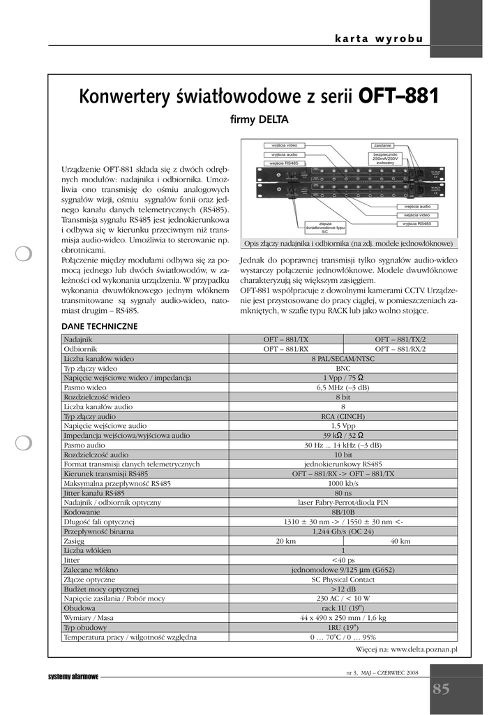 k karta wyrobu Konwertery światłowodowe z serii OFT–881 firmy DELTA m Urządzenie OFT-881 składa się z dwóch odrębnych modułów: nadajnika i odbiornika. Umożliwia ono transmisję do ośmiu analogowych sygnałów wizji, ośmiu sygnałów fonii oraz jednego kanału danych telemetrycznych (RS485). Transmisja sygnału RS485 jest jednokierunkowa i odbywa się w kierunku przeciwnym niż transmisja audio-wideo. Umożliwia to sterowanie np. obrotnicami. Połączenie między modułami odbywa się za pomocą jednego lub dwóch światłowodów, w zależności od wykonania urządzenia. W przypadku wykonania dwuwłóknowego jednym włóknem transmitowane są sygnały audio-wideo, natomiast drugim – RS485. Opis złączy nadajnika i odbiornika (na zdj. modele jednowłóknowe) Jednak do poprawnej transmisji tylko sygnałów audio-wideo wystarczy połączenie jednowłóknowe. Modele dwuwłóknowe charakteryzują się większym zasięgiem. OFT-881 współpracuje z dowolnymi kamerami CCTV. Urządzenie jest przystosowane do pracy ciągłej, w pomieszczeniach zamkniętych, w szafie typu RACK lub jako wolno stojące. DANE TECHNICZNE m Nadajnik Odbiornik Liczba kanałów wideo Typ złączy wideo Napięcie wejściowe wideo / impedancja Pasmo wideo Rozdzielczość wideo Liczba kanałów audio Typ złączy audio Napięcie wejściowe audio Impedancja wejściowa/wyjściowa audio Pasmo audio Rozdzielczość audio Format transmisji danych telemetrycznych Kierunek transmisji RS485 Maksymalna przepływność RS485 Jitter kanału RS485 Nadajnik / odbiornik optyczny Kodowanie Długość fali optycznej Przepływność binarna Zasięg Liczba włókien Jitter Zalecane włókno Złącze optyczne Budżet mocy optycznej Napięcie zasilania / Pobór mocy Obudowa Wymiary / Masa Typ obudowy Temperatura pracy / wilgotność względna OFT – 881/TX OFT – 881/RX OFT – 881/TX/2 OFT – 881/RX/2 8 PAL/SECAM/NTSC BNC 1 Vpp / 75 Ω 6,5 MHz (–3 dB) 8 bit 8 RCA (CINCH) 1,5 Vpp 39 kΩ / 32 Ω 30 Hz ... 14 kHz (–3 dB) 10 bit jednokierunkowy RS485 OFT – 881/RX -> OFT – 881/TX 1000 kb/s 80 ns laser Fabry-Perrot/dioda PIN 8B/10B 1310 ± 30 nm -> / 1550 ± 30 nm <1,244 Gb/s (OC 24) 20 km 40 km 1 <40 ps jednomodowe 9/125 µm (G652) SC Physical Contact >12 dB 230 AC / < 10 W rack 1U (19'') 44 x 490 x 250 mm / 1,6 kg 1RU (19") 0 … 70°C / 0 … 95% Więcej na: www.delta.poznan.pl nr 3, MAJ – CZERWIEC 2008 85