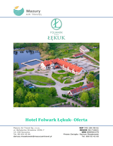 - Hotel Folwark Łękuk- Oferta Mazury Air Travel Sp. z o.o. ul. Bohaterów Września 1939r.7 12–100 Szczytno Tel. 89 624 45 84 [email protected] NIP 745-184-58-61 REGON 361716641 KRS 0000561279 Prezes Zarządu: Dariusz Mosakowski Tel. 600 02 42 65 Folwark Łękuk znajduje się w sercu Dzikich Mazur, w otulinie Puszczy Boreckiej nad urozmaiconym brzegiem jeziora Łękuk, gdzie według raportu Instytutu Ochrony Środowiska oddychamy najczystszym powietrzem w Polsce*. Tuż obok królują żubry (około 90 sztuk), których jest więcej niż mieszkańców Łękuka Małego (63 osoby). Pagórkowaty krajobraz przypomina małe Beskidy, a zasiedla go różnorodna fauna: 139 gatunków ptaków, w tym 128 objętych ścisłą ochroną gatunkową, 15 wilków oraz kilkaset rogatych jeleni, łosi i saren. Na fundamentach mazurskiego folwarku, w 2015 r. powstał stylowy hotel – Folwark Łękuk z 40 pokojami i 4 apartamentami. Stary Spichlerz, który działa nieco dłużej, oferuje 25 miejsc w komfortowych pokojach rodzinnych oraz klimatyczną salę kominkową (łącznie ponad 100 miejsc noclegowych). Architektura i wystrój obiektów nawiązują do przyrodniczego raju, w którym są zlokalizowane; dominują: drewno, cegła, kamień polny, kuty metal. W hotelu i na terenie znajdują się: klimatyzowana restauracja „Ogień i Woda” z tarasem i widokiem na jezioro (ponad 150 miejsc) strefa SPA „Łekuckie Łaźnie“ – 3 gabinety masażu i relaksu, pokój relaksu, łaźnia parowa, prysznic wrażeń sala fitness, siłownia centrum konferencyjne – 3 sale na ponad 220 osób boisko wielofunkcyjne, kort tenisowy, boisko do piłki plażowej bawialnia dla dzieci „Dubinek“, biblioteka dziecięca, gralnia dla młodzieży piaszczysta plaża z pomostami i kąpieliskiem 18 ha terenów rekreacyjnych – własny las, park ścieżka zdrowia o długości 2 km wzdłuż linii jeziora Mazury Air Travel Sp. z o.o. ul. Bohaterów Września 1939r.7 12–100 Szczytno Tel. 89 624 45 84 [email protected] NIP 745-184-58-61 REGON 361716641 KRS 0000561279 Prezes Zarządu: Dariusz Mosakowski Tel. 600 02 42 65 wypożyczalnia sprzętu wodnego (łódki, kajaki, rowery wodne, bojer) wypożyczalnia rowerów (ponad 20 sztuk), przyczepek, fotelikó dla dzieci wypożyczalnia sprzętu zimowego: nart biegowych i łyżew (łącznie ponad 50 par) plac zabaw i trampoliny złote pola rzepaku, gospodarstwo rolne (140 ha) i własna tłocznia oleju rzepakowego W Folwarku Łękuk proponujemy między innymi: urozmaicone pakiety pobytowe – rocznie ponad 30 opcji organizację imprez firmowych z noclegiem do 110 osób organizację wesel do 180 osób warsztaty taneczne, kulinarne, teatralne, kuglarskie, plastyczne zajęcia sportowe, fitness, tabata questy terenowe, gry integracyjne dla rodzin wyprawy rowerowe po pagórkach Mazur Garbatych (kilkadziesiąt km tras) spływy kajakowe dziewiczą Łaźną Strugą (100 km rzeki) trasy biegowe zorganizowane wizyty w Eko-gospodarstwie, w rezerwacie żubrów nordic walking łódki dla wędkarzy zimą: kuligi i lodowisko Folwark*** oferuje apartamenty, komfortowe pokoje 2osobowe oraz studio rodzinne również z widokiem na jezioro. Stary Spichlerz oferuje pokoje 2, 3 – osobowe i jeden apartament. Wszystkie pokoje mają własne łazienki. Kuchnia Folwarku bazuje na miejscowych produktach, w tym świeżych rybach, warzywach i owocach z własnego ogródka, miejscowych serach zagrodowych, własnym oleju rzepakowym tłoczonym na zimno. Mazury Air Travel Sp. z o.o. ul. Bohaterów Września 1939r.7 12–100 Szczytno Tel. 89 624 45 84 [email protected] NIP 745-184-58-61 REGON 361716641 KRS 0000561279 Prezes Zarządu: Dariusz Mosakowski Tel. 600 02 42 65 Folwark Łękuk to miejsce sprawdzone na imprezę rodzinną, aktywne wakacje, weekendowy pobyt we dwoje czy odnowę duszy i ciała w strefie SPA (animatorzy zajmą się maluchami). Obiekt jest całoroczny, a każdy sezon daje inne możliwości. Specjalne ceny (brutto) dla grupy: Ceny za nocleg ze śniadaniem w PLN na osobę Osoba w pokoju dwuosobowym Sezon wiosna/lato 2017 428 zł cena za cały pakiet od osoby (3 dni) Osoba w pokoju jednoosobowym – dopłata 35 zł/nocleg Sobota – Rejs statkiem Chopin z obiadem (2,5 h) – 130,00 zł W ramach pakietu: 2*śniadanie, 2*uroczysta kolacja, internet WiFi, łaźnia parowa (10 os. na 1 h seansu), jacuzzi zewnętrzne (5 os. na 1 h seansu), monitorowany parking, pomosty, plaża, park i ścieżka zdrowia, biblioteczka, wypożyczalnia gier, bawialnia Dubinek Zapraszamy do skorzystania z naszej oferty wypoczynku dla grup zorganizowanych Mazury Air Travel Mazury Air Travel Sp. z o.o. ul. Bohaterów Września 1939r.7 12–100 Szczytno Tel. 89 624 45 84 [email protected] NIP 745-184-58-61 REGON 361716641 KRS 0000561279 Prezes Zarządu: Dariusz Mosakowski Tel. 600 02 42 65